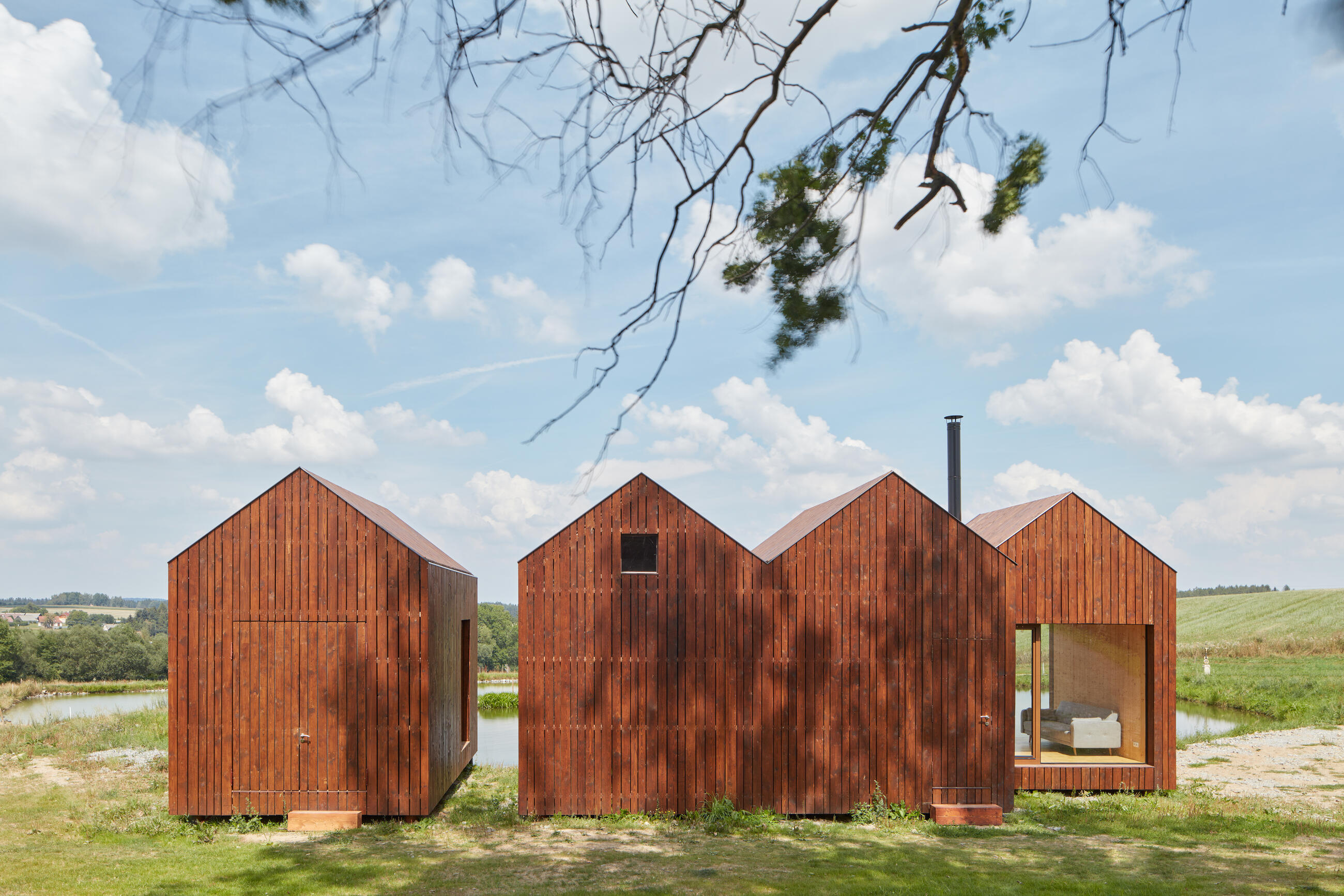 Inspired by traditional fisherman´s cabins, we designed a small cabin on a bank of a pond, which is surrounded by a picturesque scenery. Its size is limited by the legislation. The maximum built-up area 50 m2 and the maximum height of 5 m require a special ground-plan solution for a family holiday house. The object consists of four small masses, three of which are connected and one separated, standing nearby. The central space is accessed by a minimal entrance through the kitchen, which also has a built in component of a rather small attic space intended to be a sleeping space for children. The kitchen offers a beautiful view of the water surface, as well as the bedroom, while the living space also opens up in the other direction, to the sunlit scenery of mature oaks. The individual separated object serves as a storage space with a covered porch suitable for drying fisherman´s nets or just silent contemplation surrounded by natural beauty.
