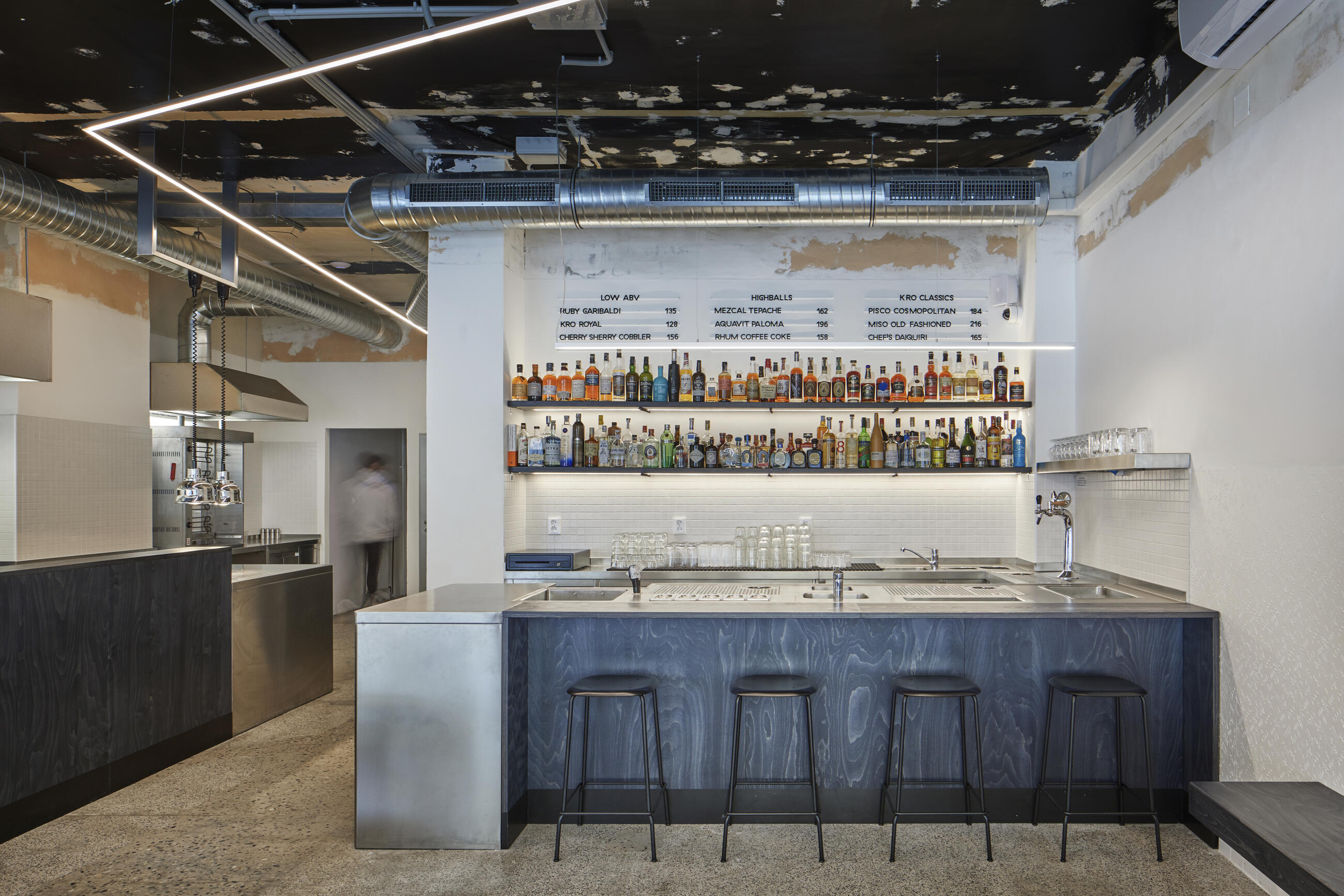 Kro Bistro & Bar follows the original concept of Kro Kitchen - haute cuisine street food - which is expanded by a sophisticated bar. The layout gives the relaxed vibe and guests can sit by both of the dominating counters to observe the process of making drinks and meals.