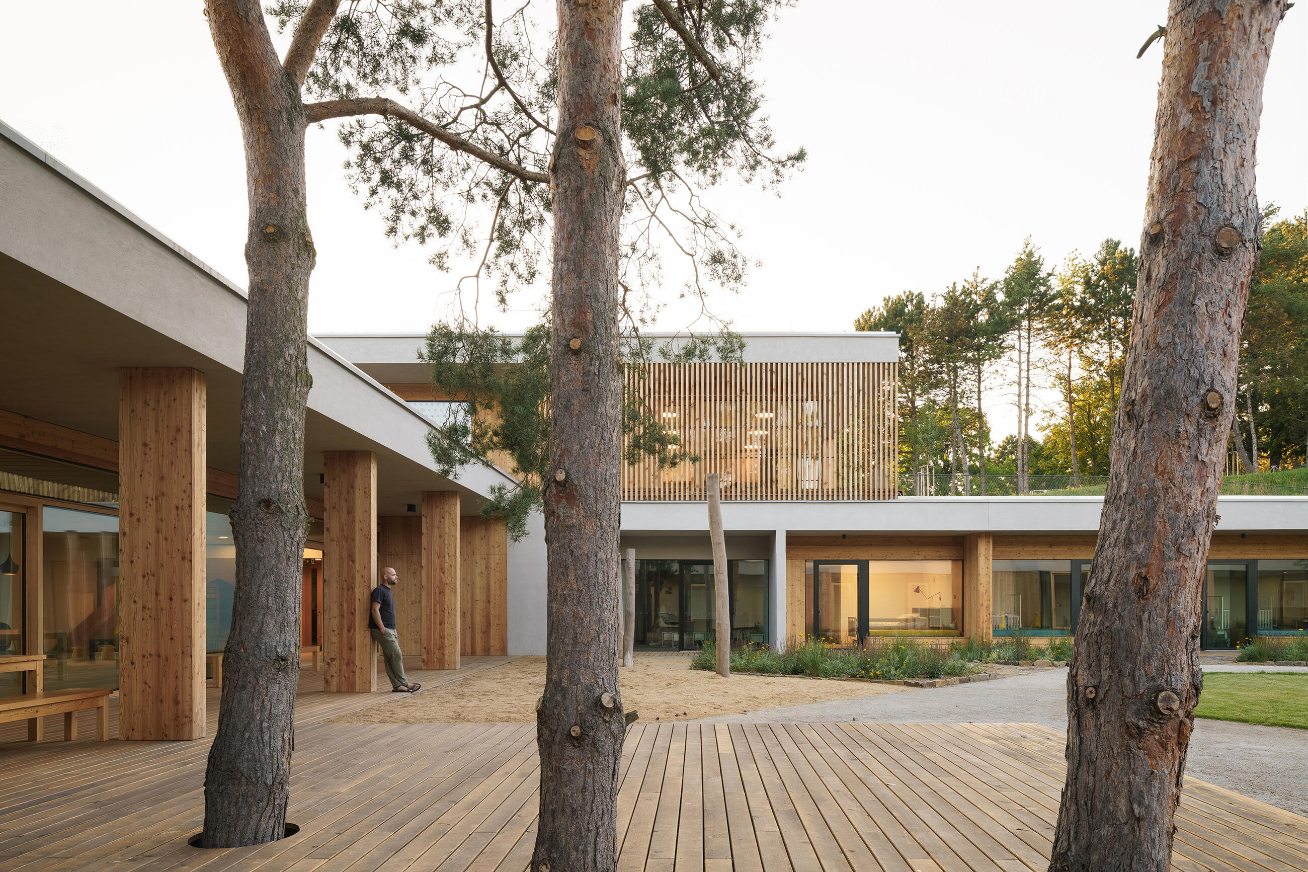 Inner peace, acceptance, humility and harmony. These are the emotions we aimed to incorporate into the design of the children’s hospice. Despite its size, is quite discretely set into the surrounding area. It is placed into the natural amphitheatre of the original park and oriented towards a protected inner courtyard with preserved mature trees. All the children’s rooms and the communal spaces are oriented towards this atrium with views of greenery and even a small pond. We also designed a viewing walkway on the roof leading to a meditation spot at the top of the hill. From the parents‘ rooms on the upper floor, you can access it at any time - day or night.