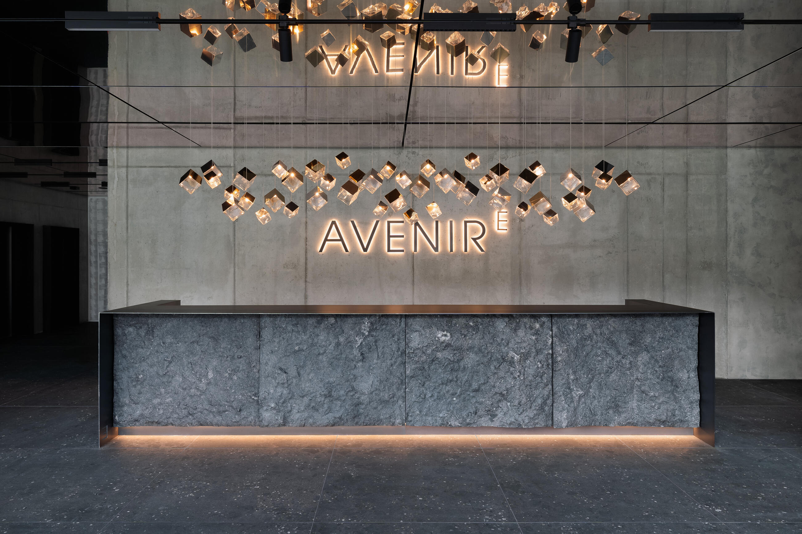 The entrance lobby of one of the buildings of Avenir Business Park in Prague connects the interior with the exterior through its open layout and natural materials like raw stone, metal, glass, and wood. Combining these elements forms a harmonious transition between the human-made environment and the natural world.