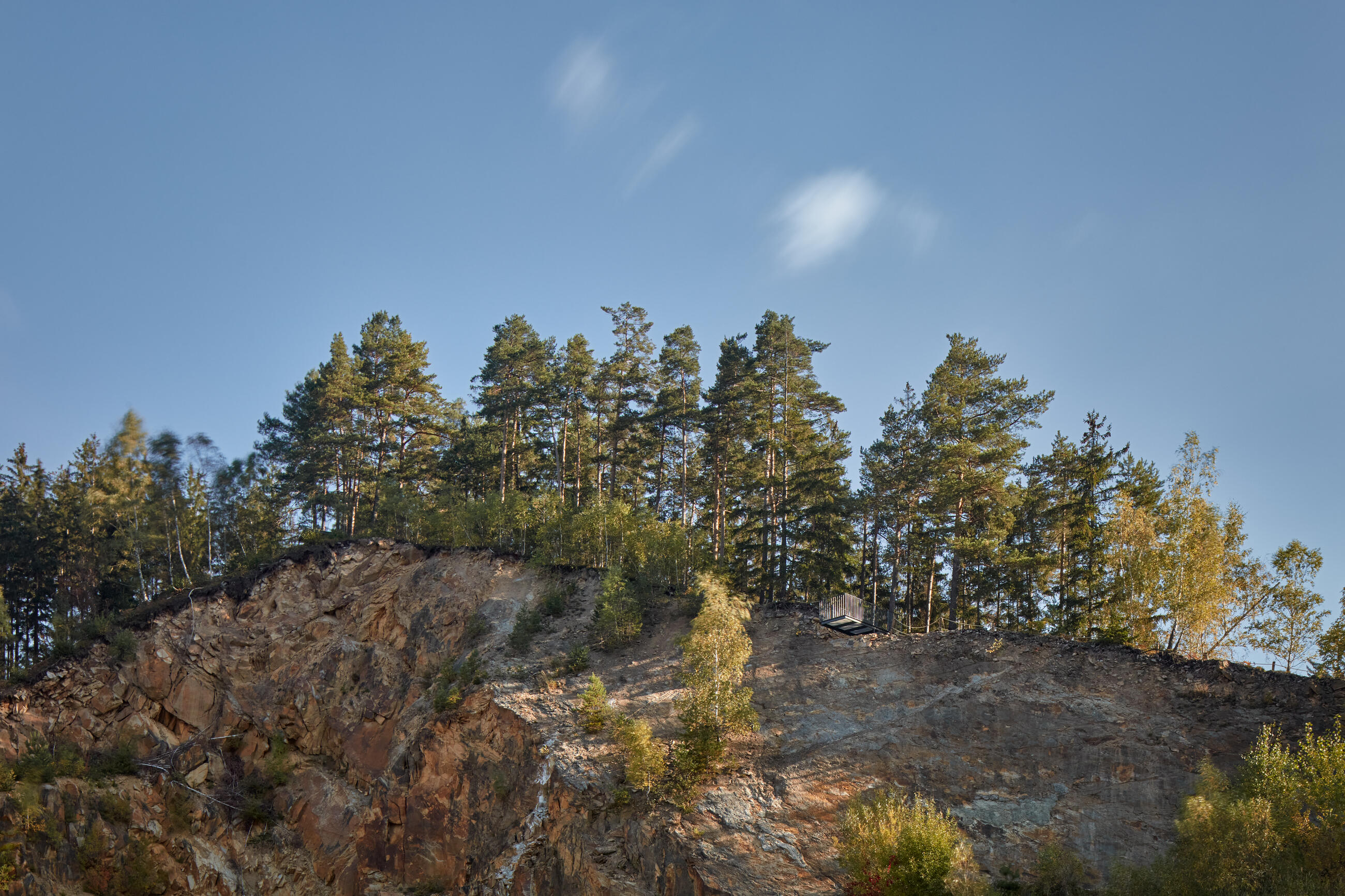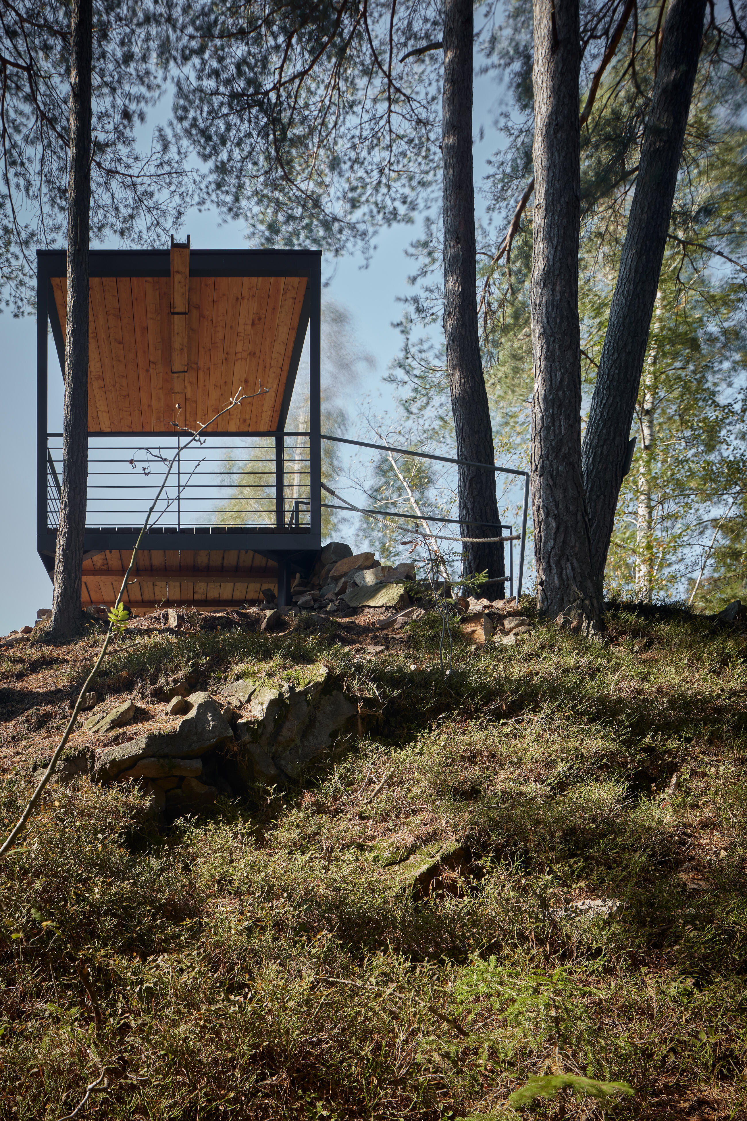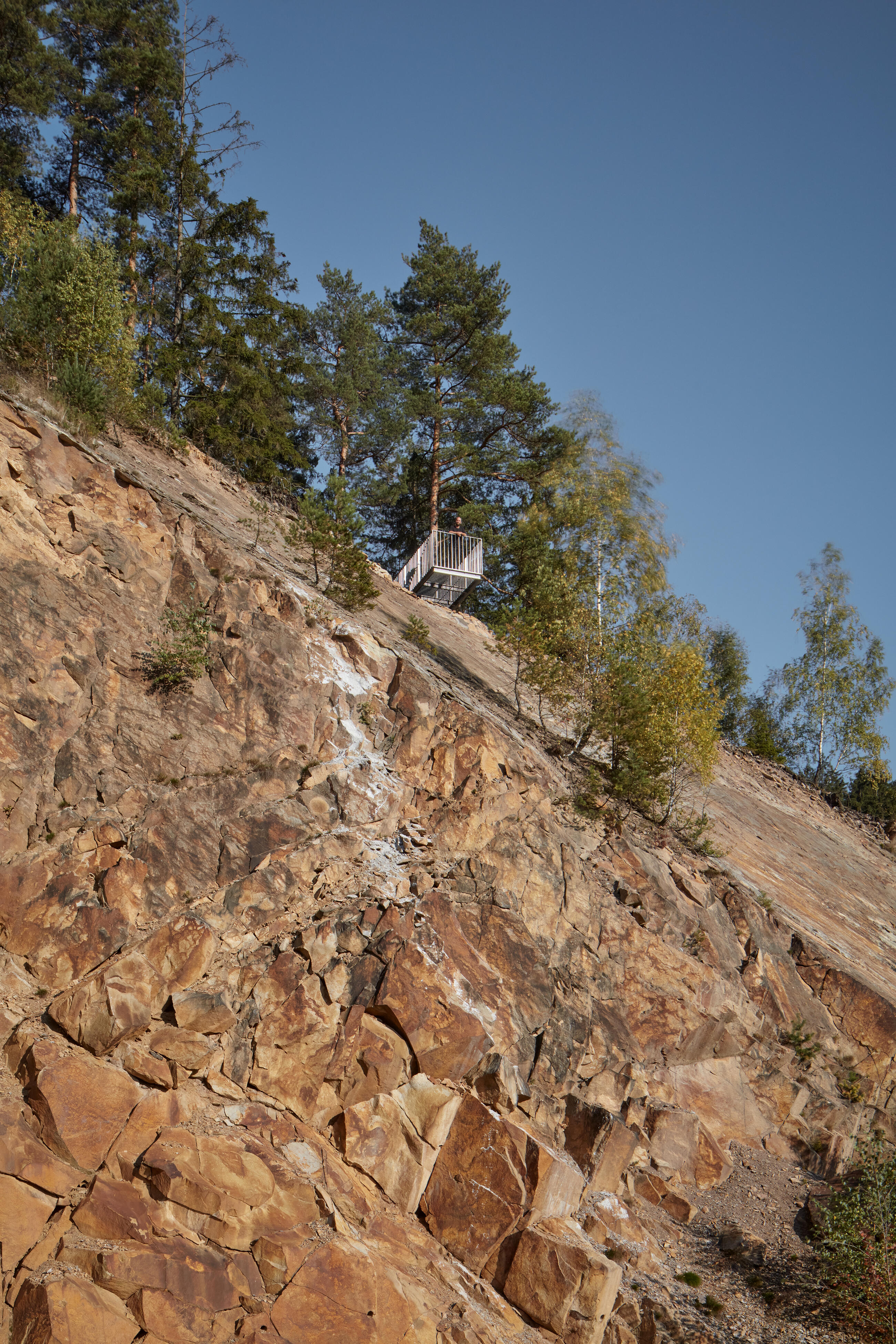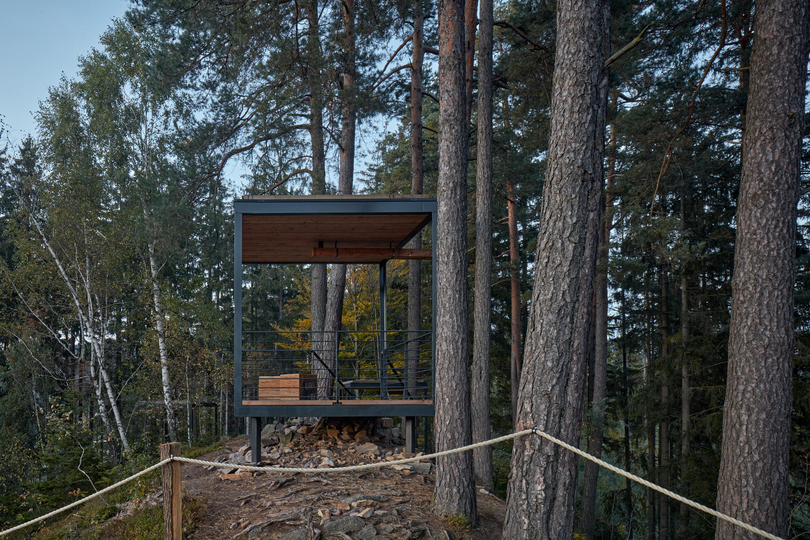Cílem je vrcholová část kopce. Z dramatického terénu zde vyrůstají tři vyhlídkové objekty, tři subtilní prázdné krychle. Objekty jsou jemně umístěné do stávající terénní modelace mezi balvany. Terén nemají narušit. Jsou jen jakýmsi architekturou vymezeným volným prostorem, který má vybízet k zastavení a spočinutí uprostřed lesa. Hlavní vyhlídka je umístěna přímo na vrcholu a umožňuje výhled přes lomovou stěnu do okolní krajiny luk a strání. Zbylé dva vyhlídkové body jsou zamýšleny jako místa pro pobyt, zamyšlení a posezení při pohledu do interiéru lesa, na jedné straně smrkového, na druhé borového.