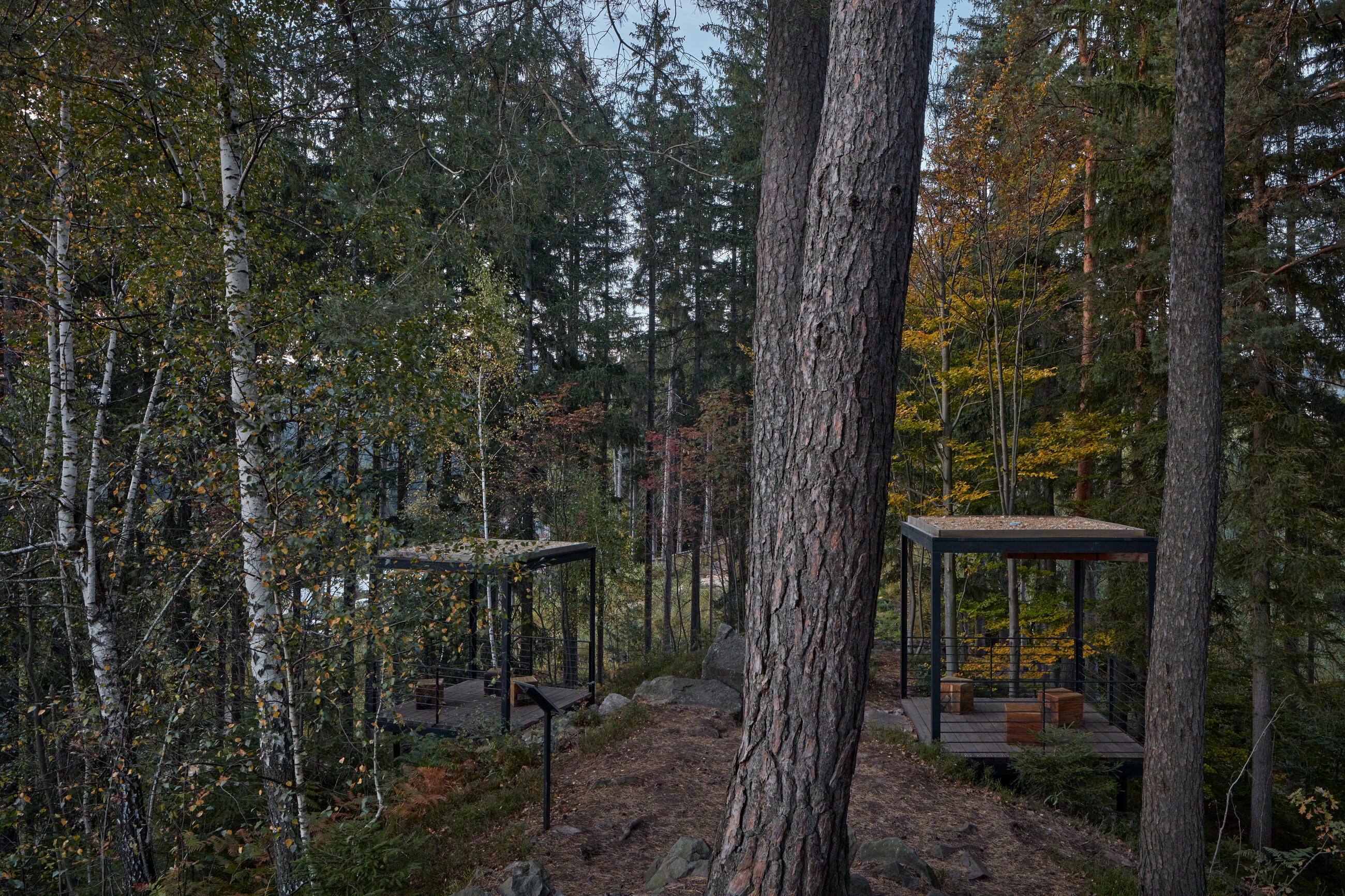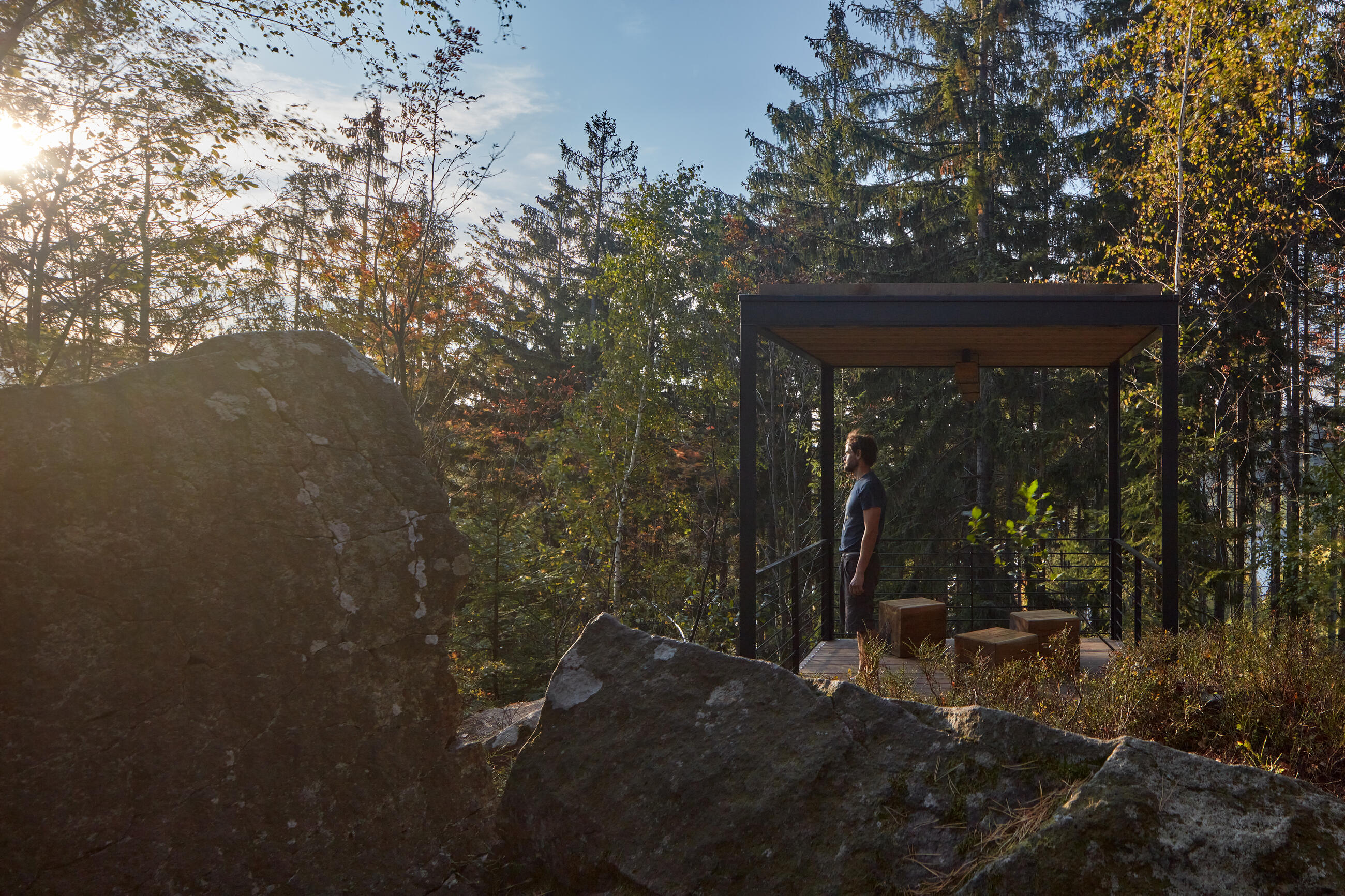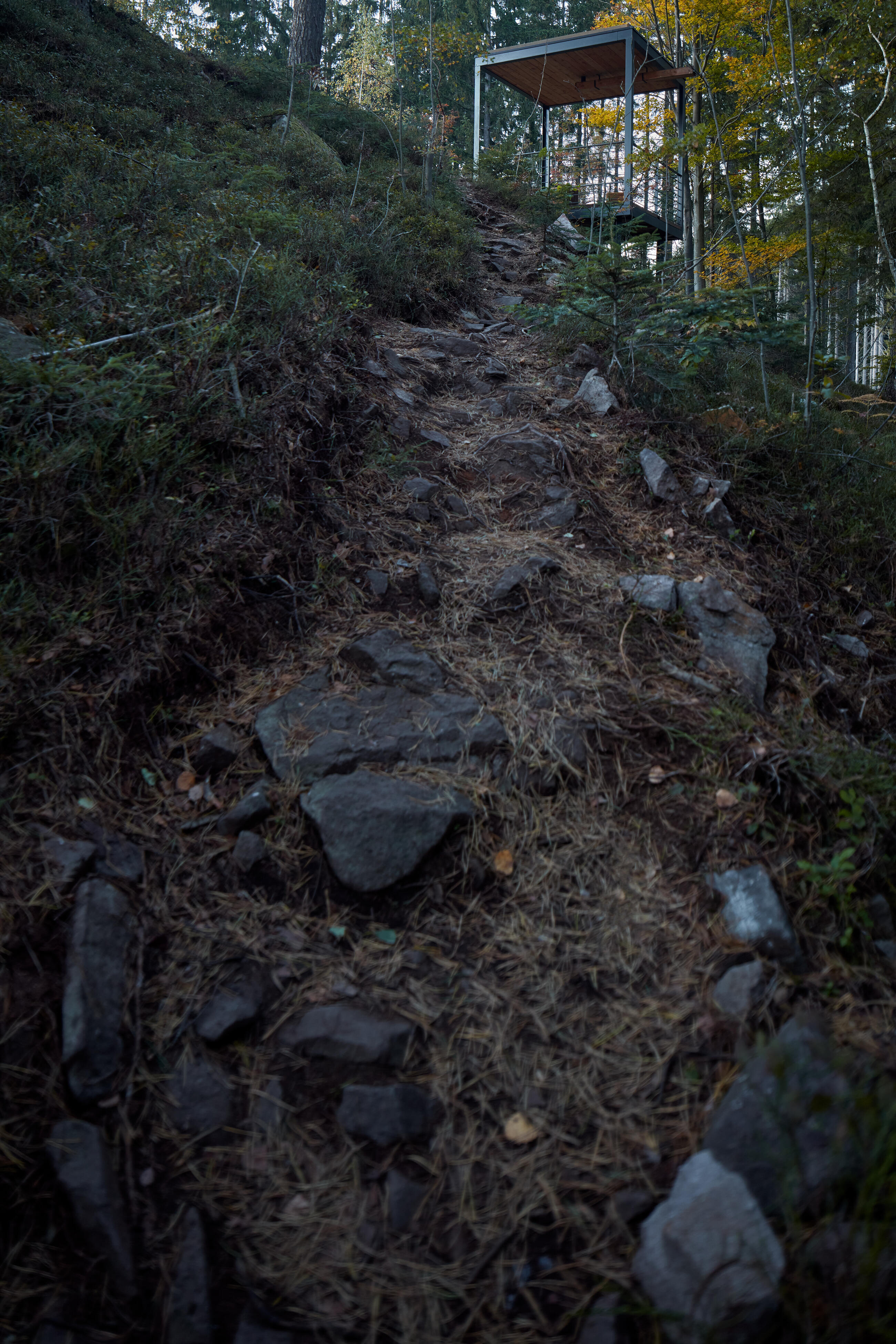 Cílem je vrcholová část kopce. Z dramatického terénu zde vyrůstají tři vyhlídkové objekty, tři subtilní prázdné krychle. Objekty jsou jemně umístěné do stávající terénní modelace mezi balvany. Terén nemají narušit. Jsou jen jakýmsi architekturou vymezeným volným prostorem, který má vybízet k zastavení a spočinutí uprostřed lesa. Hlavní vyhlídka je umístěna přímo na vrcholu a umožňuje výhled přes lomovou stěnu do okolní krajiny luk a strání. Zbylé dva vyhlídkové body jsou zamýšleny jako místa pro pobyt, zamyšlení a posezení při pohledu do interiéru lesa, na jedné straně smrkového, na druhé borového.