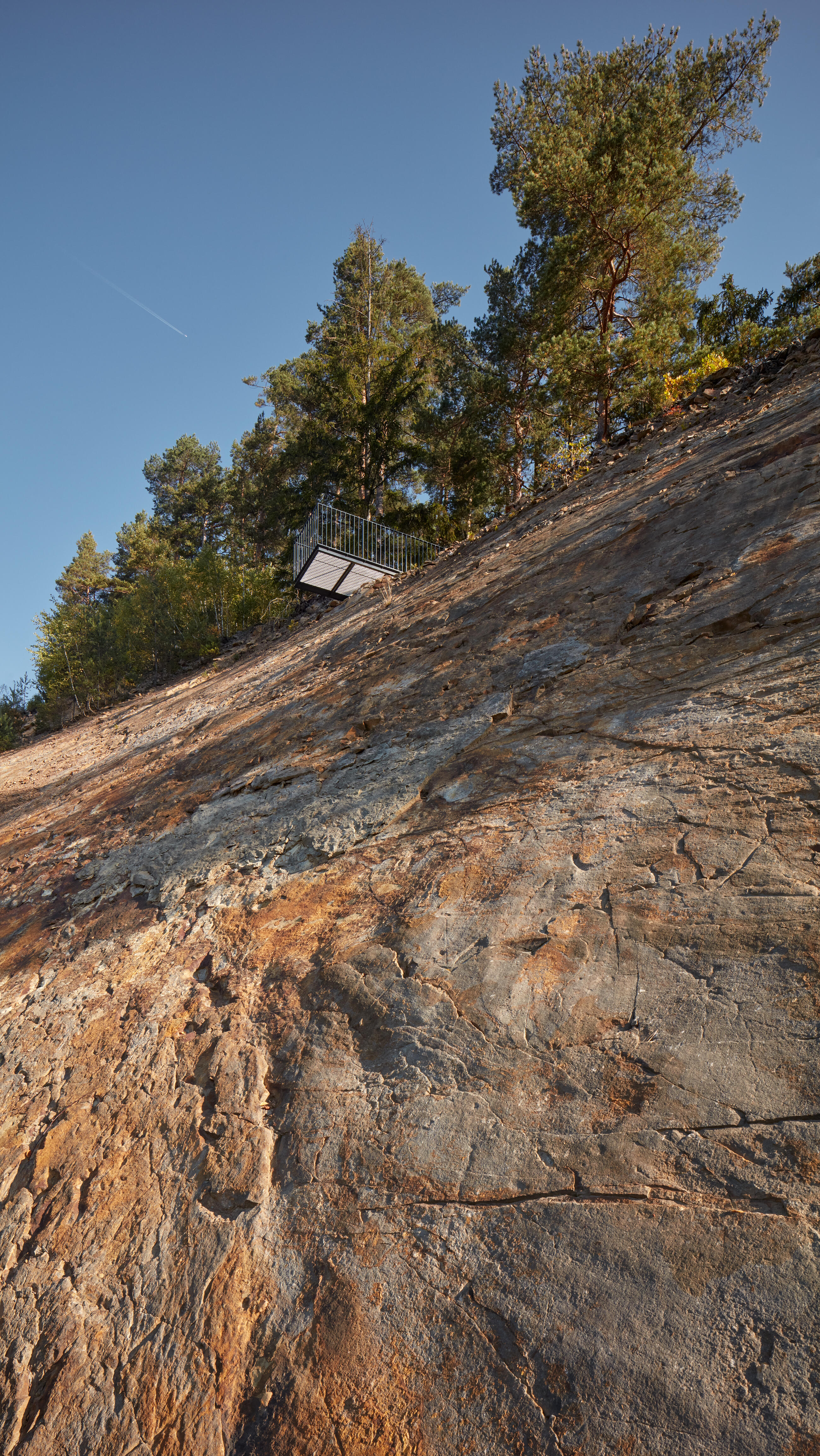 Strmější trasa vede kousek za korunou lomu. V polovině horní lomové hrany, která je stabilní, je umístěna vykonzolovaná kovová vyhlídková lávka s podlahou z pororoštu, který umocní dojem z výhledu a navodí jemné chvění. Malá vyhlídka je odpočinkovým mezibodem při výstupu prudkým svahem a zároveň návštěvníkům zpřístupňuje přímý pohled na stěnu lomu, kde nyní probíhá přirozený sukcesivní proces.