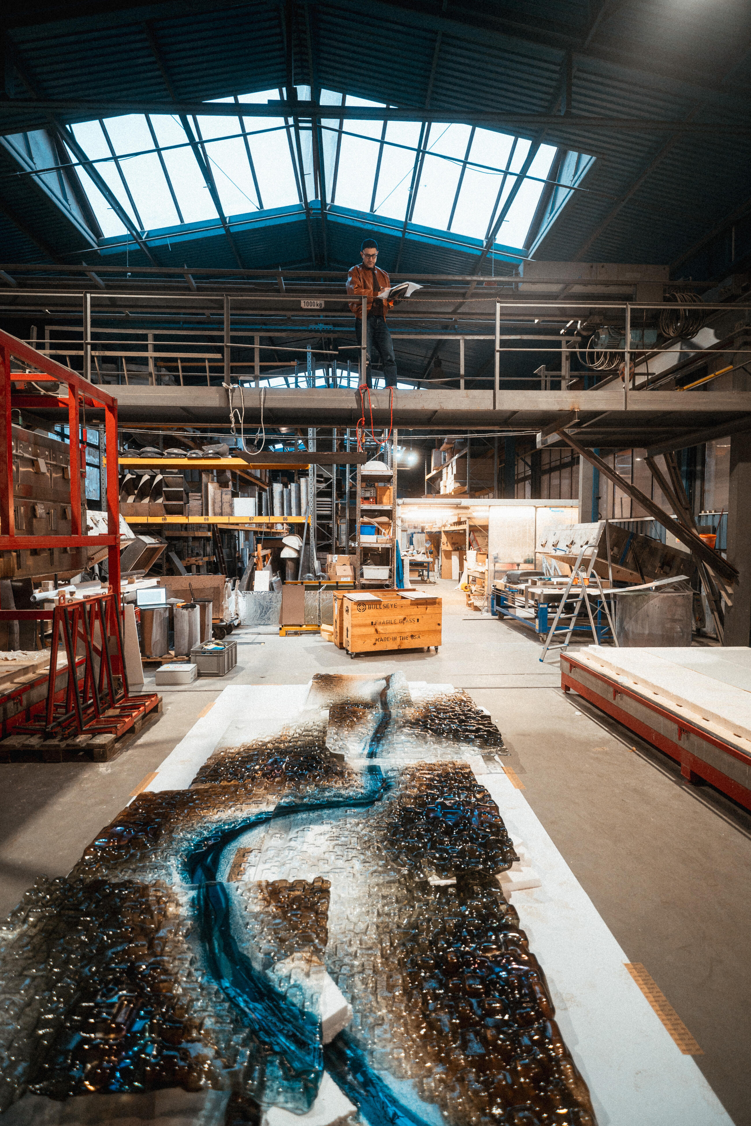 He initially collaborated with Kolektiv on material and process sampling; the work was ultimately realized with TGK technologists under the Lasvit Fusion umbrella. The kiln-formed glass—combining frits (crushed glass) with full sheets of Bullseye material—was calibrated so that the interpenetration of individual components would evoke a geological cross-section through a three-dimensional effect.