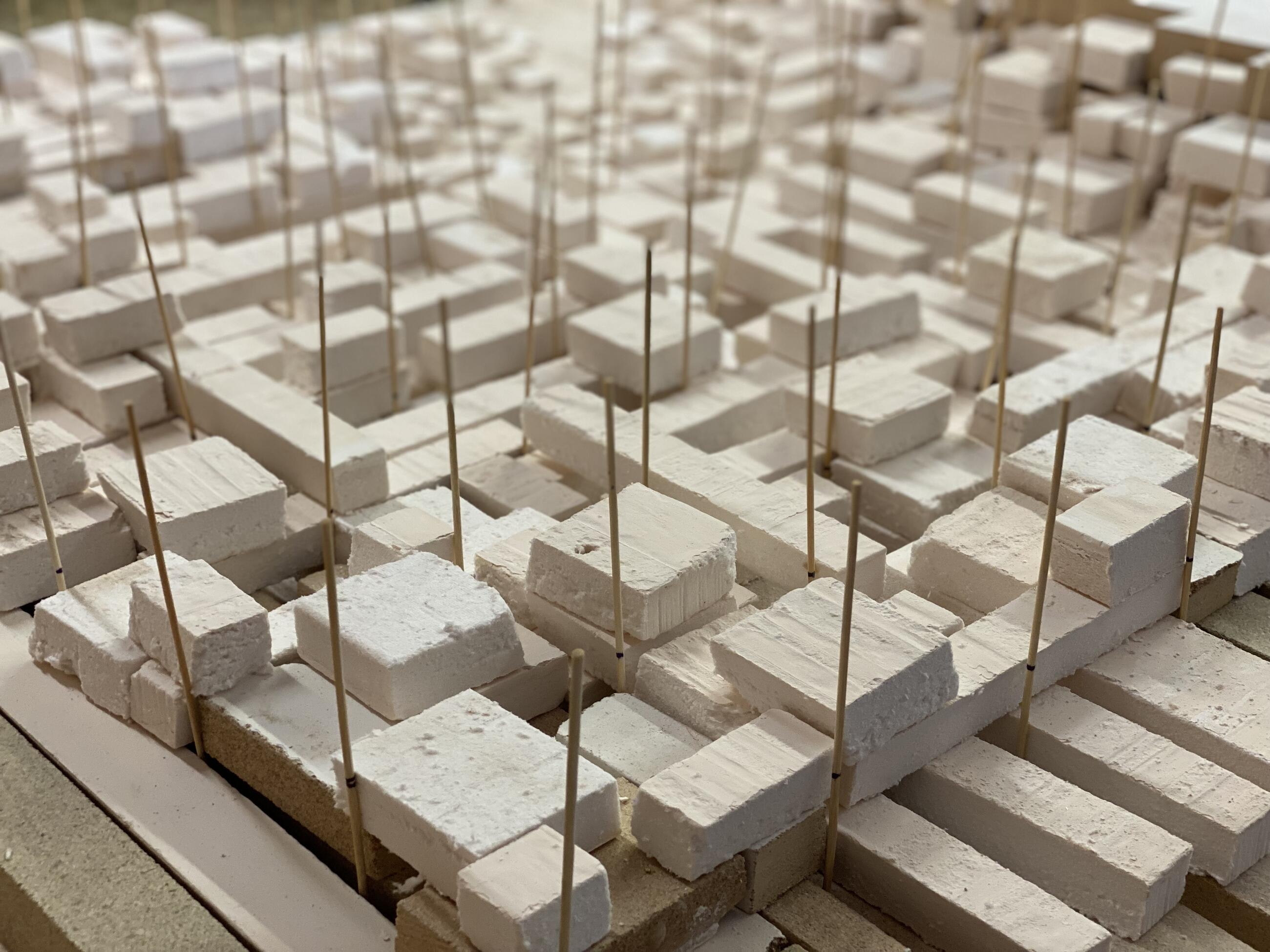 Although machine-milled moulds are typically used for kiln-formed glass of this scale, Matěj prepared his by hand. “There’s a certain irregularity in drawing that gives the work organic quality and vitality—and that would be dulled by machinery. I transferred the point grid of the topographic situation into 10 × 10 cm segments and assembled the entire sculpture cube by cube by hand. Adhering to the topographic grid ensured that the individual parts truly connect through their layers,” he explains, describing the time-consuming and meticulous process of making the moulds.