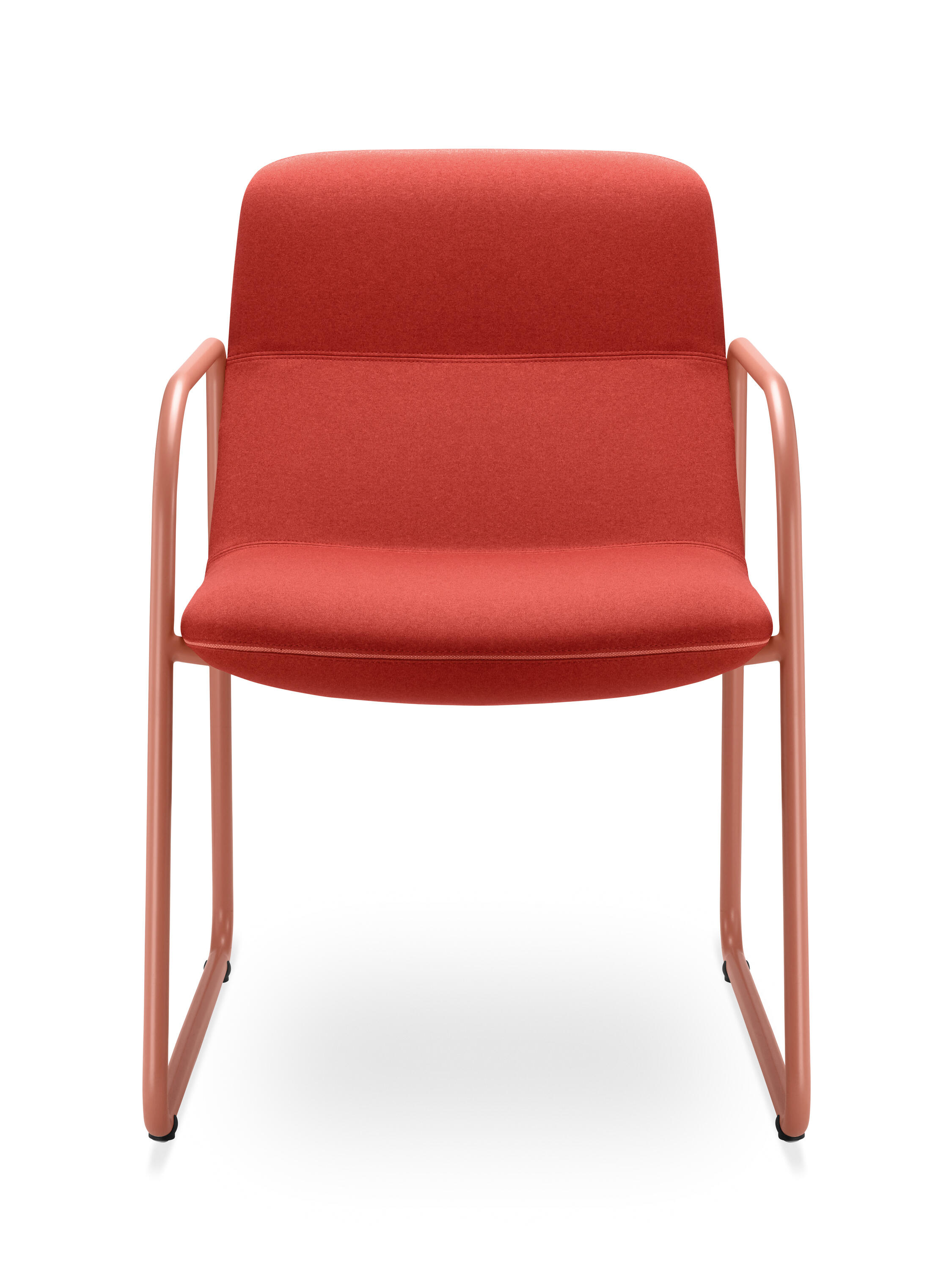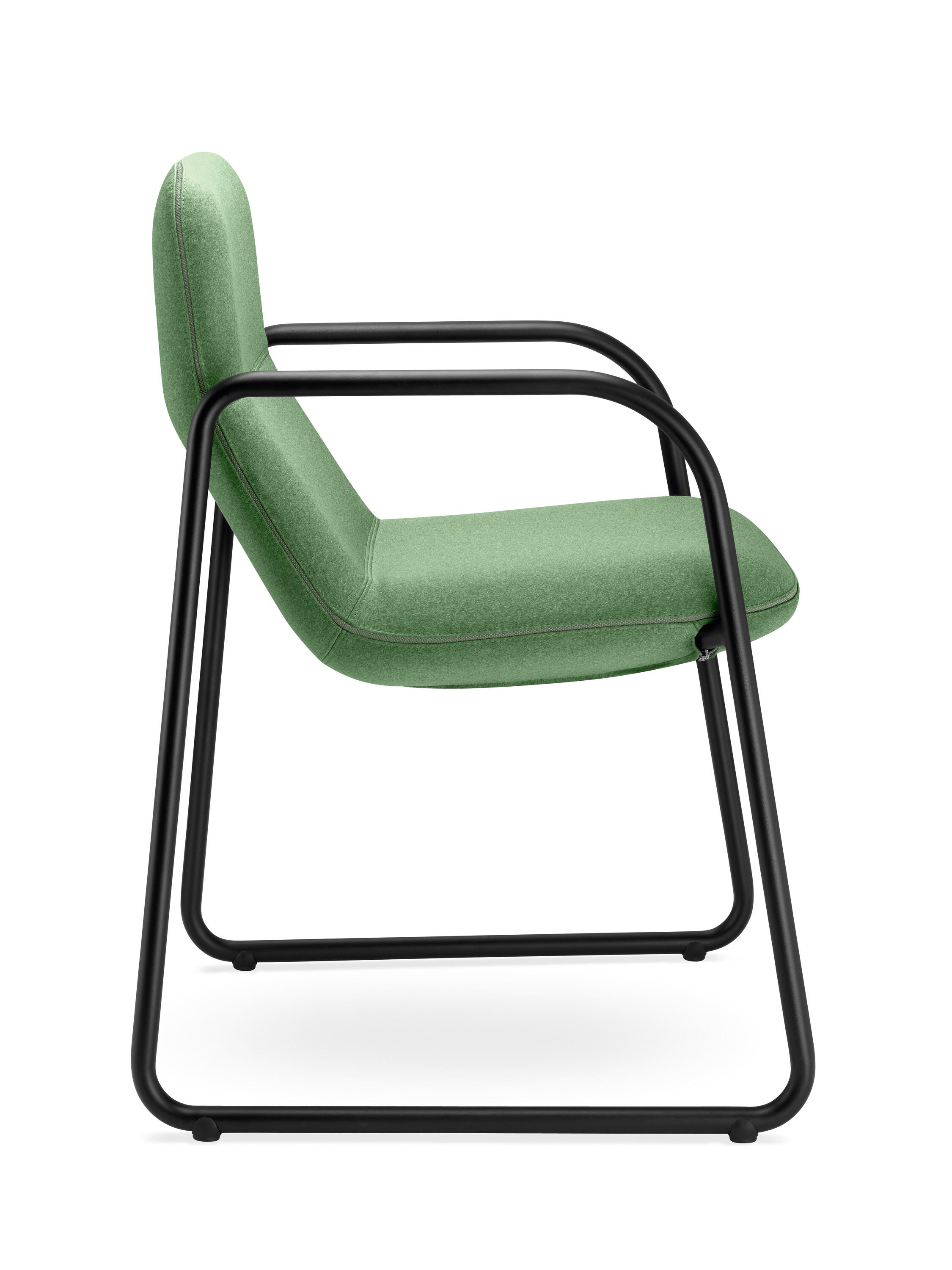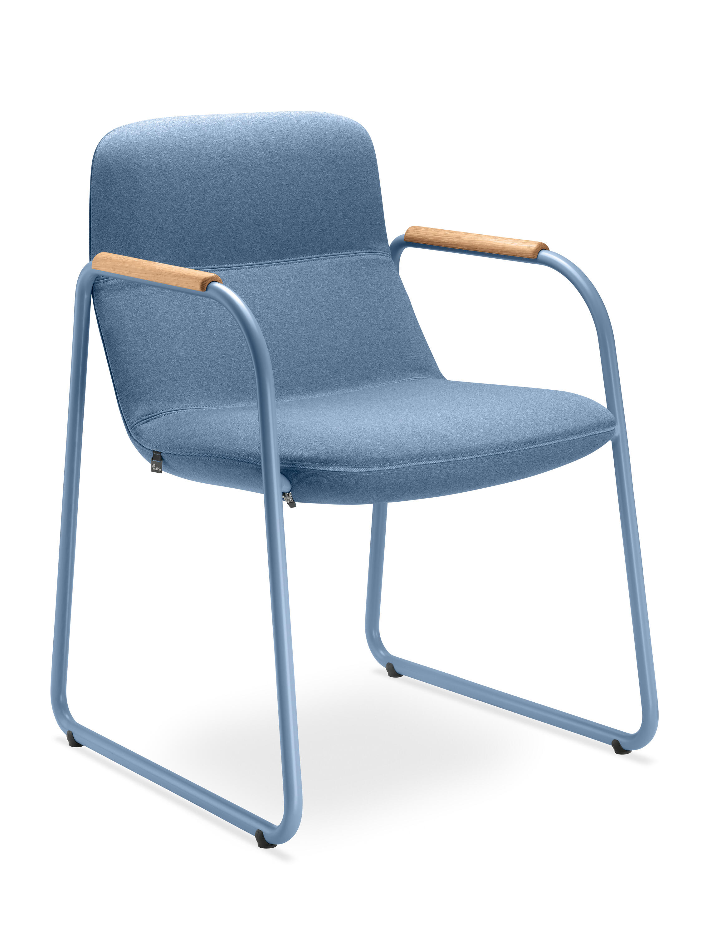 The design also emphasises versatility – eight frame colour options, a wide range of upholstery fabrics, and a stylish contrasting piping detail allow it to seamlessly fit into office interiors, hotel lobbies, cafés, or public spaces. The chair is produced entirely in the Czech Republic, with a focus on durability and the possibility of reupholstery.