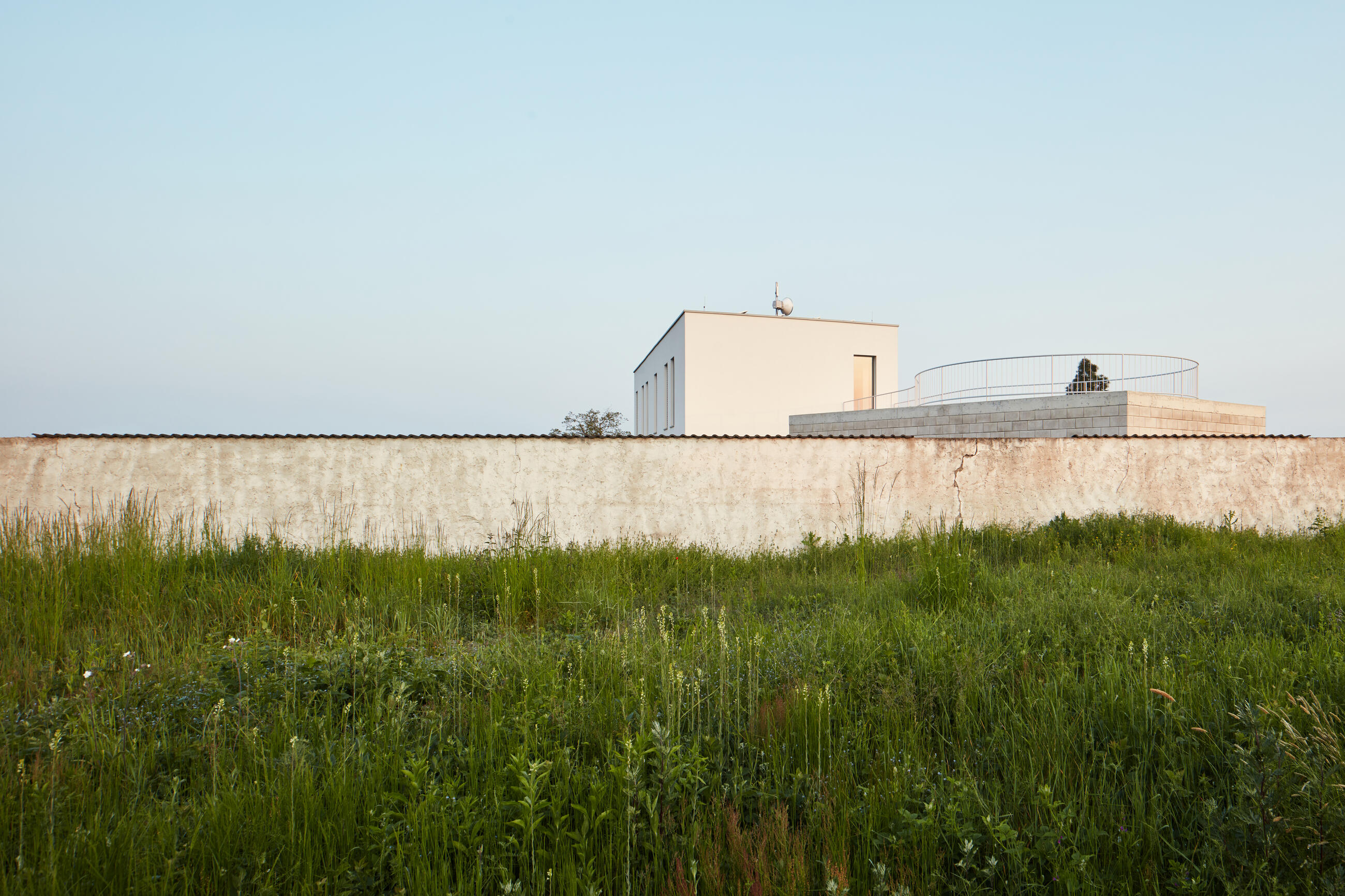 The house with a bridge serves a young family with two children who wanted elegant, bright, and not-groundfloor living. The building programme confirmed the current standard of family houses for the (upper) middle class. What was exceptional, however, was the site: a beautiful plot of land out of the context of a standard banal colony that is slowly growing on the outskirts of a central Bohemian village. The plot is situated at the top of a south-facing slope, provides fantastic views of the countryside, and is bordered only by a road, or rather a distinctive high wall separating mature greenery.