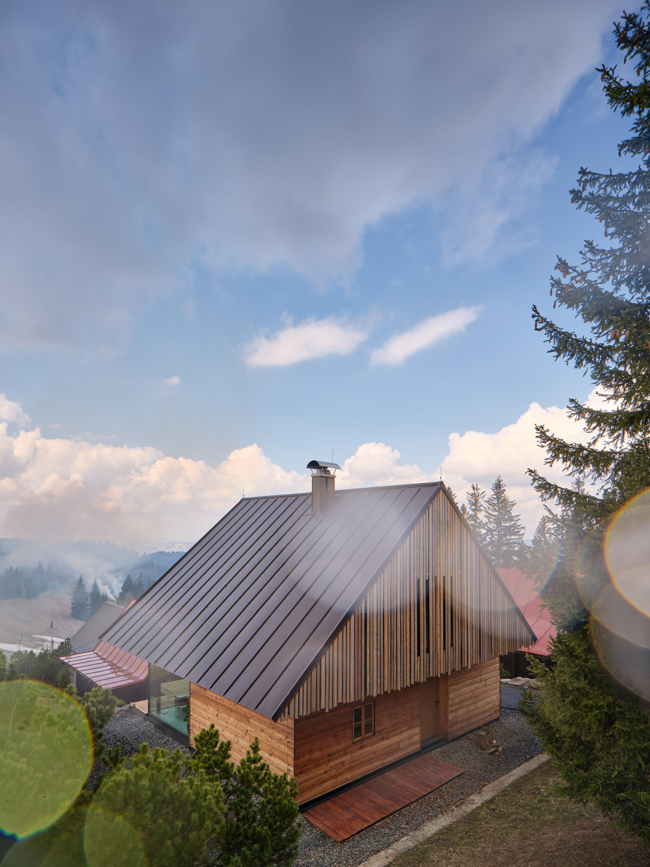 Log construction with a saddle roof located on a sloping terrain blends into the surrounding landscape. The design employs traditional architectural elements such as small casement windows, a pronounced roof overhang and pitch, while avoiding dormers and skylights. The eastern side carries the traditional appearance of a Wallachian log cabin, complemented on the western side with large-format glazing that opens views through several valleys.