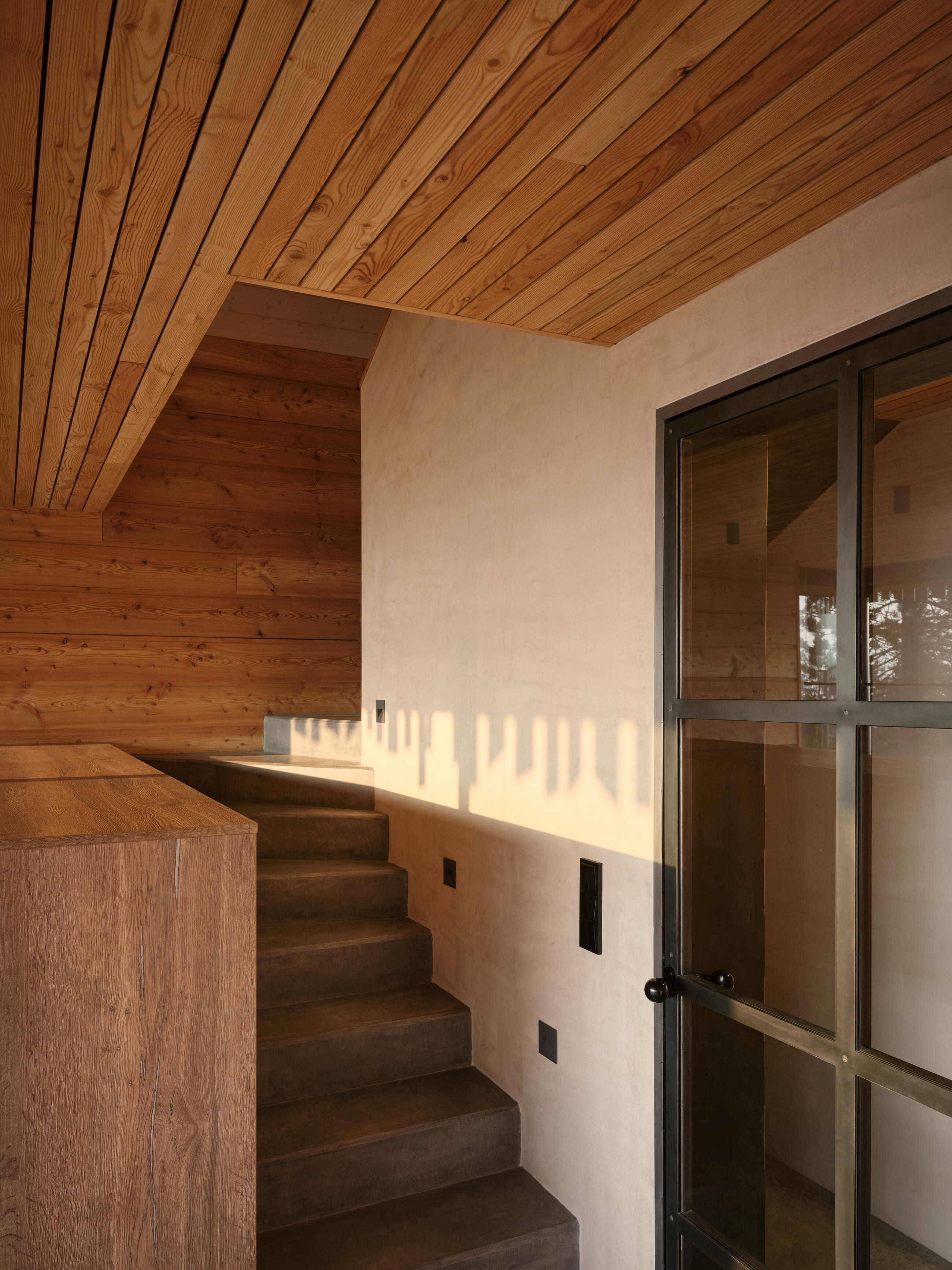 The entire house is designed as a timber structure made from prefabricated sandwich panels, which were manufactured in the valley and assembled on-site in a single day. The building meets low-energy standards. It efficiently harnesses passive solar energy and is heated exclusively via a heat pump connected to underfloor heating. In winter, sunlight warms the interior even at low temperatures; while in summer, the pronounced roof overhang prevents overheating, eliminating the need for air conditioning. The combination of modern technologies and natural principles ensures a comfortable indoor climate throughout the year.