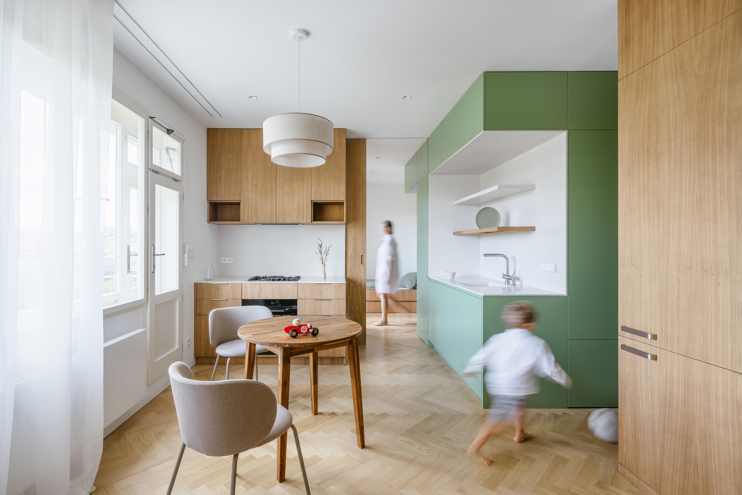 Located on the top floor of a First Republic building in a functionalist style in Prague's Vinohrady, this 52.8 m² apartment surprises with its sense of space and flexibility. Thanks to its orientation to two cardinal directions and direct connection to terraces, the interior is filled with natural light throughout the day, creating an airy and open atmosphere.
