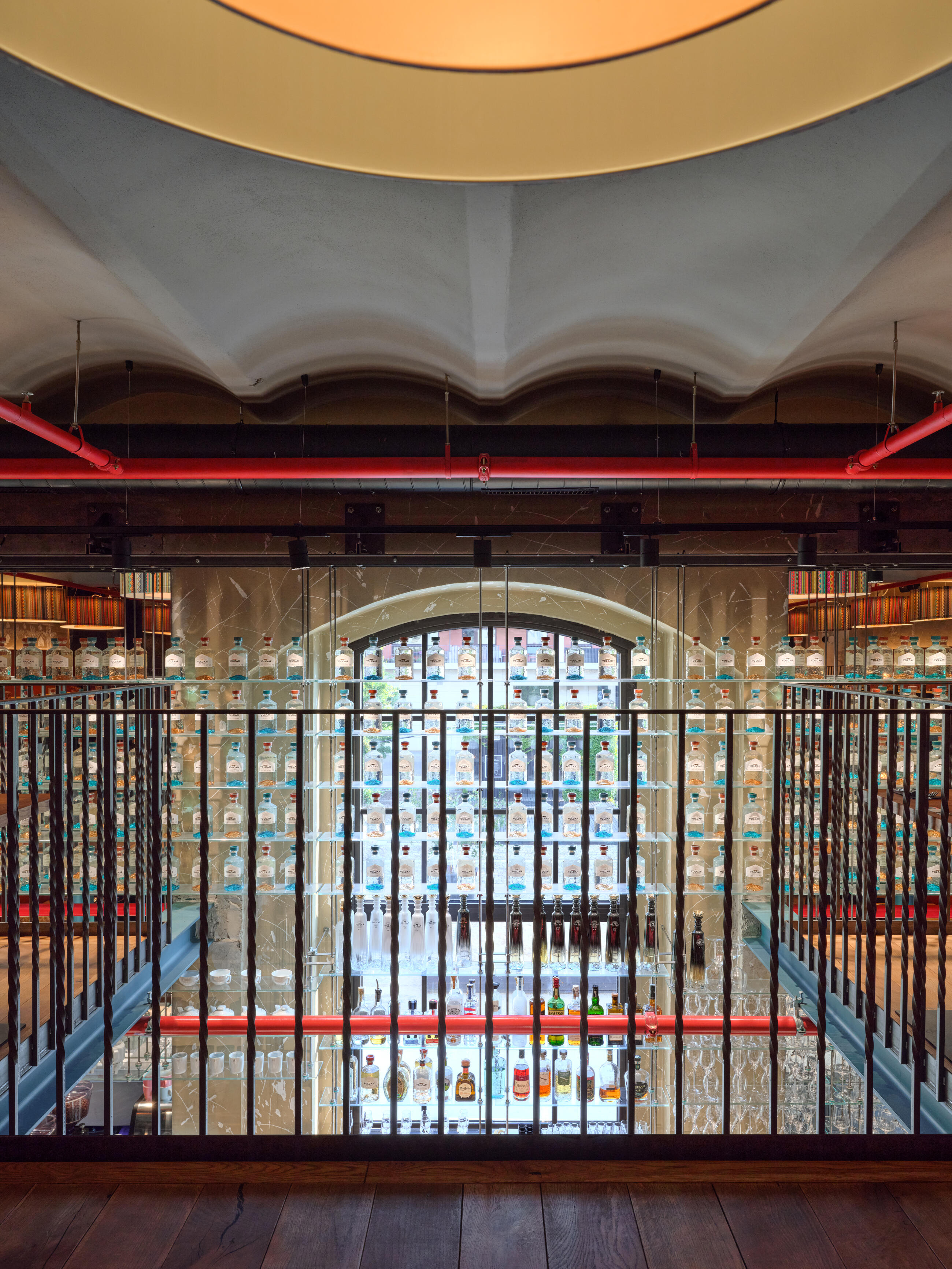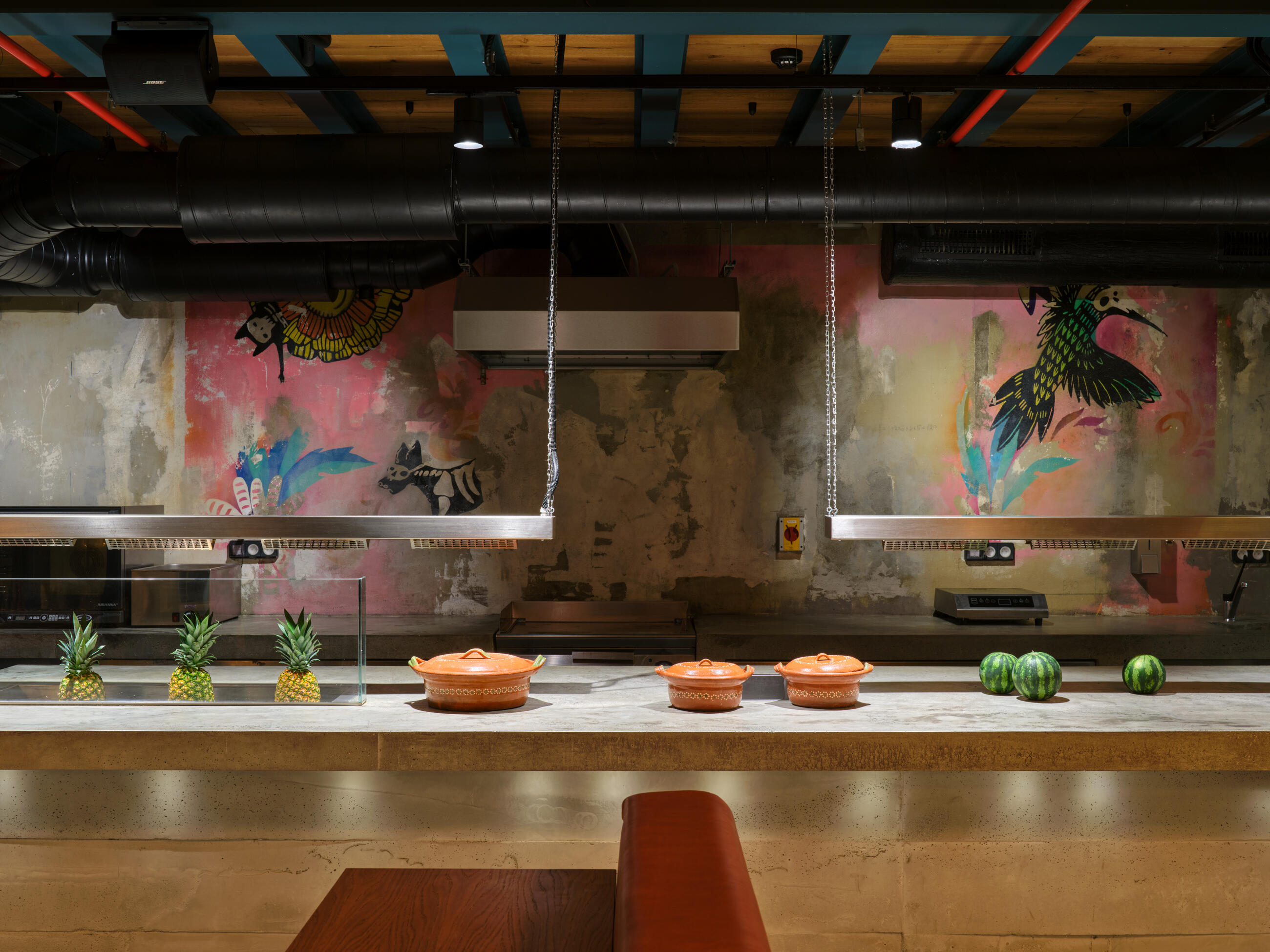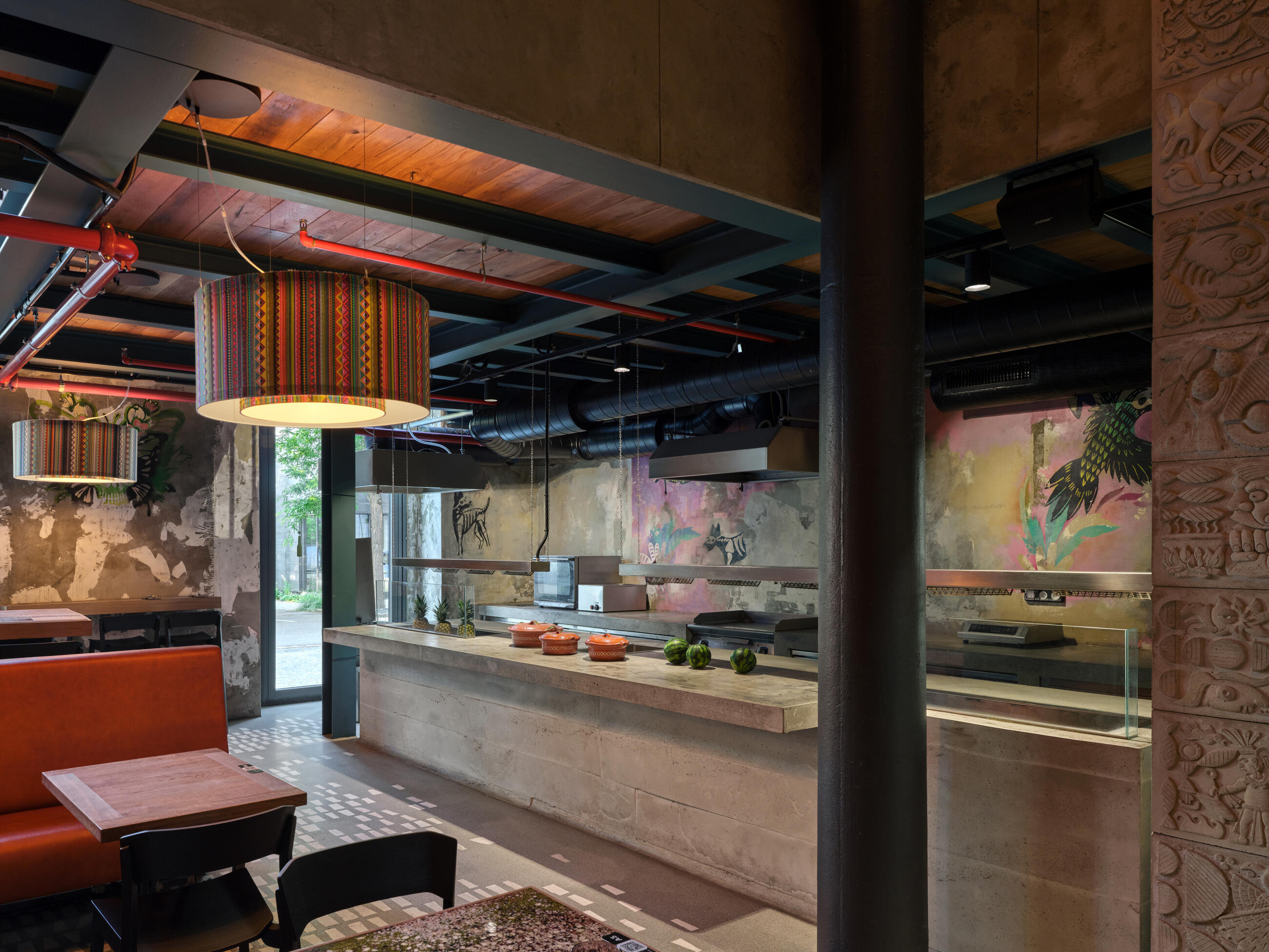 Another unusual and interesting feature is the blending of the restaurant space with the kitchen, where tortillas are baked, tacos are prepared, and dishes are grilled and cooked in a wood-fired oven right before the guests' eyes. Ceviche is prepared in the fish tank section, with the individual ingredients almost within reach. The kitchen, like the large cocktail bar upstairs, has an authentic design and material solution, including a beverage display case that extends over the bar to another gallery.