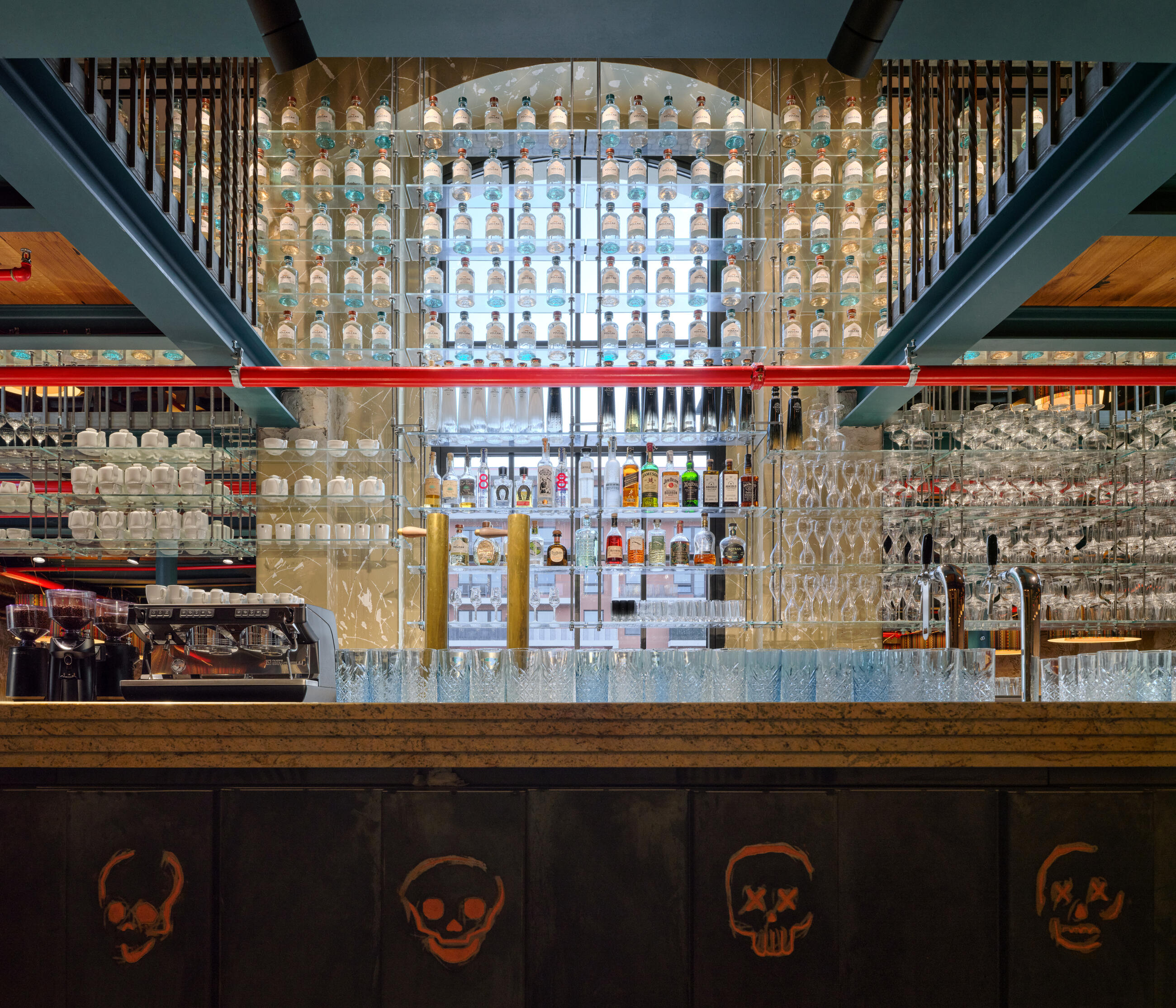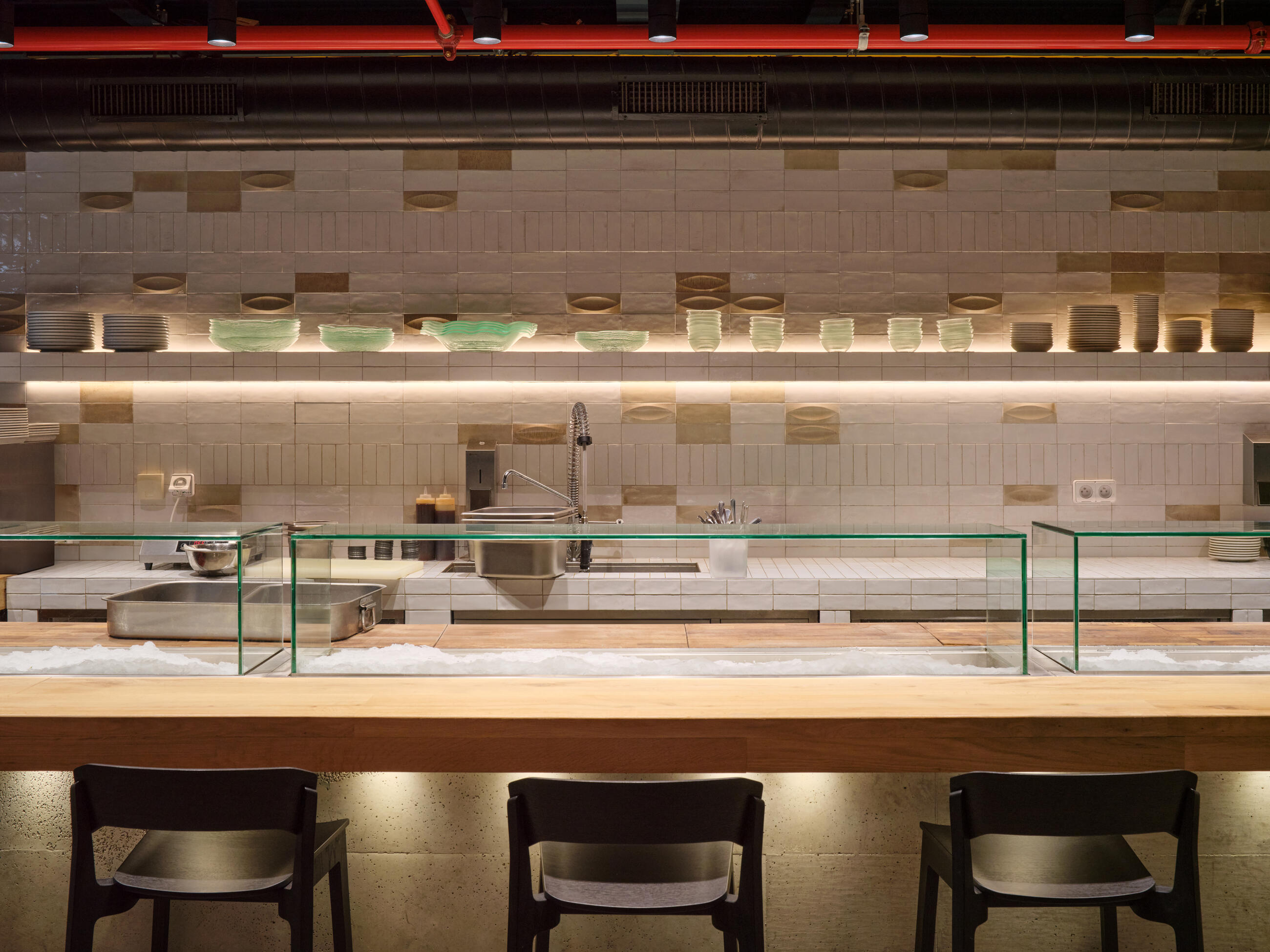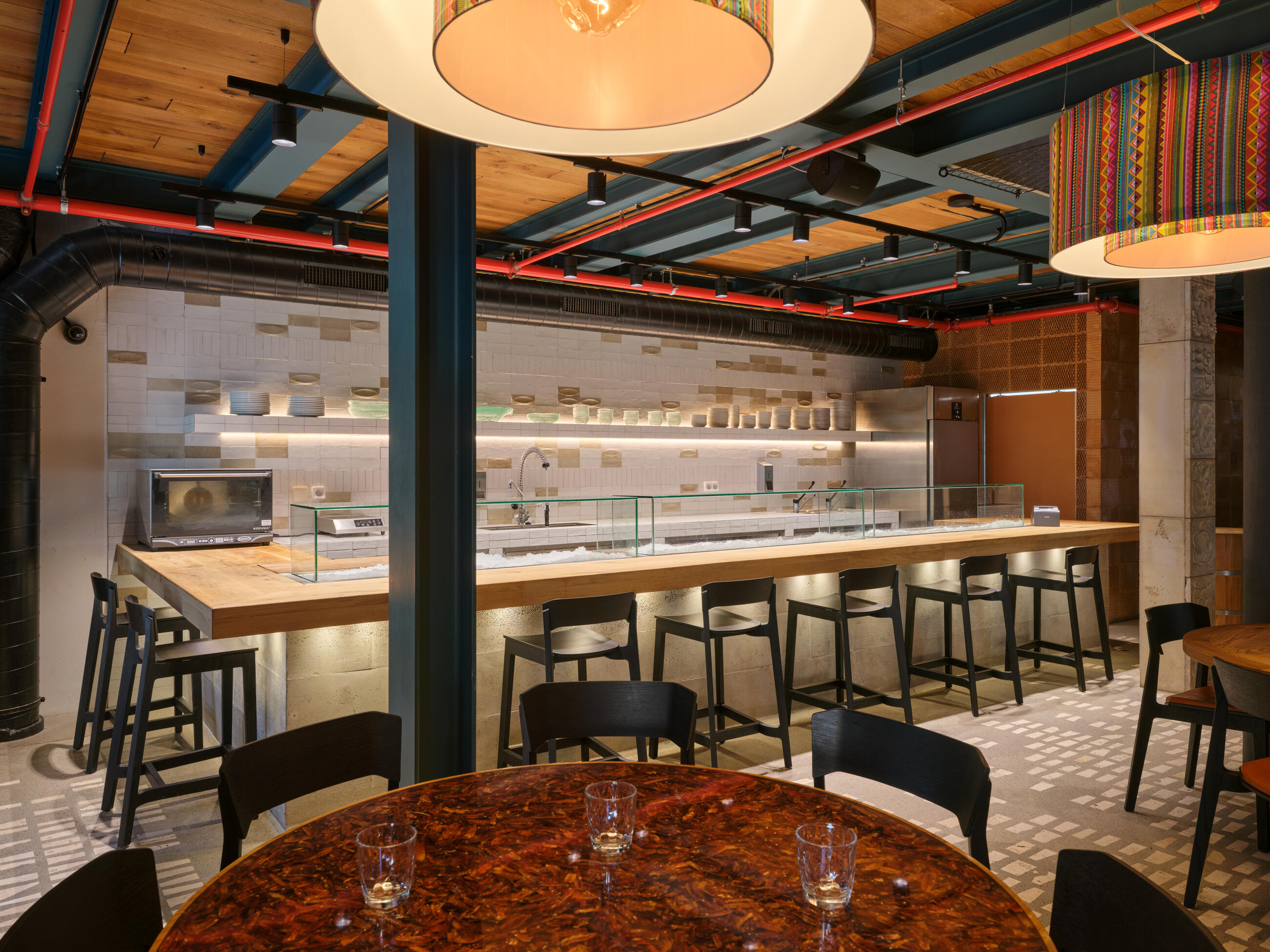 Another unusual and interesting feature is the blending of the restaurant space with the kitchen, where tortillas are baked, tacos are prepared, and dishes are grilled and cooked in a wood-fired oven right before the guests' eyes. Ceviche is prepared in the fish tank section, with the individual ingredients almost within reach. The kitchen, like the large cocktail bar upstairs, has an authentic design and material solution, including a beverage display case that extends over the bar to another gallery.