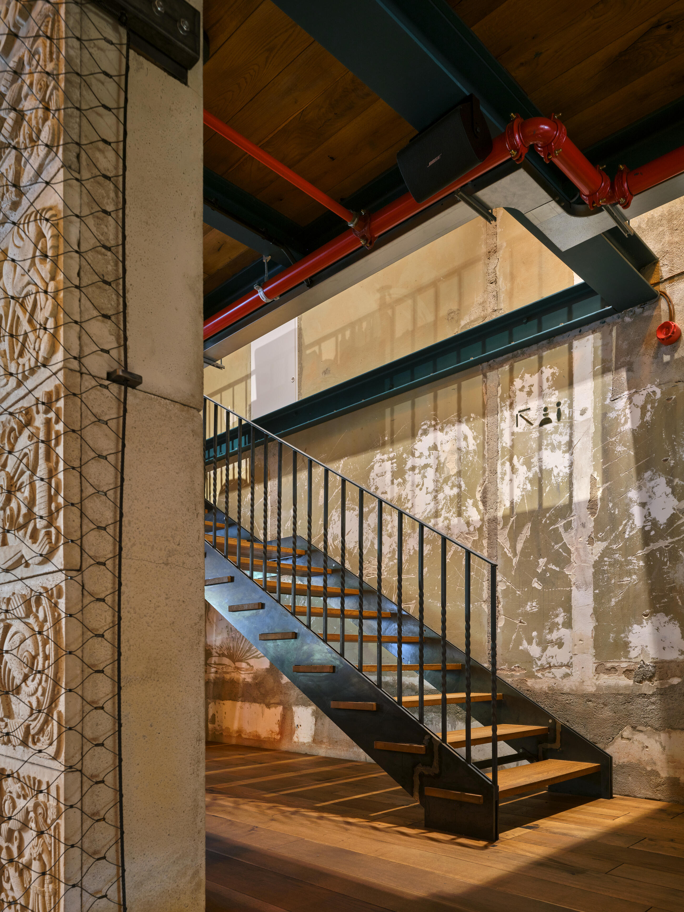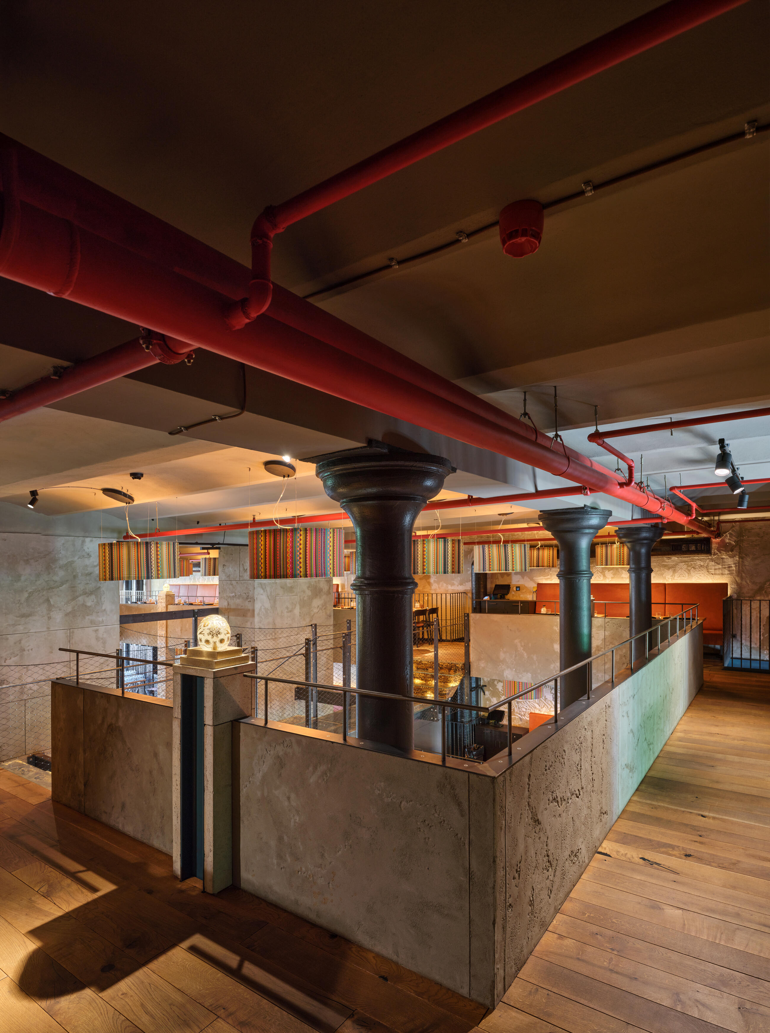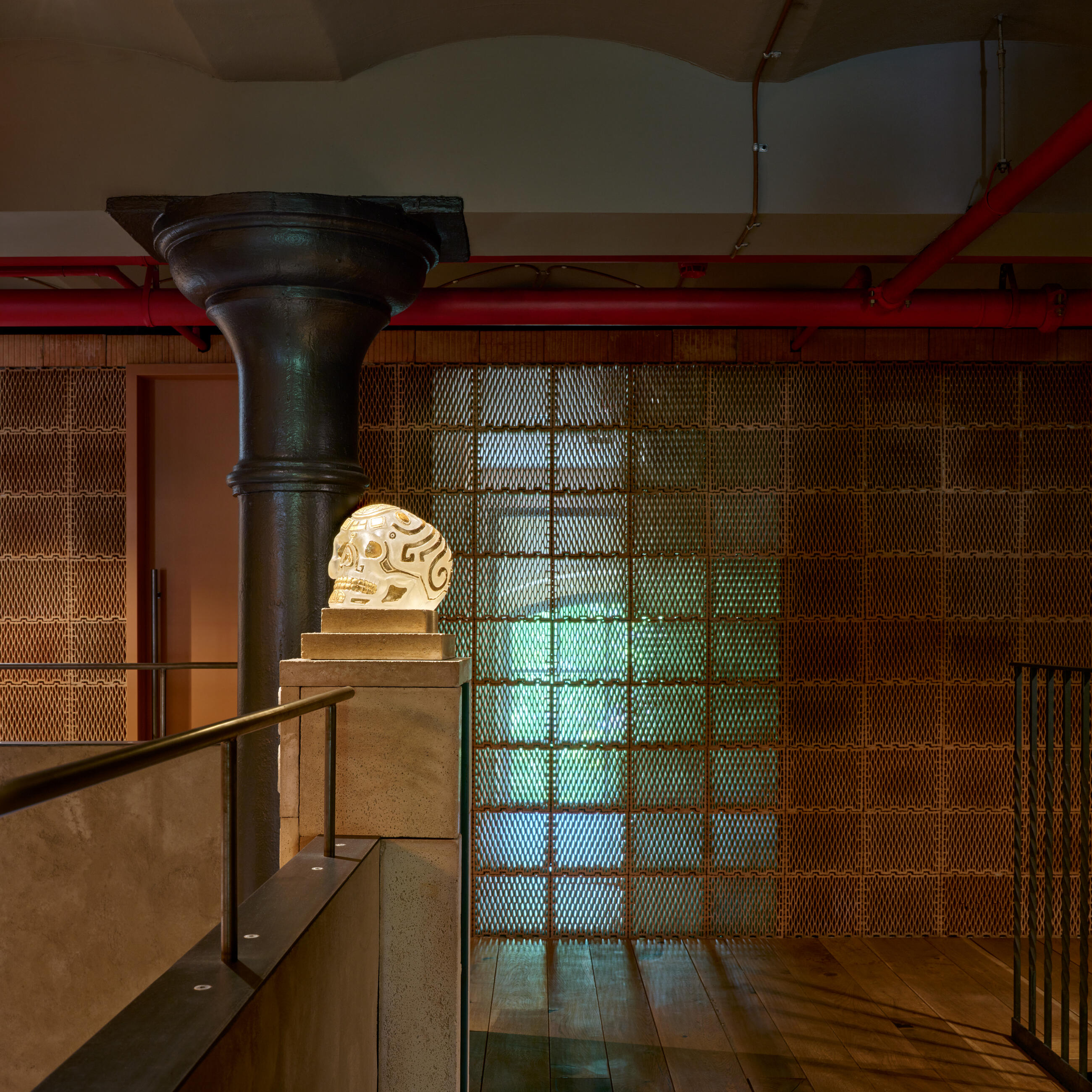 The galleries are supported by columns covered with stone reliefs featuring Mayan pictographic motifs, which feature original alphabet characters created exclusively for the Mexican restaurant by graphic designer Petr Štěpán in collaboration with the architects and sculptors.