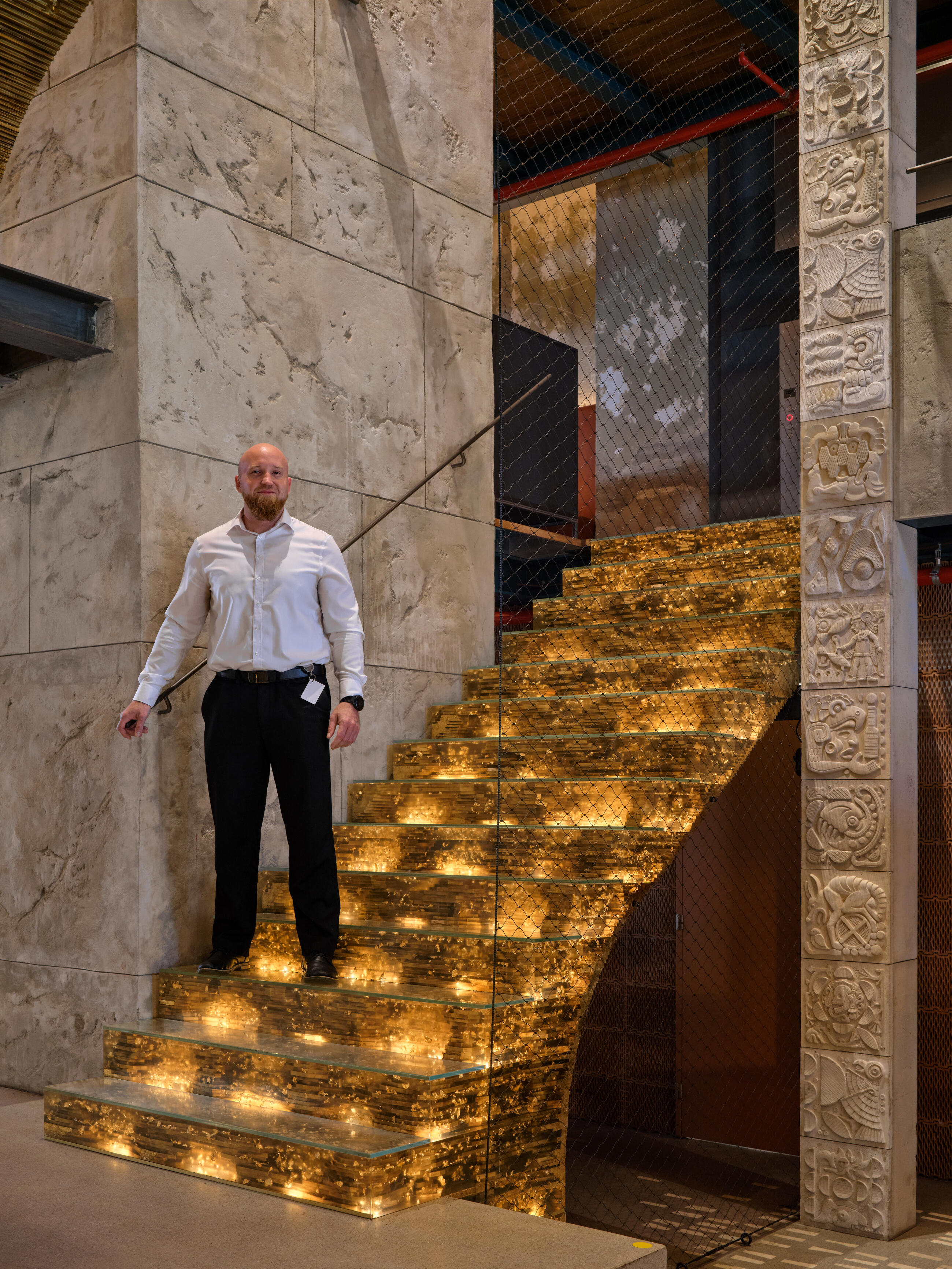 What is unique about the entire restaurant is its concept. The very fact that we are building two floors of galleries with a central courtyard into the elevated space of the former Holešovice brewery is exceptional enough, and when we add to that a multi-armed staircase illuminated with gold and sparkling with references to the history of Mexico during the Mayan era, it is clear that guests are in for an architecturally unusual experience.