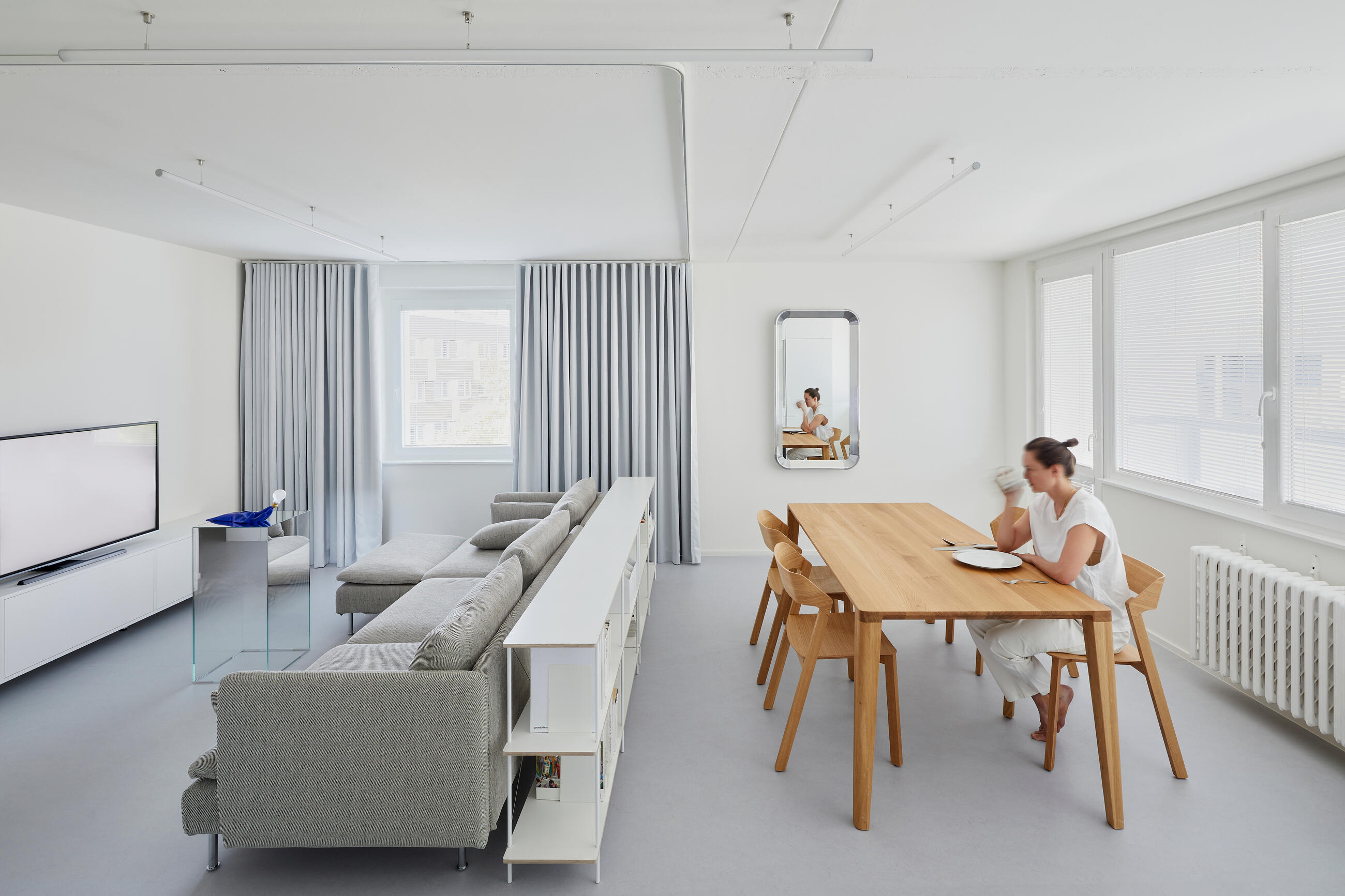 What is really necessary for life? How much mental space do the material things around us take up? Is it possible to achieve freedom of mind and spirit through minimalism? What is function and what is just desire? How to accommodate a 74 m2 apartment in a prefab concrete panel apartment so that three household members have privacy and at the same time space to be together?