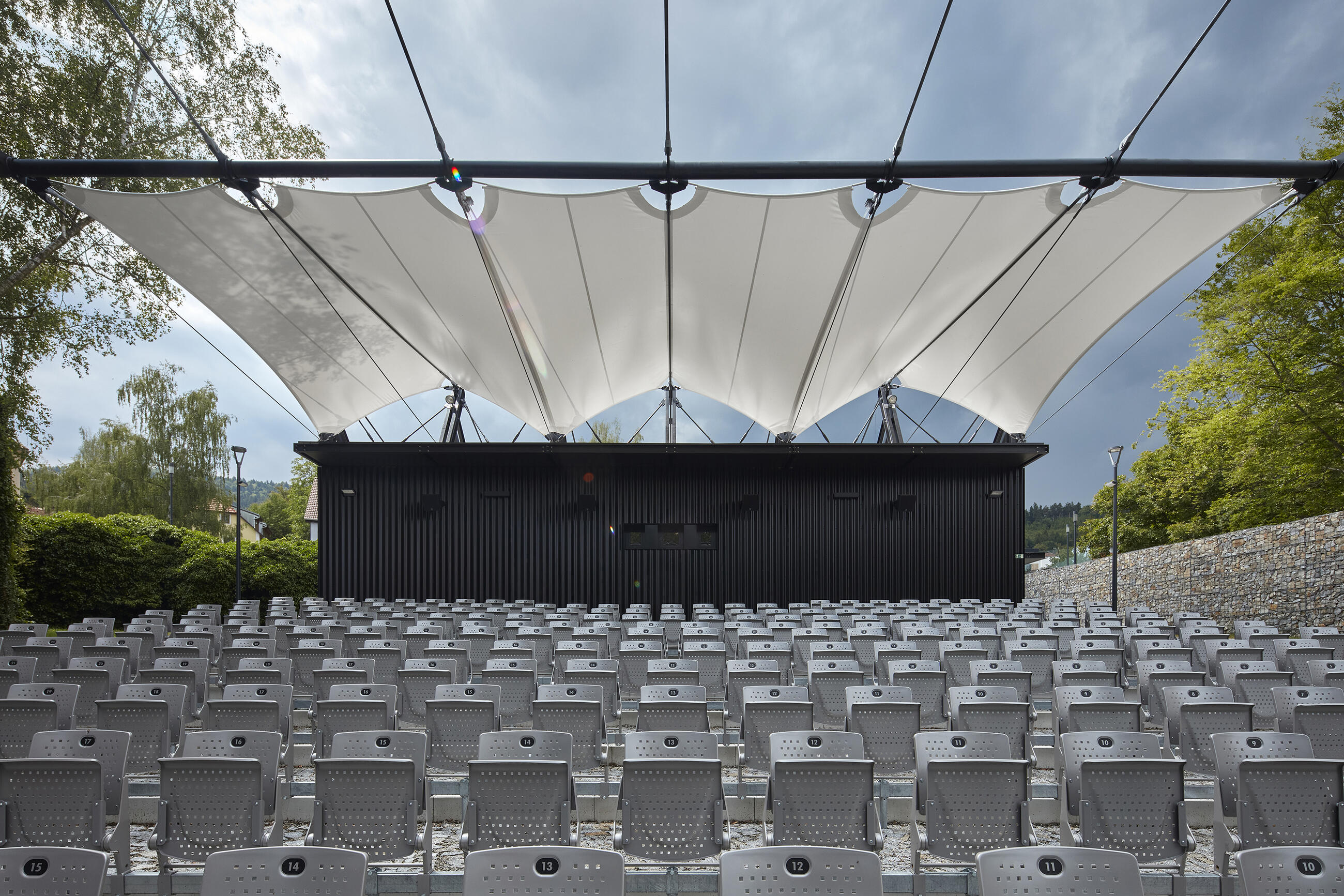 Through a complete reconstruction, the dilapidated former open-air cinema with a huge capacity of 800 seats, was transformed into a functioning complex with a more sustainable capacity of 350. The shrinking of the grounds also allowed the creation of much-needed buffer areas between residential buildings and the cinema grounds, with the implementation of acoustic measures, and lastly the creation of a new connection between the surrounding residential complex and the nearby town centre via Štěpánka’s Park.