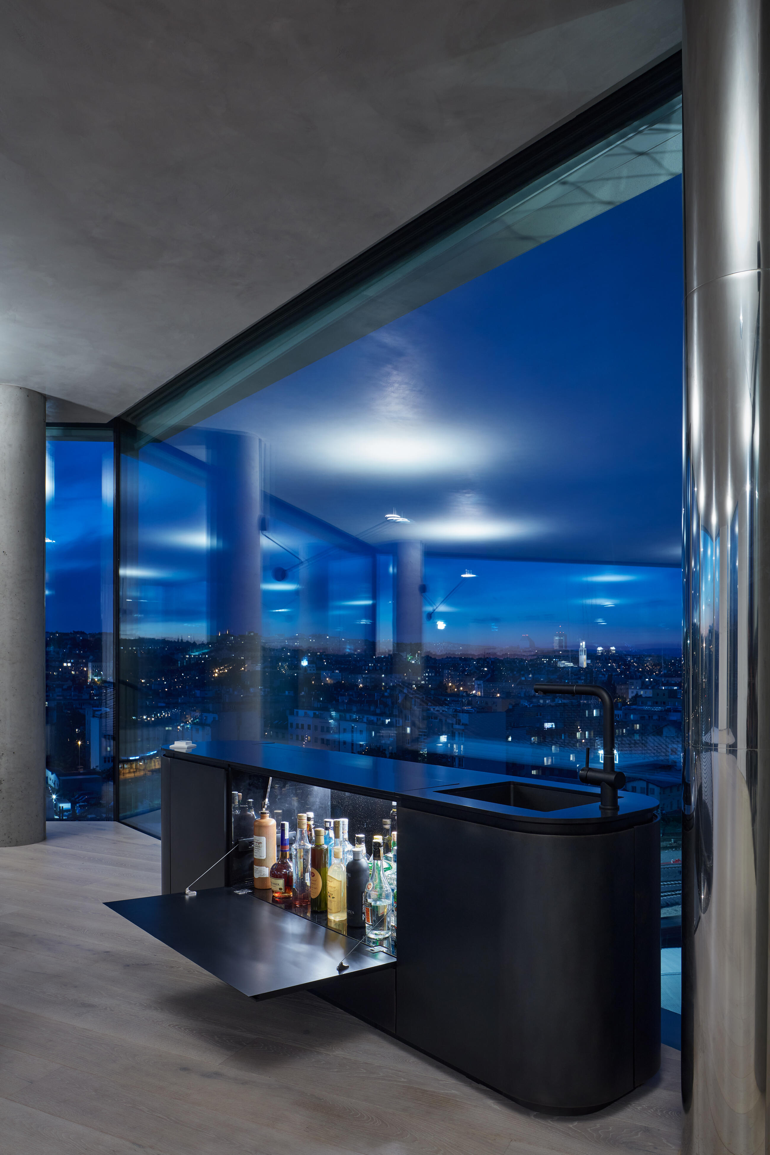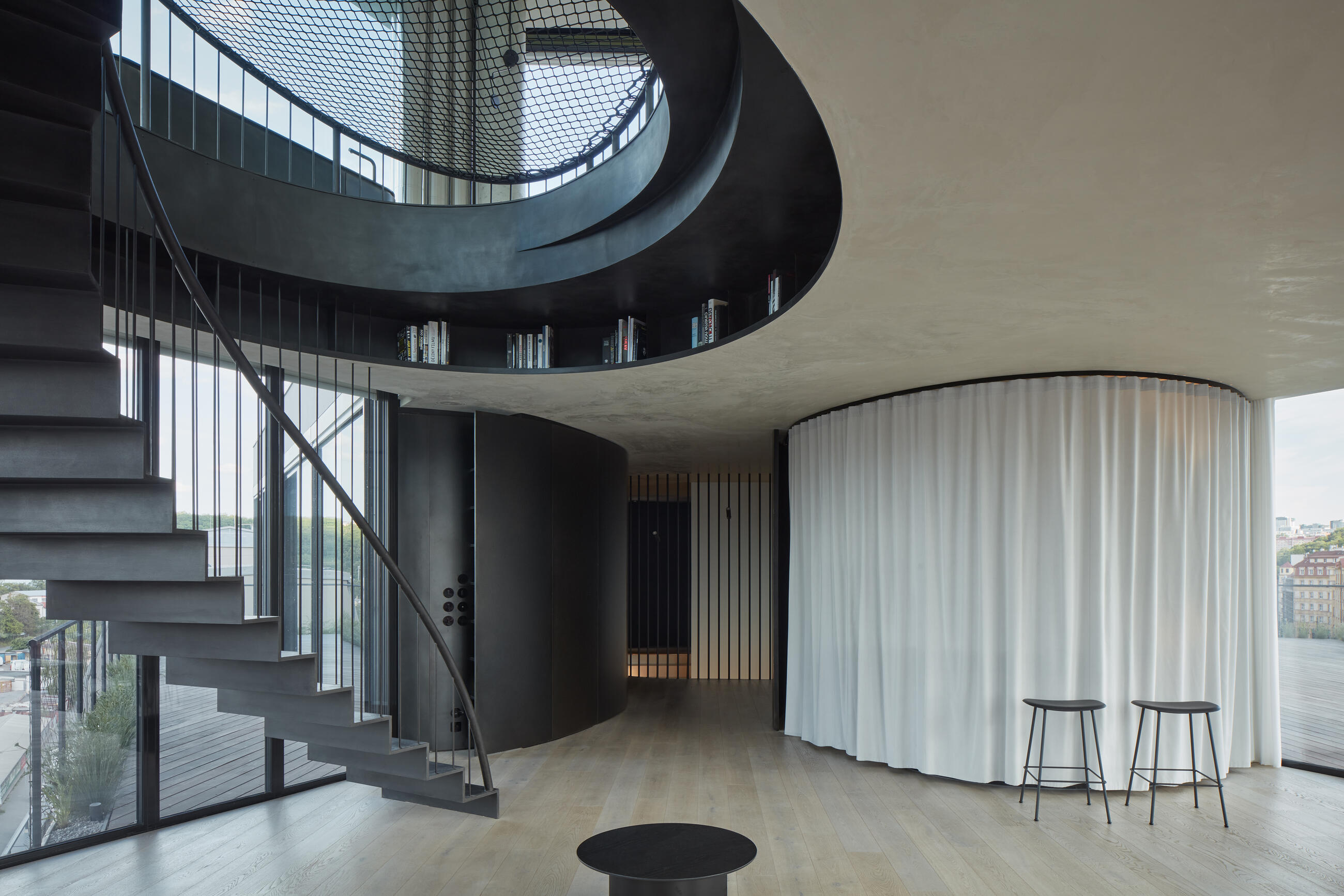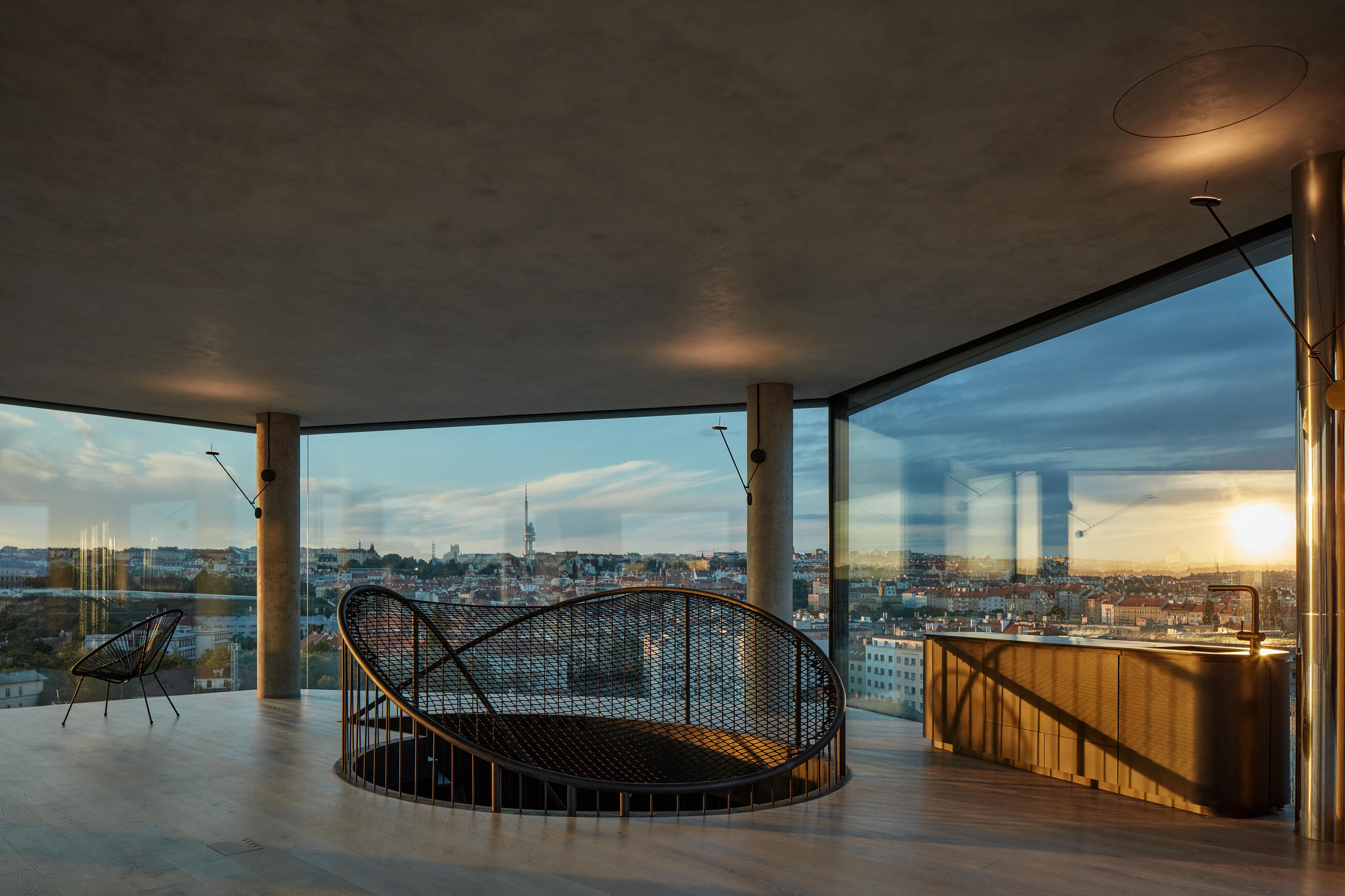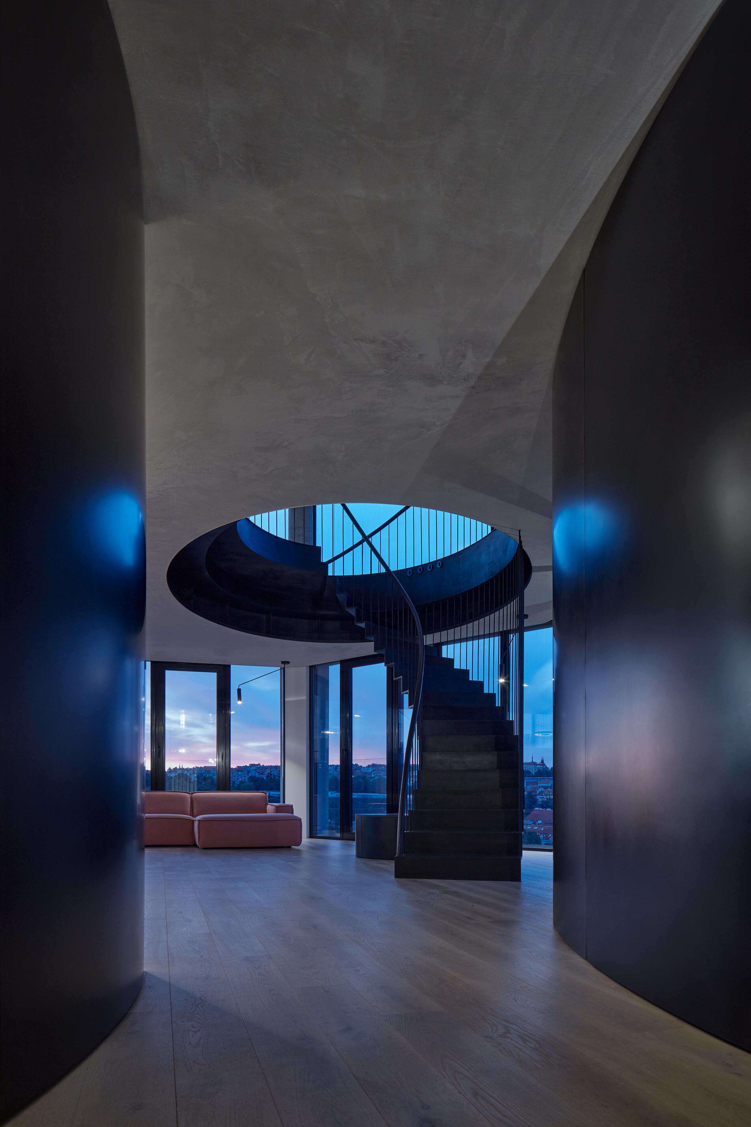 The layout articulates the division of the apartment into private and social zones, balancing the full and empty spaces separated by the steel membrane of the undulating partition orbiting the elevator and the entrance staircase. Behind this membrane, all of the private rooms, with their own perimeter terrace, are hidden. The tension between the entrance bay surrounded by a steel partition and the endless free space of the tower becomes the basis of the natural dramaturgy of movement in the apartment. Although the penthouse is primarily extroverted, its user comfort can be modulated into an intimate space by drawing the screens and curtains. The membrane of the main partition, going smoothly through the apartment, creates a private world behind it, hidden from the sight of visitors, and keeps the division intuitively readable only for the inhabitants of the apartment. The private part is divided into individual living sections (master bedroom and children's rooms), with its own “protected” world and unique view and contact with the city landscape. It maintains a "splendid isolation" section for parents, with a master bedroom, walk-in wardrobe and bathroom, and separates the children's section. The adjoining terraces follow this basic logic and are naturally divided by contacting each of the rooms in a different direction, with a different façade. The master bedroom is connected to a bathroom with solitary bath and hidden niches with toilets and showers and is accessible through the hall with a library adjoining the walk-in wardrobe. The children's section, consisting of two separate children's rooms, is accessible from the corridor bay through a hall with a bathroom. The apartment can be entered through either the staircase orbiting the elevator shaft or the barrier-free lift into the corridor bay surrounded by a steel wall containing built-in wardrobes and shoe cabinets and doors to all private parts. The doors are hidden in the steel wall and can be opened by invisible recessed no-handle mechanisms; the wardrobes, by push-to-open mechanisms. The living space of the tower works with the dramaturgy of gradual discovering and opening the space from the entrance bay towards the panoramic open living space connected through both floors. The structural floor-to-ceiling glazing on the lower floor follows the pattern of the apartment below and is complemented by French windows, while the glazing on the upper floor has no pattern. Each of the five sides of the tower is made of one single 4-glass pane, bonded structurally only in subtle corners of mutual contact; the sixth side is divided into three identical sliding components that connect it with the roof garden. The garden is connected to the interior by a wooden terrace shaded by a retractable awning integrated into the facade. The garden is designed around a central hill above the elevator shaft, allowing a higher layer of substrate for intense greenery (seemingly “self-seeding" birch trees). Towards the edge, it changes into grass and flowerbeds formed by compositions of ornamental and agricultural vegetation with edible fruits. Around the edge of the roof is a subtle steel railing with a rope string not visible in the tall grasses and perennials. The terraces on the lower level of the apartment are made of wooden decks with the planks following the pattern of the interior floor. They are lined with flower boxes with grasses and herbs. A suspended steel staircase sculpturally inserted into an elliptical cut-out in the ceiling creates the dominant element of the two-storey living space. The staircase hides a library in the space created by the plastic shaping of the ceiling. The kitchen follows the continuous shaping of the entrance partition and is designed as a solid back and a "floating" island, creating an integral composition flowing to the lower part of the living space with dining table and seating furniture. The kitchen is connected to the rear kitchen room and pantry, accessible from both the kitchen area and the hallway. This module is connected to the laundry and utility room, accessible through a steel partition via a hidden door. In the opposite part of the kitchen bay, there is a guest bathroom hidden behind the round wall, accessible directly from the social part of the apartment. The toilet and the shower are placed in niches using the same method as in the other bathrooms.