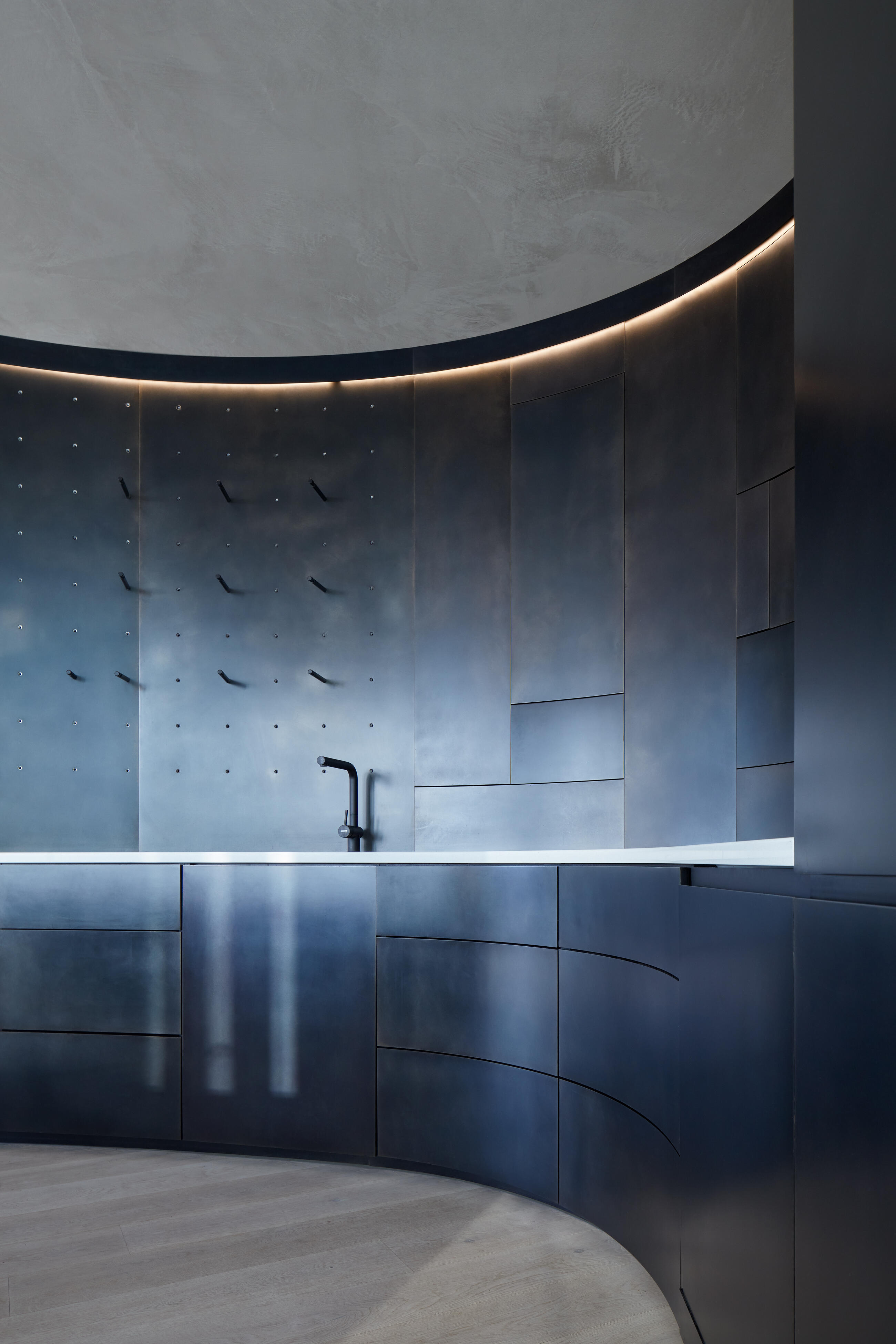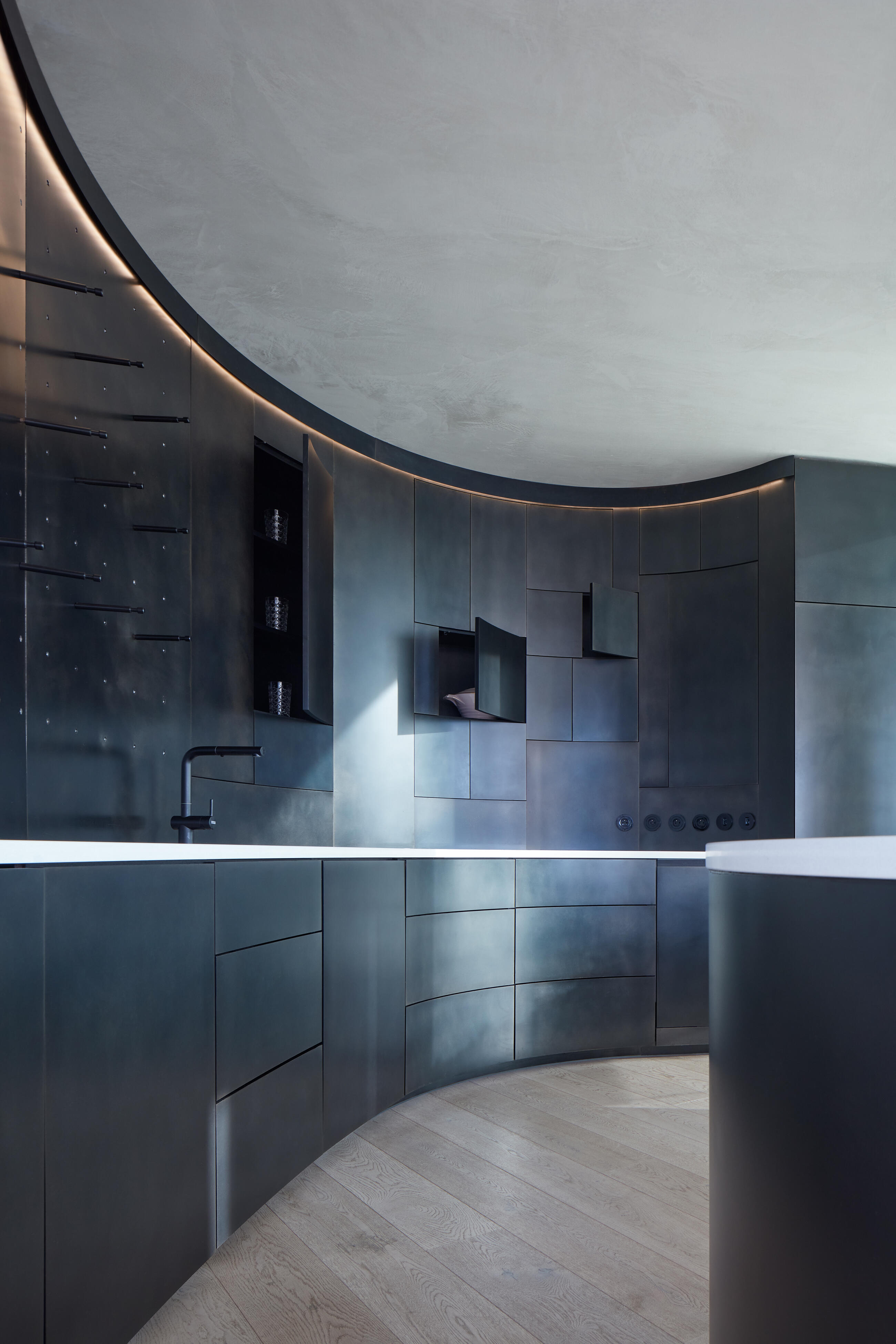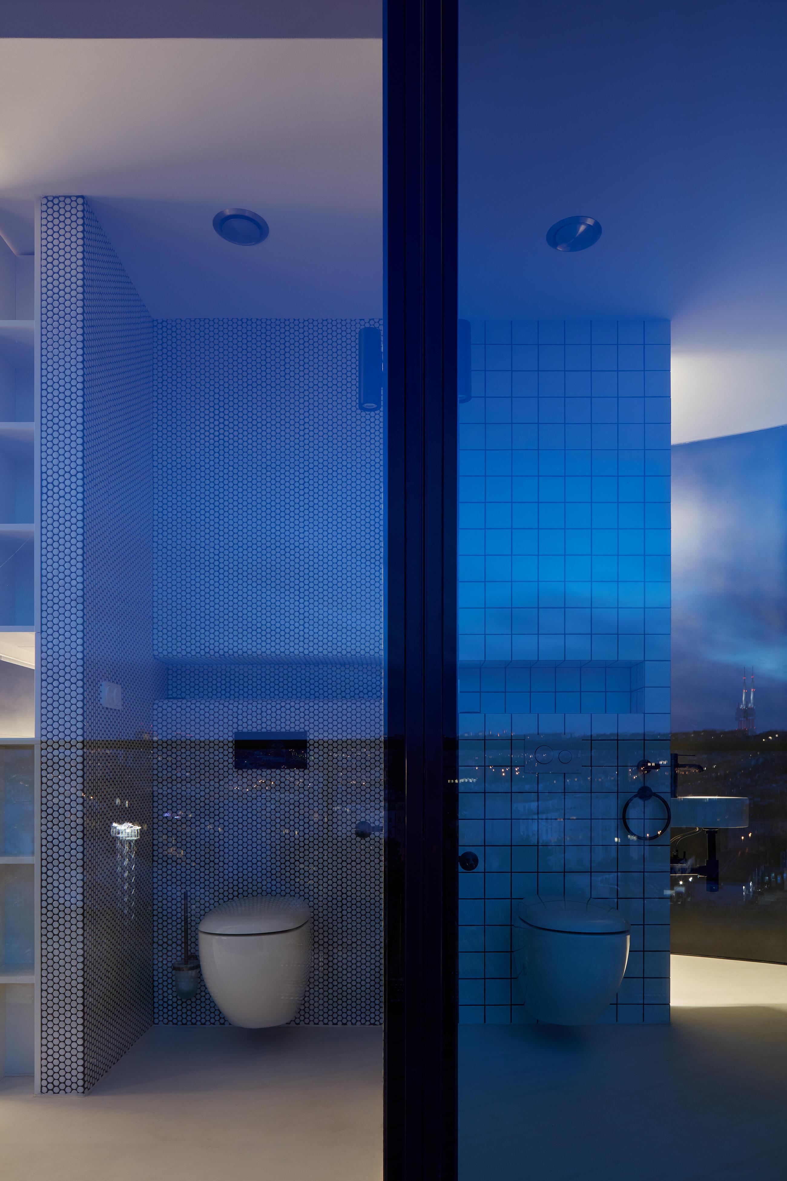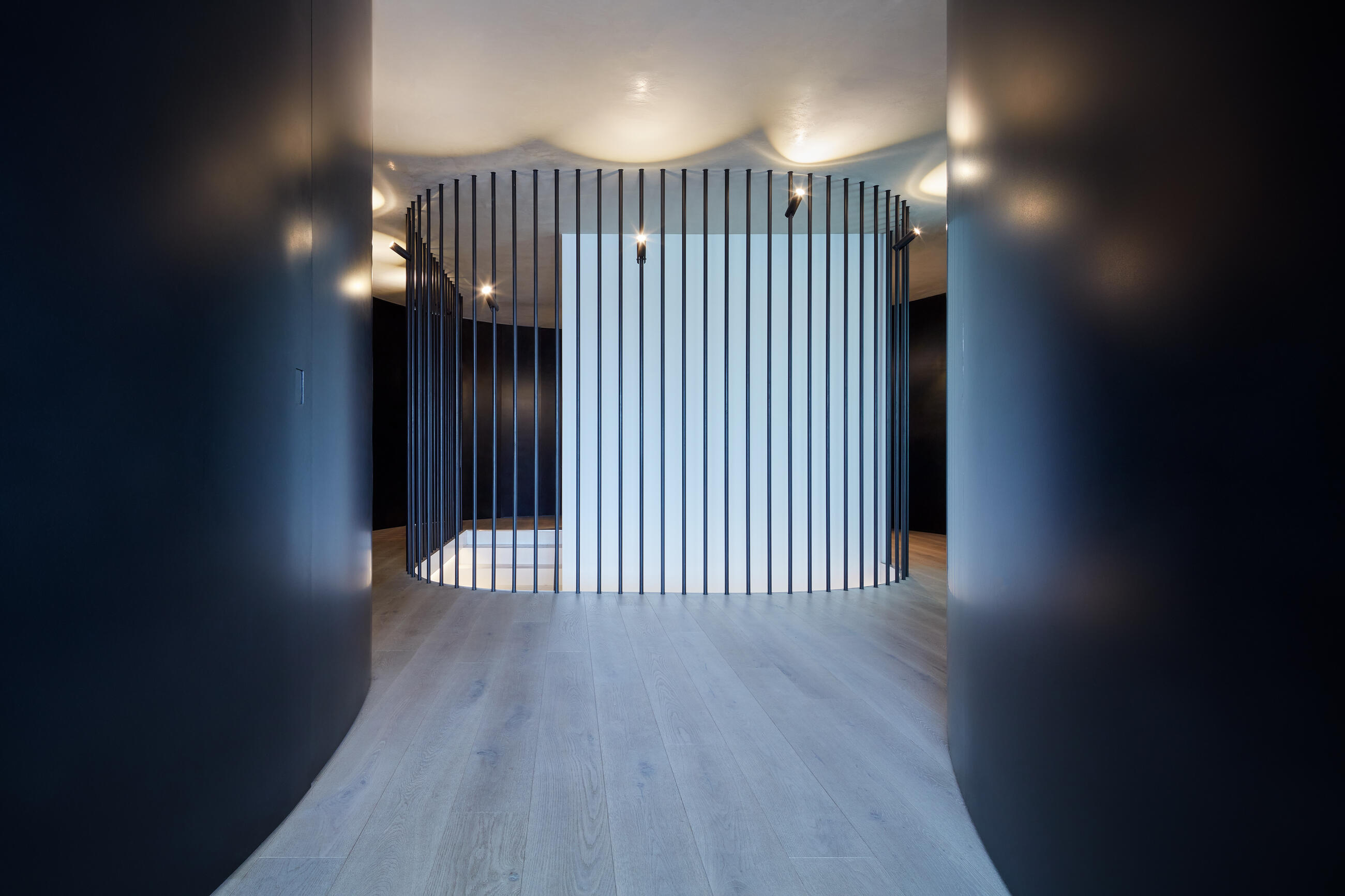 The layout articulates the division of the apartment into private and social zones, balancing the full and empty spaces separated by the steel membrane of the undulating partition orbiting the elevator and the entrance staircase. Behind this membrane, all of the private rooms, with their own perimeter terrace, are hidden. The tension between the entrance bay surrounded by a steel partition and the endless free space of the tower becomes the basis of the natural dramaturgy of movement in the apartment. Although the penthouse is primarily extroverted, its user comfort can be modulated into an intimate space by drawing the screens and curtains. The membrane of the main partition, going smoothly through the apartment, creates a private world behind it, hidden from the sight of visitors, and keeps the division intuitively readable only for the inhabitants of the apartment. The private part is divided into individual living sections (master bedroom and children's rooms), with its own “protected” world and unique view and contact with the city landscape. It maintains a "splendid isolation" section for parents, with a master bedroom, walk-in wardrobe and bathroom, and separates the children's section. The adjoining terraces follow this basic logic and are naturally divided by contacting each of the rooms in a different direction, with a different façade. The master bedroom is connected to a bathroom with solitary bath and hidden niches with toilets and showers and is accessible through the hall with a library adjoining the walk-in wardrobe. The children's section, consisting of two separate children's rooms, is accessible from the corridor bay through a hall with a bathroom. The apartment can be entered through either the staircase orbiting the elevator shaft or the barrier-free lift into the corridor bay surrounded by a steel wall containing built-in wardrobes and shoe cabinets and doors to all private parts. The doors are hidden in the steel wall and can be opened by invisible recessed no-handle mechanisms; the wardrobes, by push-to-open mechanisms. The living space of the tower works with the dramaturgy of gradual discovering and opening the space from the entrance bay towards the panoramic open living space connected through both floors. The structural floor-to-ceiling glazing on the lower floor follows the pattern of the apartment below and is complemented by French windows, while the glazing on the upper floor has no pattern. Each of the five sides of the tower is made of one single 4-glass pane, bonded structurally only in subtle corners of mutual contact; the sixth side is divided into three identical sliding components that connect it with the roof garden. The garden is connected to the interior by a wooden terrace shaded by a retractable awning integrated into the facade. The garden is designed around a central hill above the elevator shaft, allowing a higher layer of substrate for intense greenery (seemingly “self-seeding" birch trees). Towards the edge, it changes into grass and flowerbeds formed by compositions of ornamental and agricultural vegetation with edible fruits. Around the edge of the roof is a subtle steel railing with a rope string not visible in the tall grasses and perennials. The terraces on the lower level of the apartment are made of wooden decks with the planks following the pattern of the interior floor. They are lined with flower boxes with grasses and herbs. A suspended steel staircase sculpturally inserted into an elliptical cut-out in the ceiling creates the dominant element of the two-storey living space. The staircase hides a library in the space created by the plastic shaping of the ceiling. The kitchen follows the continuous shaping of the entrance partition and is designed as a solid back and a "floating" island, creating an integral composition flowing to the lower part of the living space with dining table and seating furniture. The kitchen is connected to the rear kitchen room and pantry, accessible from both the kitchen area and the hallway. This module is connected to the laundry and utility room, accessible through a steel partition via a hidden door. In the opposite part of the kitchen bay, there is a guest bathroom hidden behind the round wall, accessible directly from the social part of the apartment. The toilet and the shower are placed in niches using the same method as in the other bathrooms.