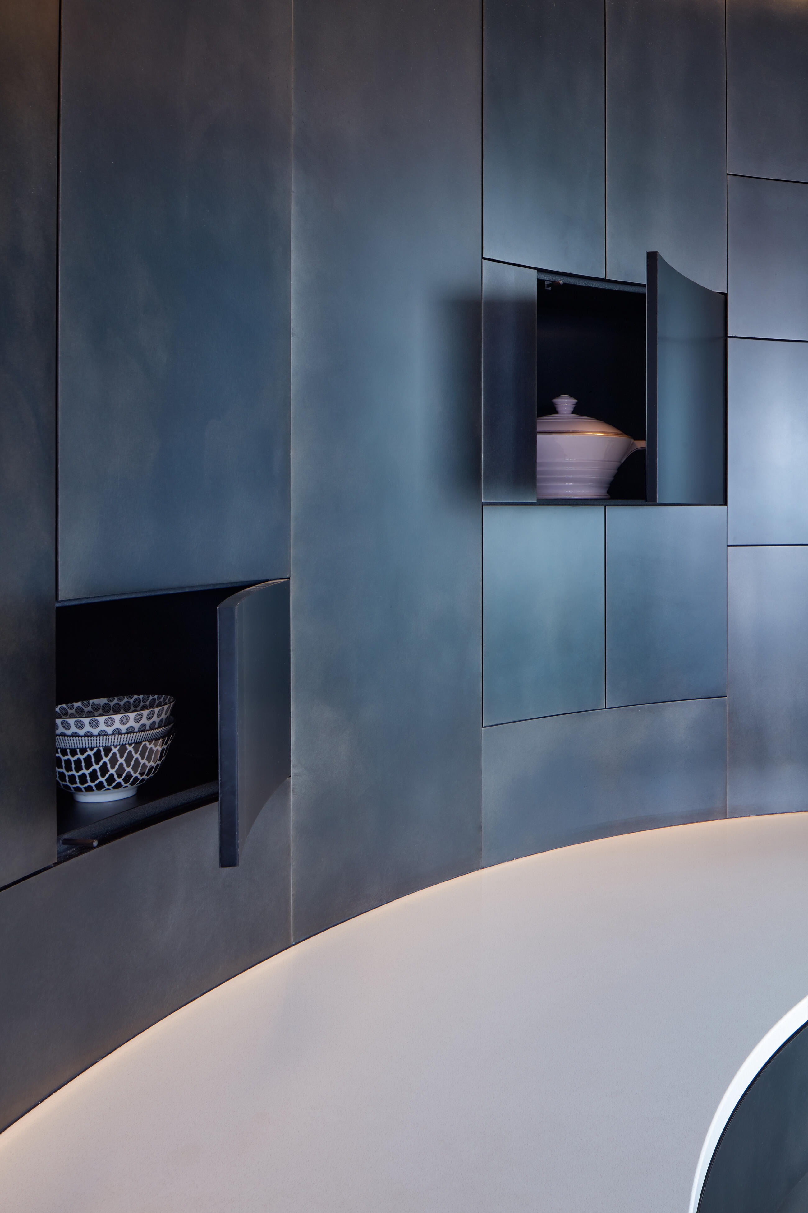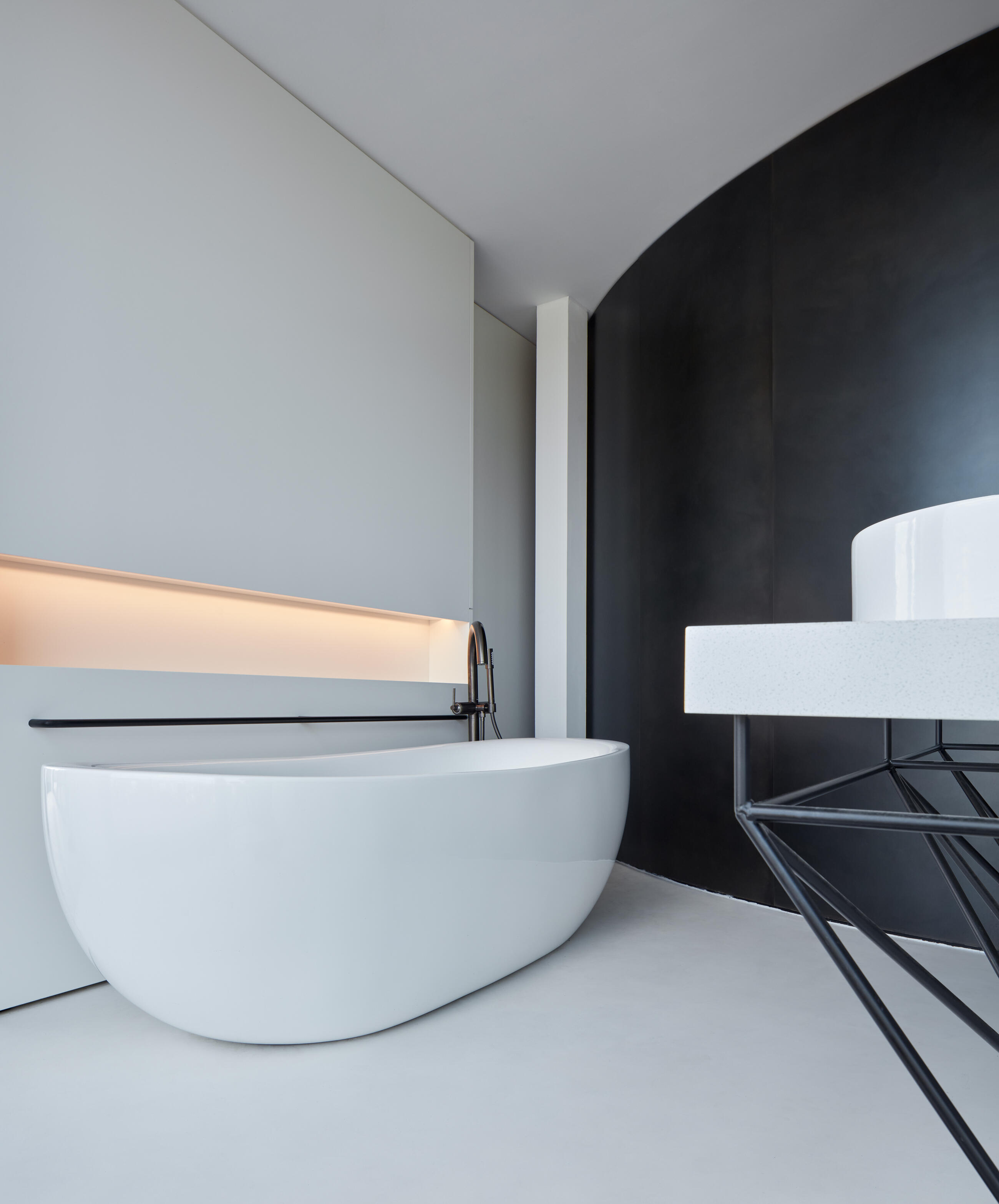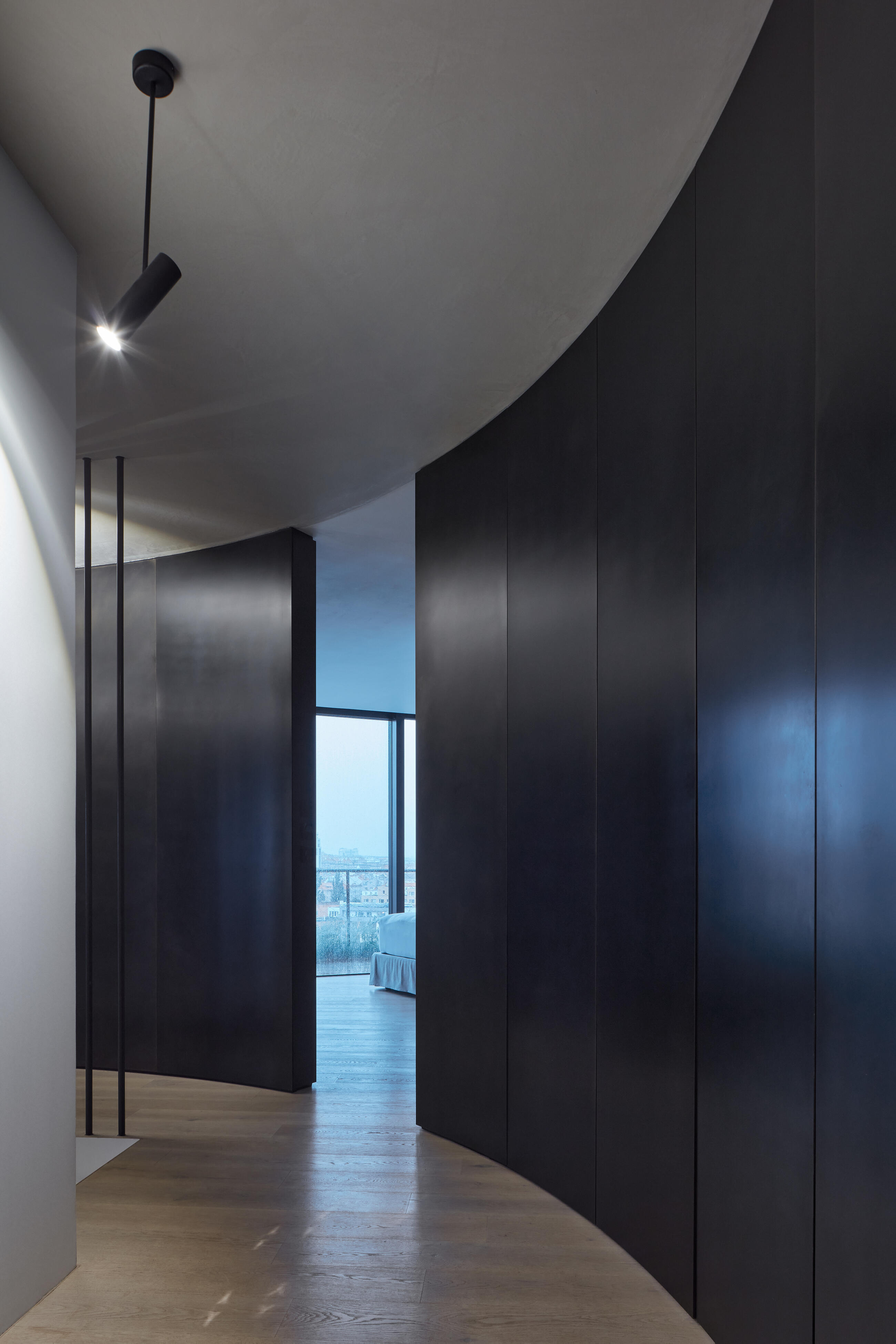 The materials used correspond to the light and mostly white space and its division into two "worlds" by a dominant dark steel partition. Its surface is treated from both sides using etching, sanding and polishing on a hot-rolled black steel sheet sandwiched on a wood-fibre board. All of the doors and openings are frameless, cut into the continuous surface of this partition. The floor is made of wide planks running perpendicular to the main facade through the entire apartment and continuing to the planks on the terraces. The ceilings are finished with a fine texture, including the recessed parts of the lights and air conditioning and integrated covers for hanging swings and other elements on the upper floor. The railing of the interior staircase creates a rising and descending curve so as to interrupt the panoramic view as little as possible and equipped with a hammock with access to the place where the handrail touches the floor. The space is lit using diffused reflected light and hidden lines lining the curves of the partitions.