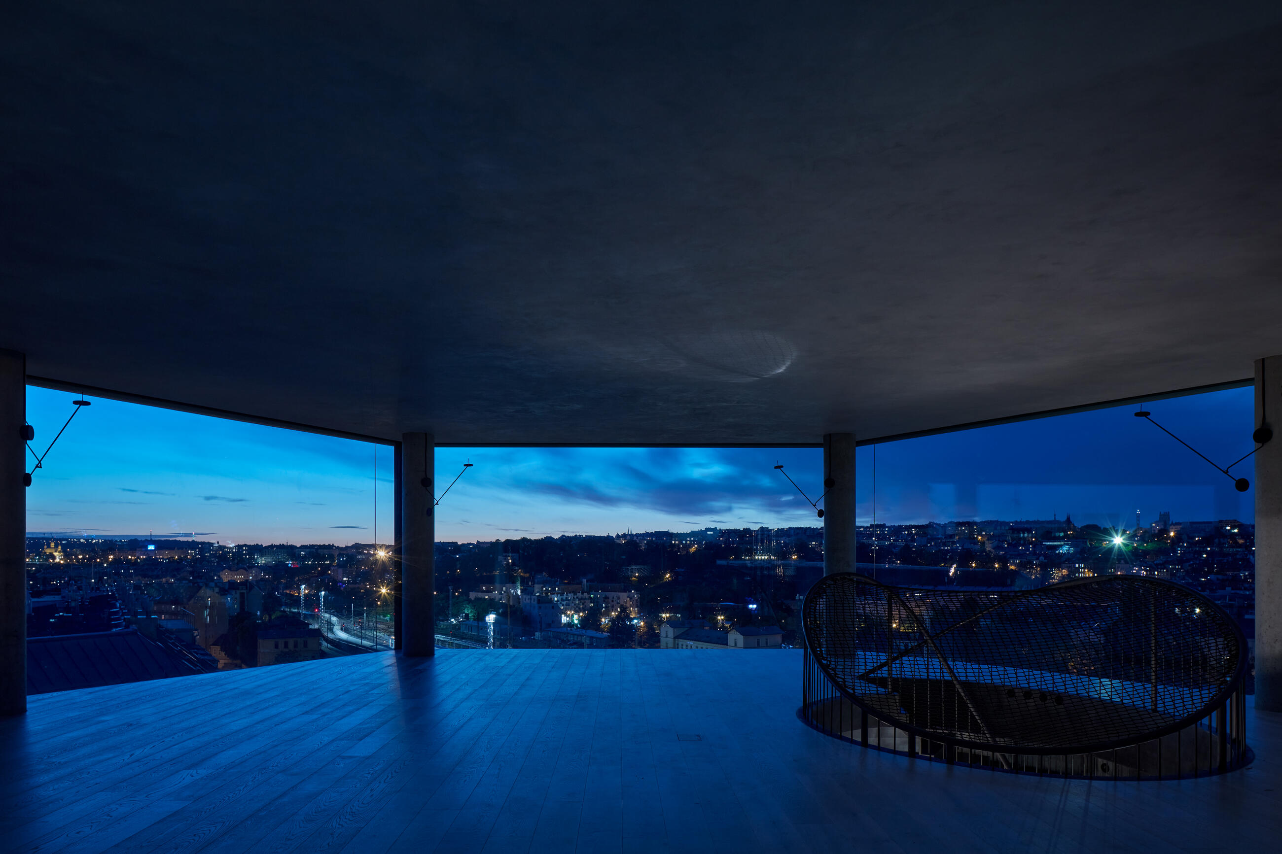 The architectural design draws on the unique superposition of the penthouse above all surrounding buildings and takes advantage of the panoramic view. It revises the impact of the compromising reconstruction done by a developer towards the original genius loci of the building, clarifying all the detailed relationships between the exterior elements, especially in the large-area glazing in the upper floor of the tower, allowing a spectacular view from all windows with minimal division of individual glazed areas. As it is not possible to work with the historical connotation in the part of the building we designed (it is a superstructure, partially re-created corner tower of the original water reservoir with added wings) and it is a reconversion for typologically different use (housing), we do not work with the debatable "industrial" character of the building or with aestheticism with clear loft features. The leitmotif is the free and continuous flow of the interior throughout the space and its endless optical continuation into the surrounding city.