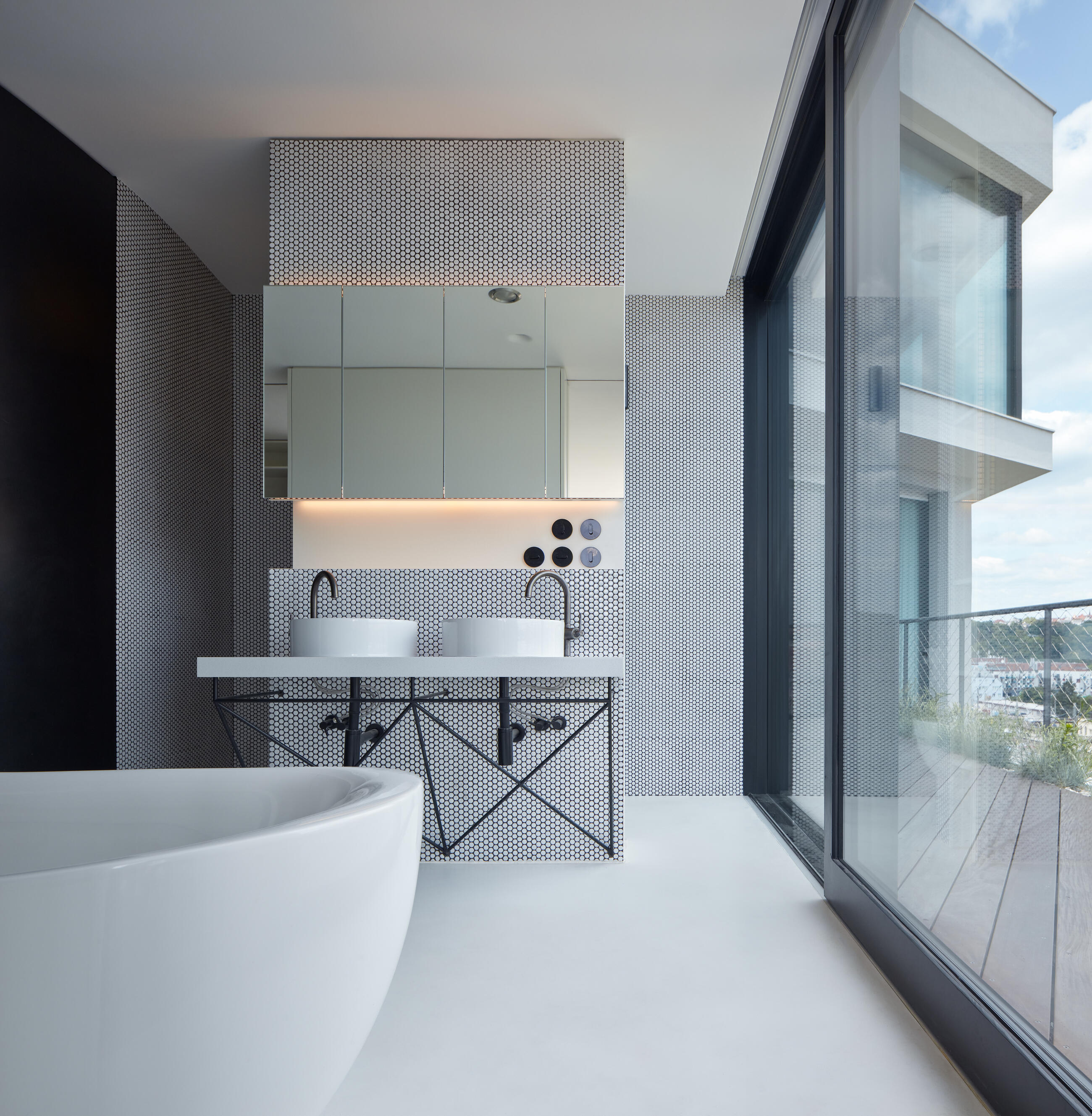 The project works with a high-end technological solution corresponding to the most progressive standard currently achievable. The technologies are intentionally concealed, and therefore, practically invisible, and remain a hidden force in the apartment’s background. The indoor temperature control is based on low-temperature transmission; the temperature changes are not perceivable. The system creates an ambient climate and maintains a comfortable temperature without the obvious flow of air during its exchange. The hidden heating and cooling distribution is integrated into the floors and ceilings, and the air-conditioning distributed through the slits lining the windows is also almost invisible and does not distract from the visual design of the apartment. The primary energy source is an air-to-air heat pump hidden in an acoustically separated shaft on the terrace. The maximally open façade is complemented with large exterior screens in white that shade sunlight and remain transparent from the inside, even when closed, to maintain contact with the city.