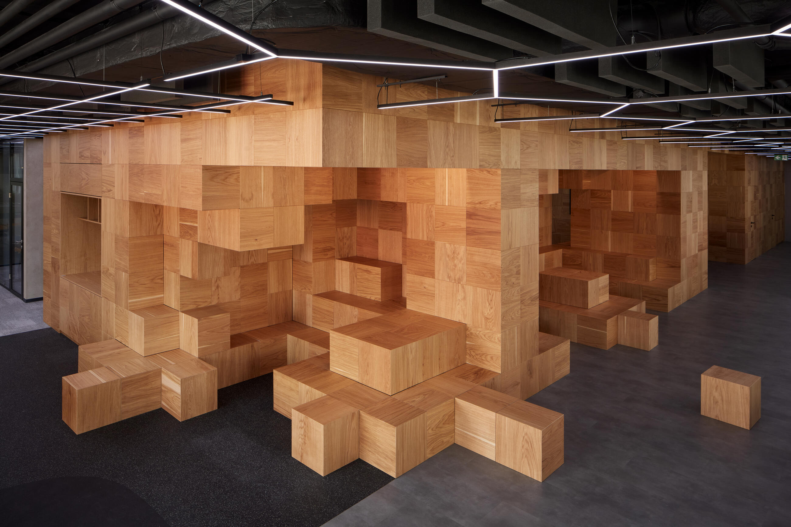 The structure is aesthetically and technologically inspired by the creation in the game Minecraft. The visible surfaces of the structure in a 40 x 40 cm grid are veneered and the composition of the veneering is completely random, it was necessary to create a system that allows the random placement of individual cubes in a pre-designed final shape.