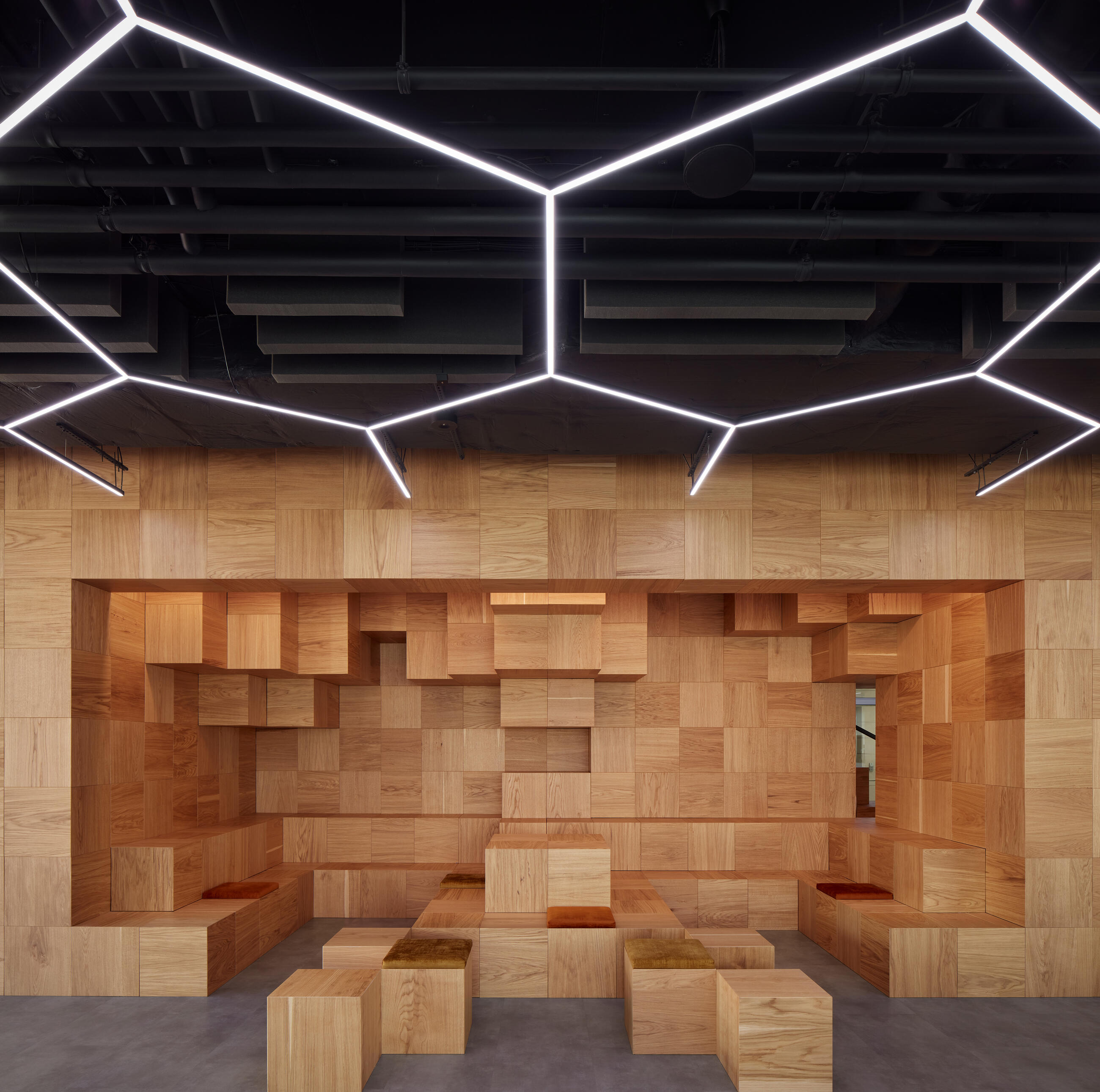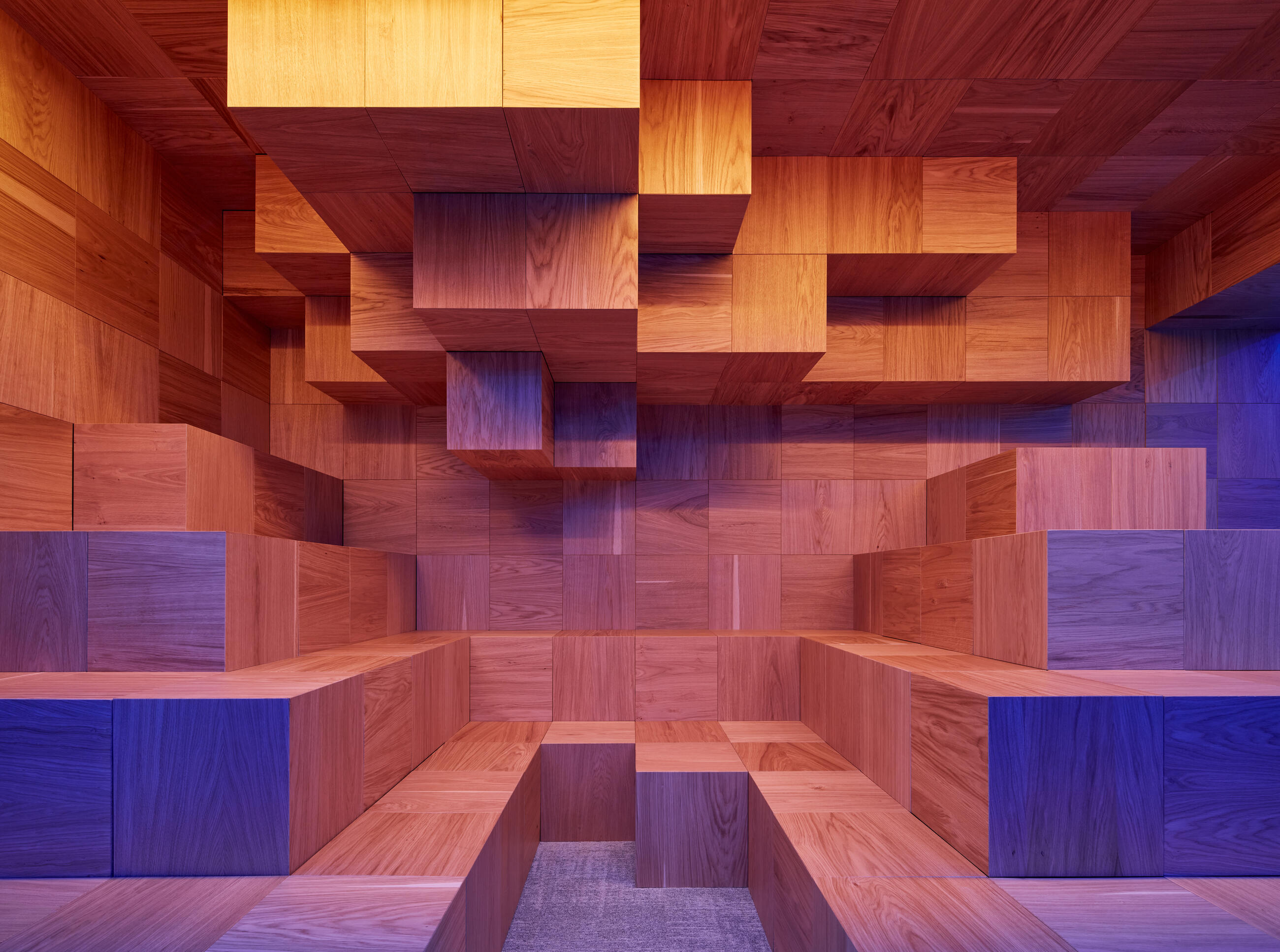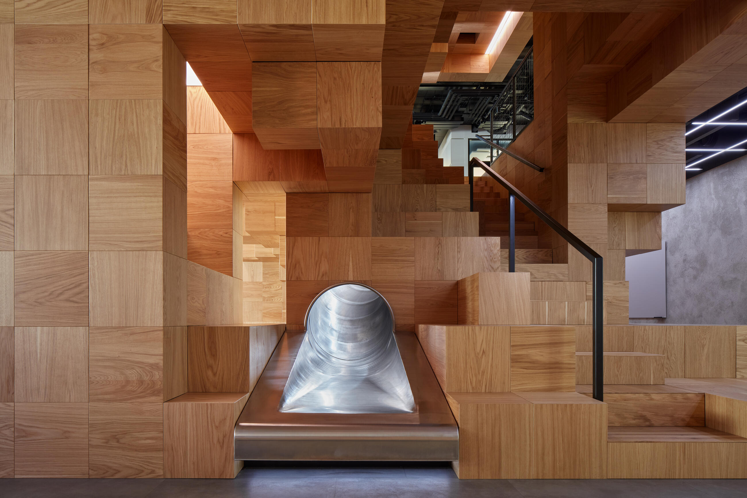 The main brief was to expand the core offices and provide an additional floor with maximum flexibility of use. Vertically connecting two floors tends to be problematic if the natural flow of the space is to be maintained. The two floors are tectonically connected by a structure composed of thousands of wooden pixels, which modulates the space around it and becomes its internal landmark. At the core of the structure is a new interior staircase and, for the more adventurous, a slide. Hidden inside the wooden cells are personal lockers, dressing rooms and function rooms, while the individual fragments organically create nooks designed for informal seating and public presentations.