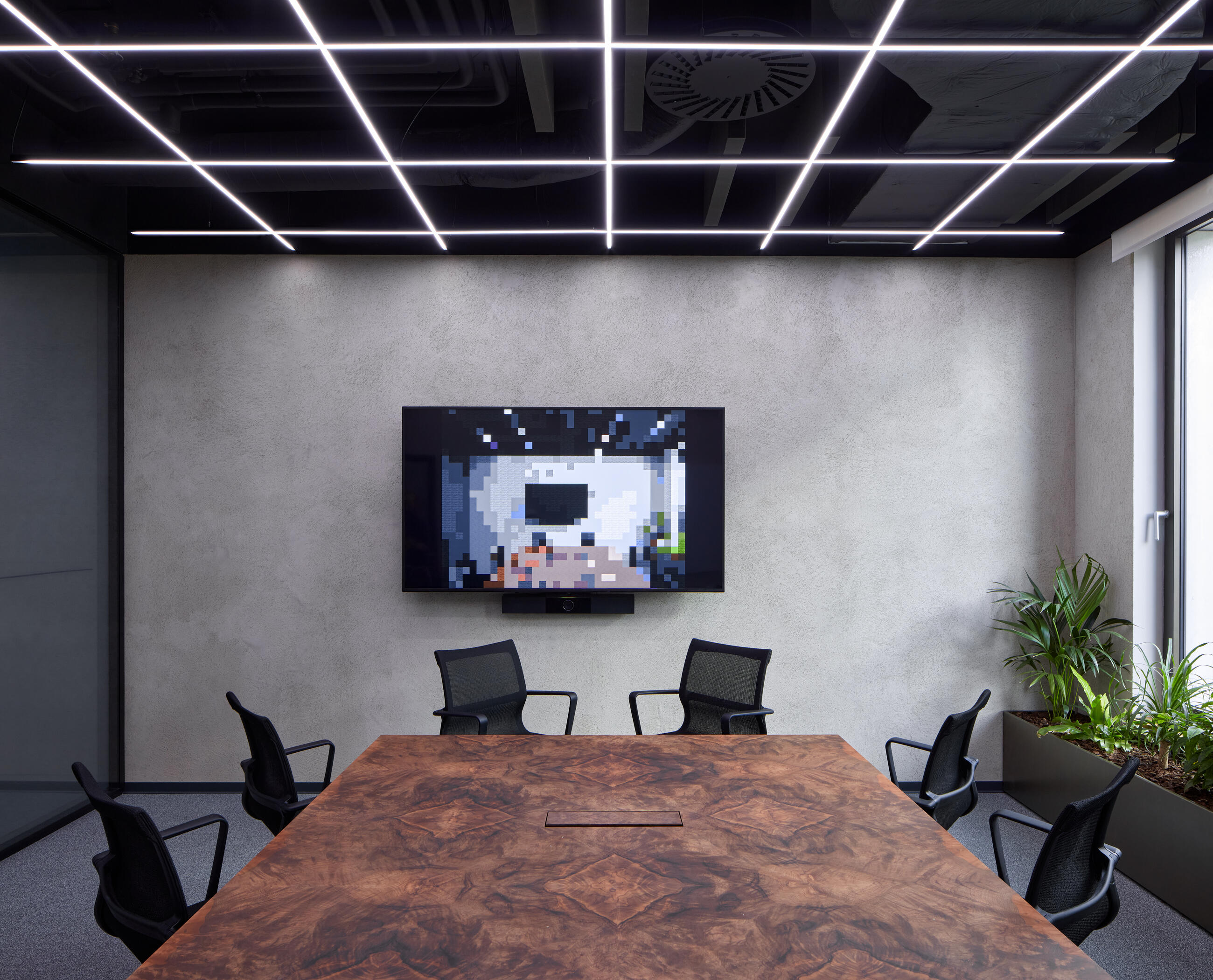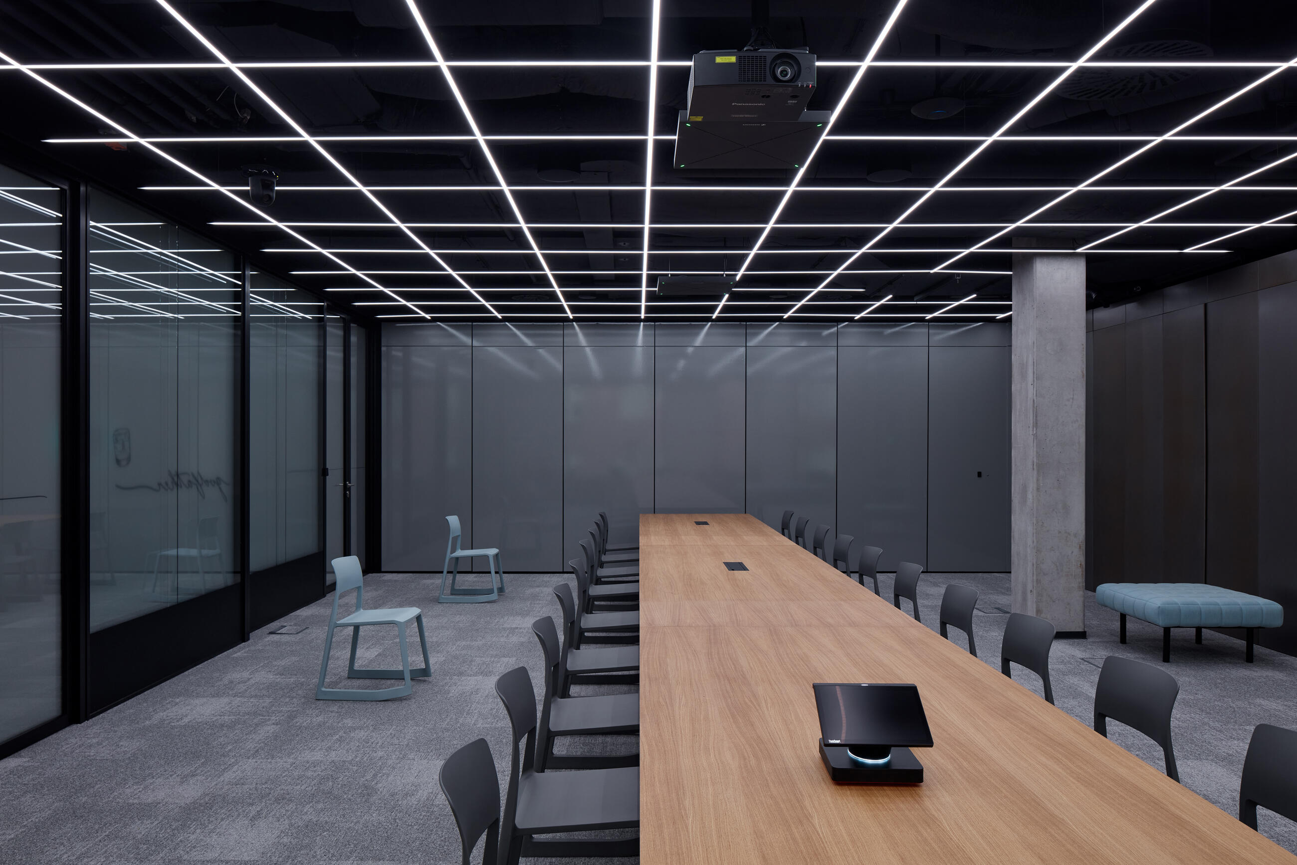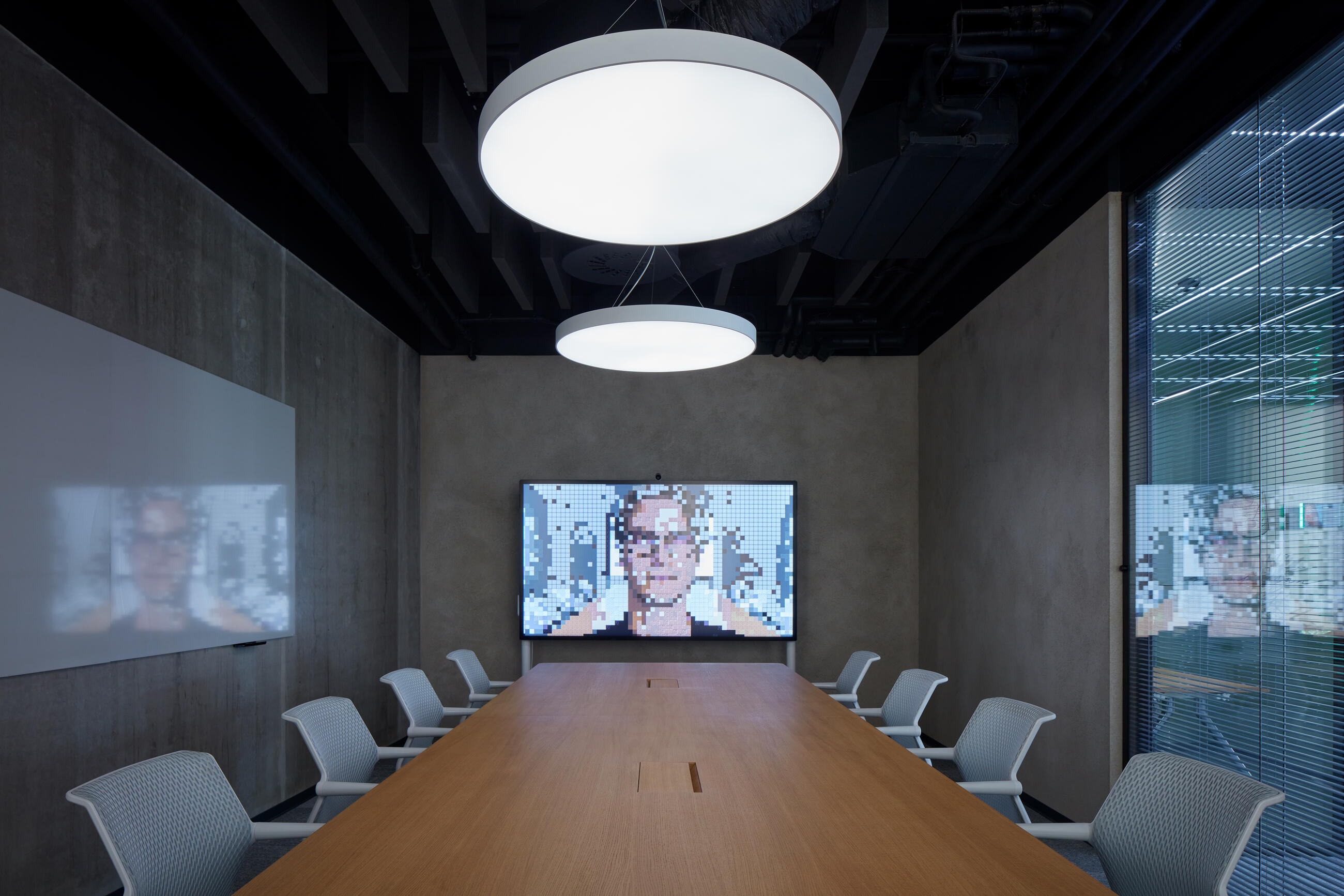 Neutral tones of the building structures (concrete, grey floor, grey and white paintwork), light grey whiteboards, black painted technological wiring blending into the black ceiling, natural wood, coloured paintwork in the smallest rooms, complemented by interior greenery and a unified palette of upholstered furniture.
