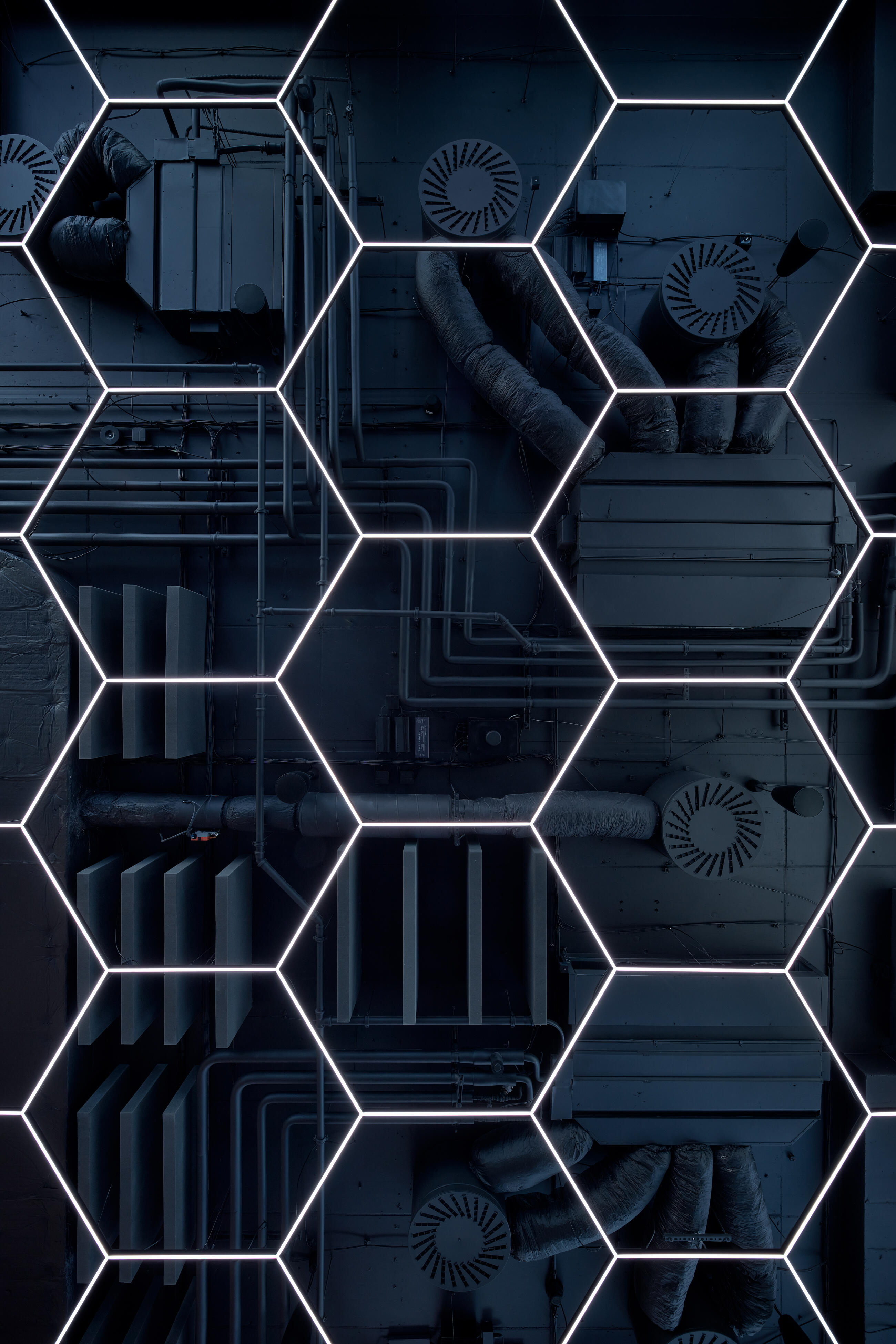 In the design, we looked for the theme of industrialism and tried to bring it to a contemporary feel. The heavy black metal tubular furniture corresponds with the concept of technological wiring. In contrast, the ephemeral changing grid of light chips and sensor systems embodies the direction of industrialism towards the world of software and information.