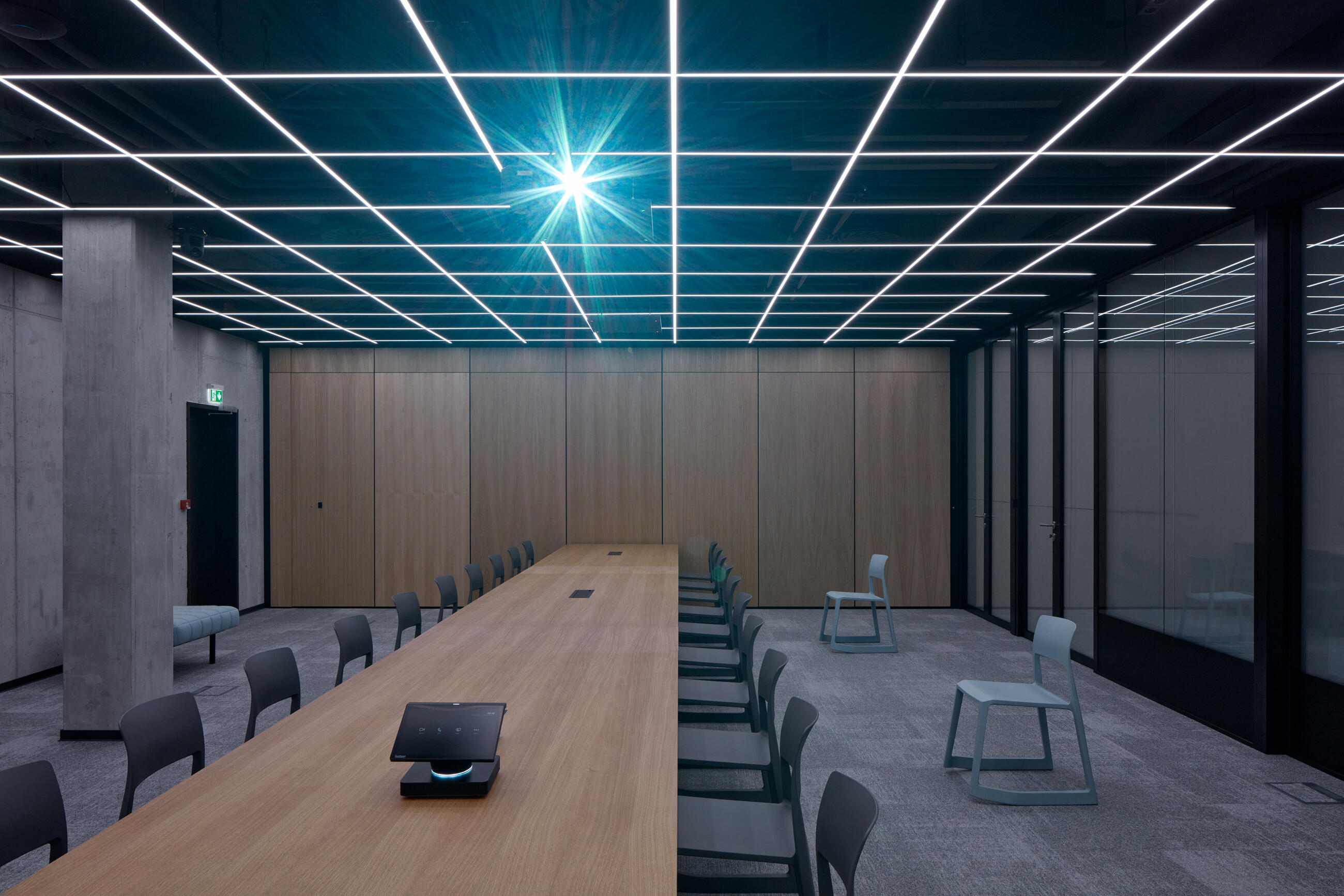 The conference room is equipped with a long table that can be divided into segments. The room itself can be separated by an acoustic sliding partition.