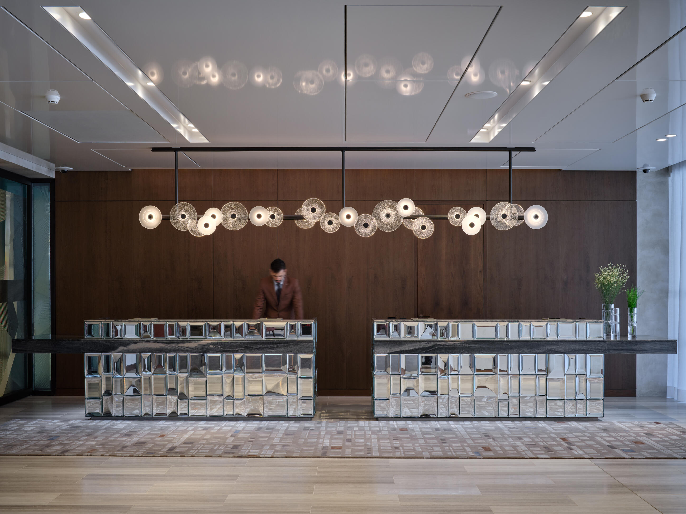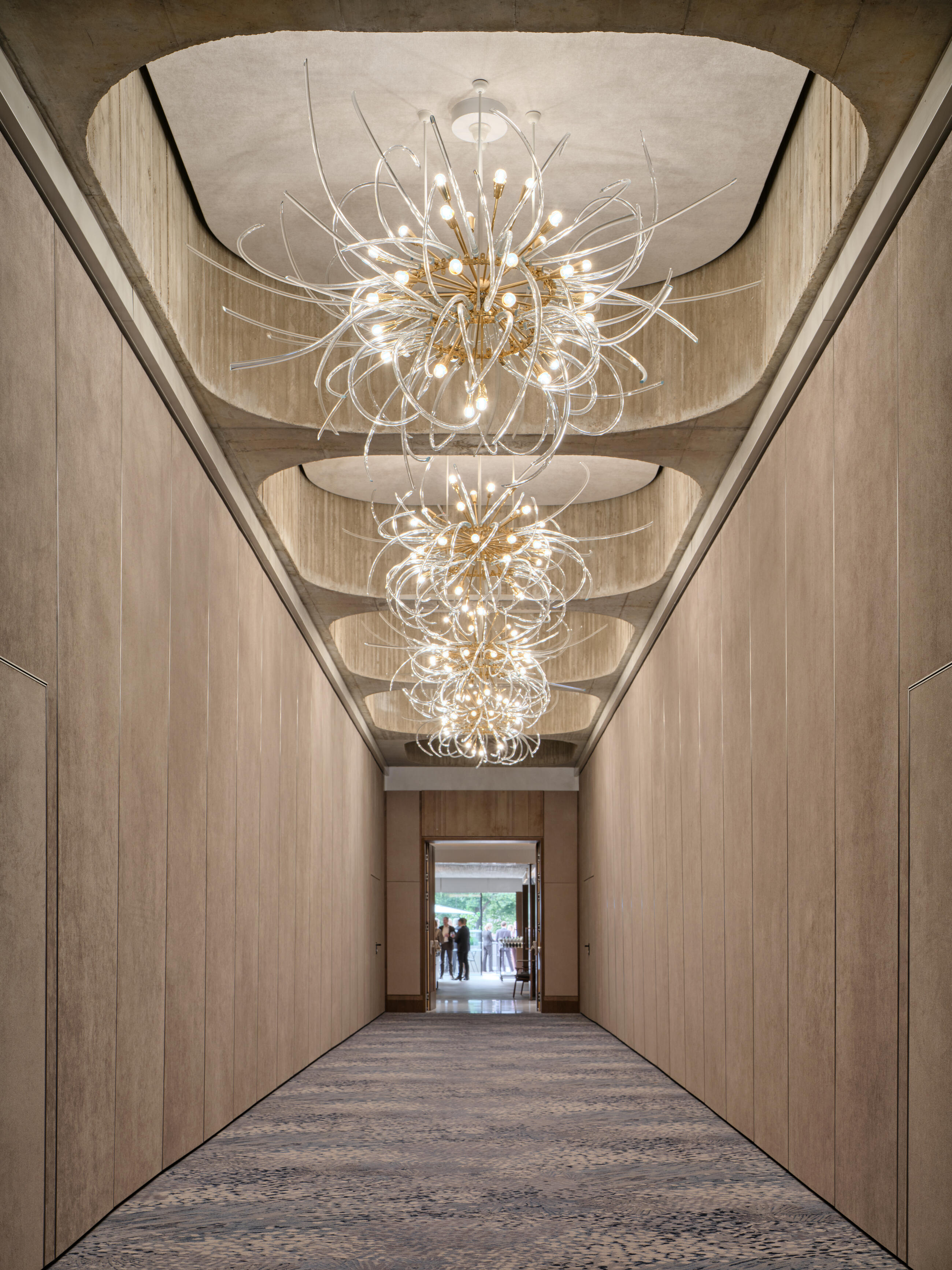 The hotel features chandeliers designed in collaboration with Czech glass brands Bomma and Preciosa. The monumental glass wall House Signs of Prague by Martin Janecký dominates the lobby, while the wellness reception is framed by an 8-meter-long sculpture evoking flowing water—created by Lasvit, Wanda Valihrachová, and TaK Architects.