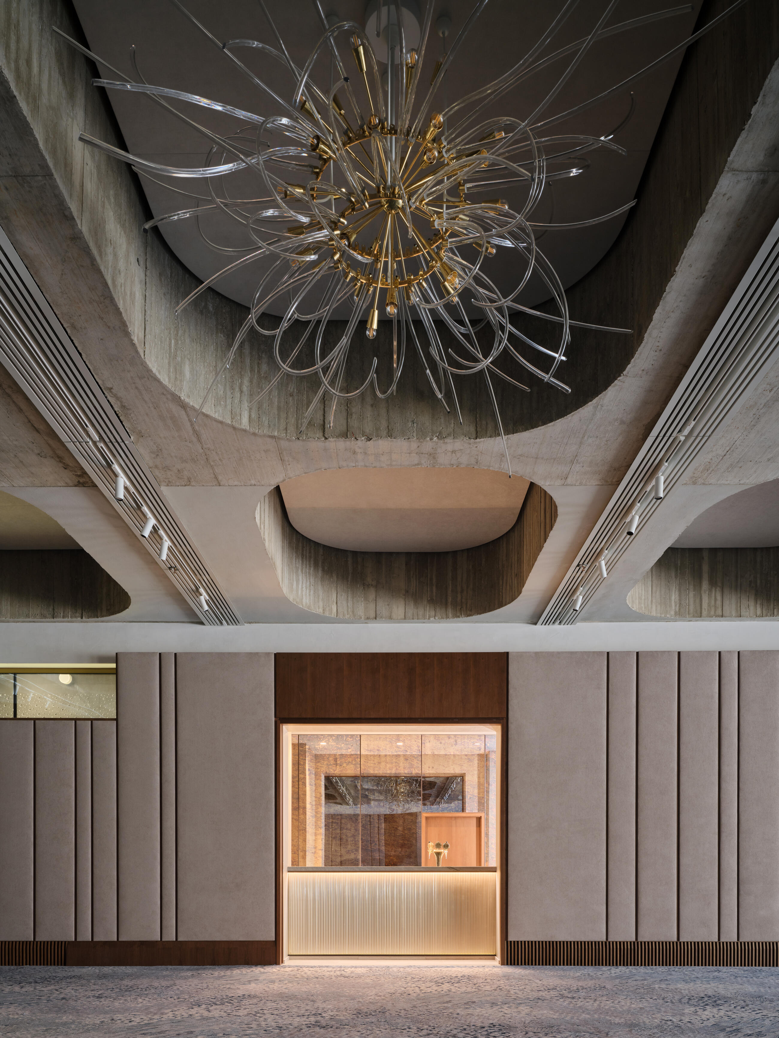Key artworks and architectural features have been carefully restored. The ceramic façade by sculptor Zbyněk Sekal—an icon of the hotel—was recreated, with 48 of the original 52 ceramic strips replaced by newly crafted elements. The hotel’s conference hall ceiling, originally designed by Jan Šrámek and lit by René Roubíček’s chandeliers, was rebuilt to reflect the 1960s dialogue between concrete and glass.