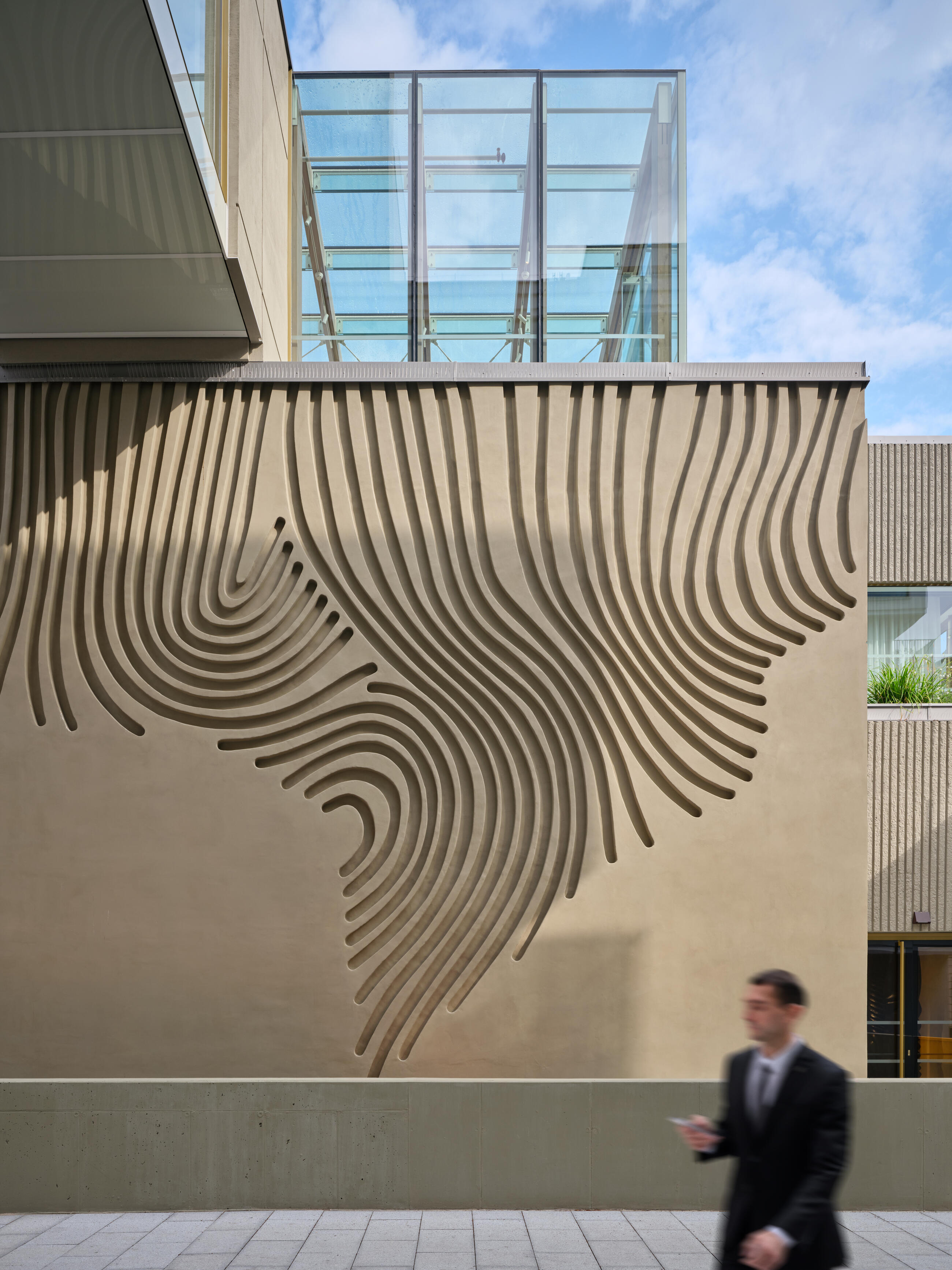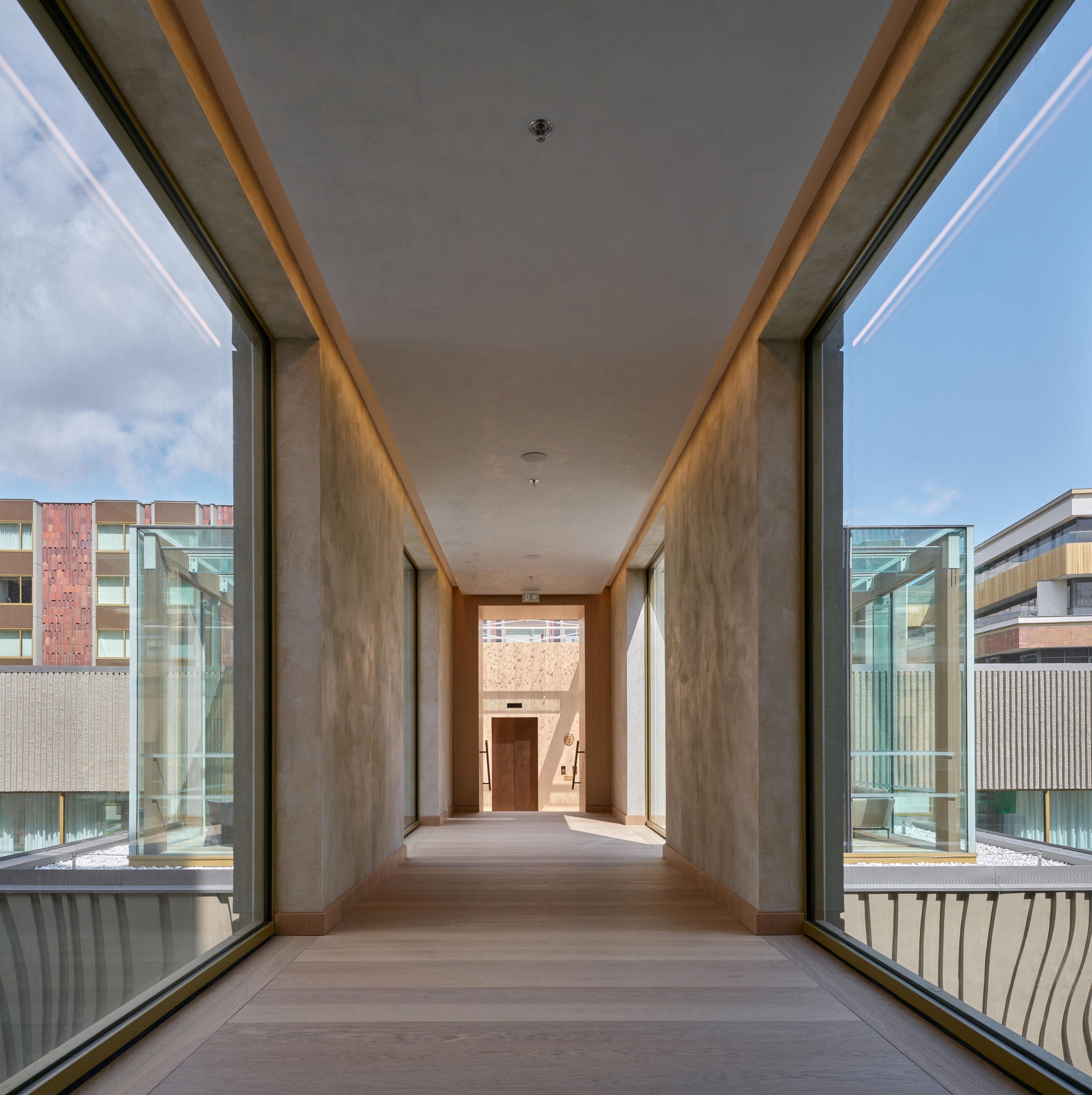 A gallery space—accessible from both the street and riverfront—has been integrated into the hotel’s lower level. This ensures free public access and encourages engagement with the building beyond its role as a hotel. The ground floor now functions as a curated art space, created in collaboration with artists and designers, continuing the building’s original commitment to artistic integration. From the beginning, the architects emphasized that these spaces must remain open and welcoming to the public. Separate entrances support this principle.