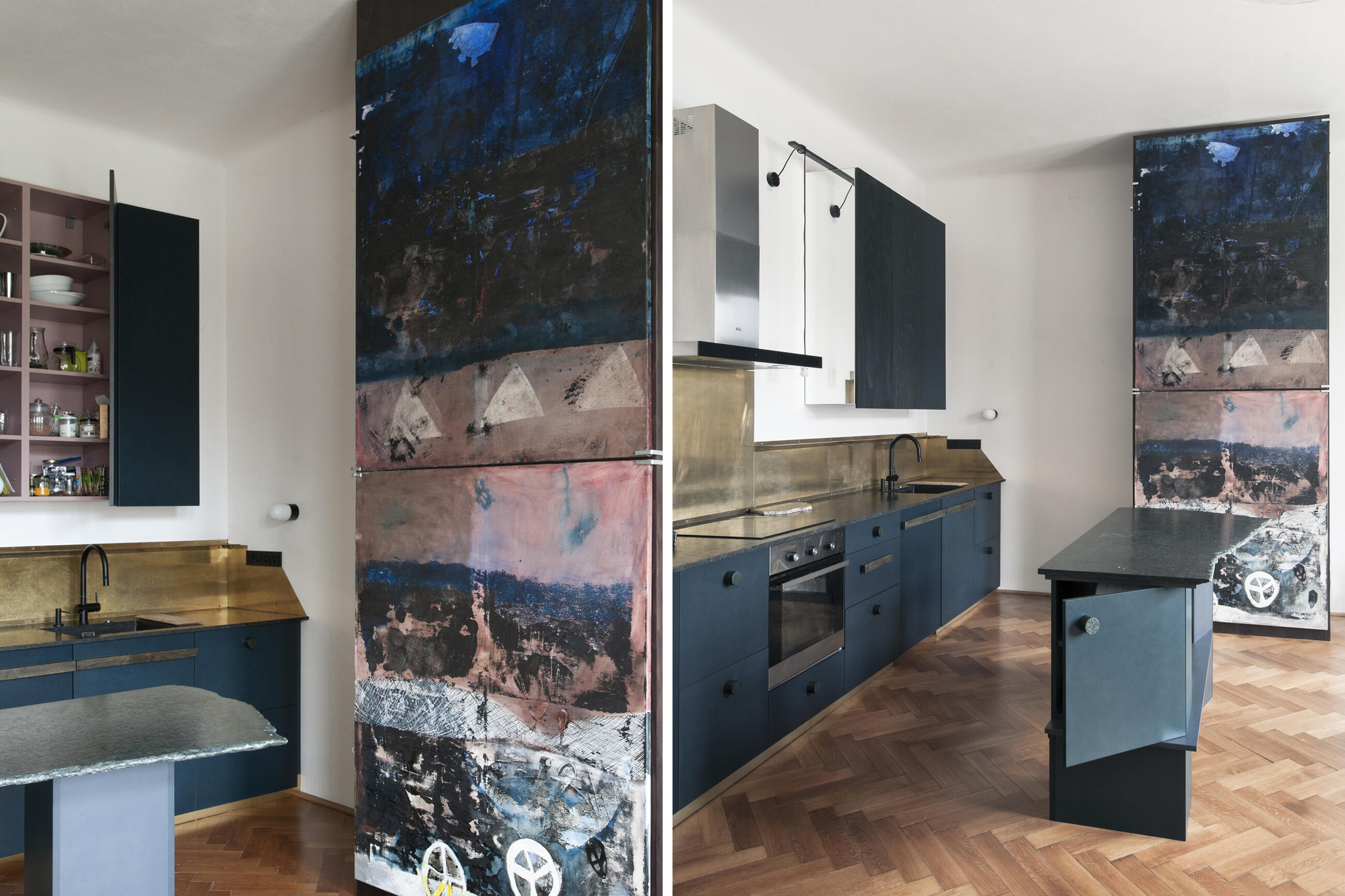 The project brief was to refurbish the interior of one floor of a multi-generational Secession villa and to allocate a separate apartment unit due to the need for a greater degree of privacy for a young couple. The concept of three main passage rooms was retained, which now serve as a living kitchen, the middle room as a study with a library, and two separate dressing rooms. The third room within this enfilade is completed by a bedroom, from which a second bathroom with shower is newly accessible. The latter originally served as a kitchenette, accessible only from the level of the intermediate staircase. The second zone of the apartment is understood and used rather as a more spacious working bathroom with a washing machine and a spare room for a guest or possibly a child.
