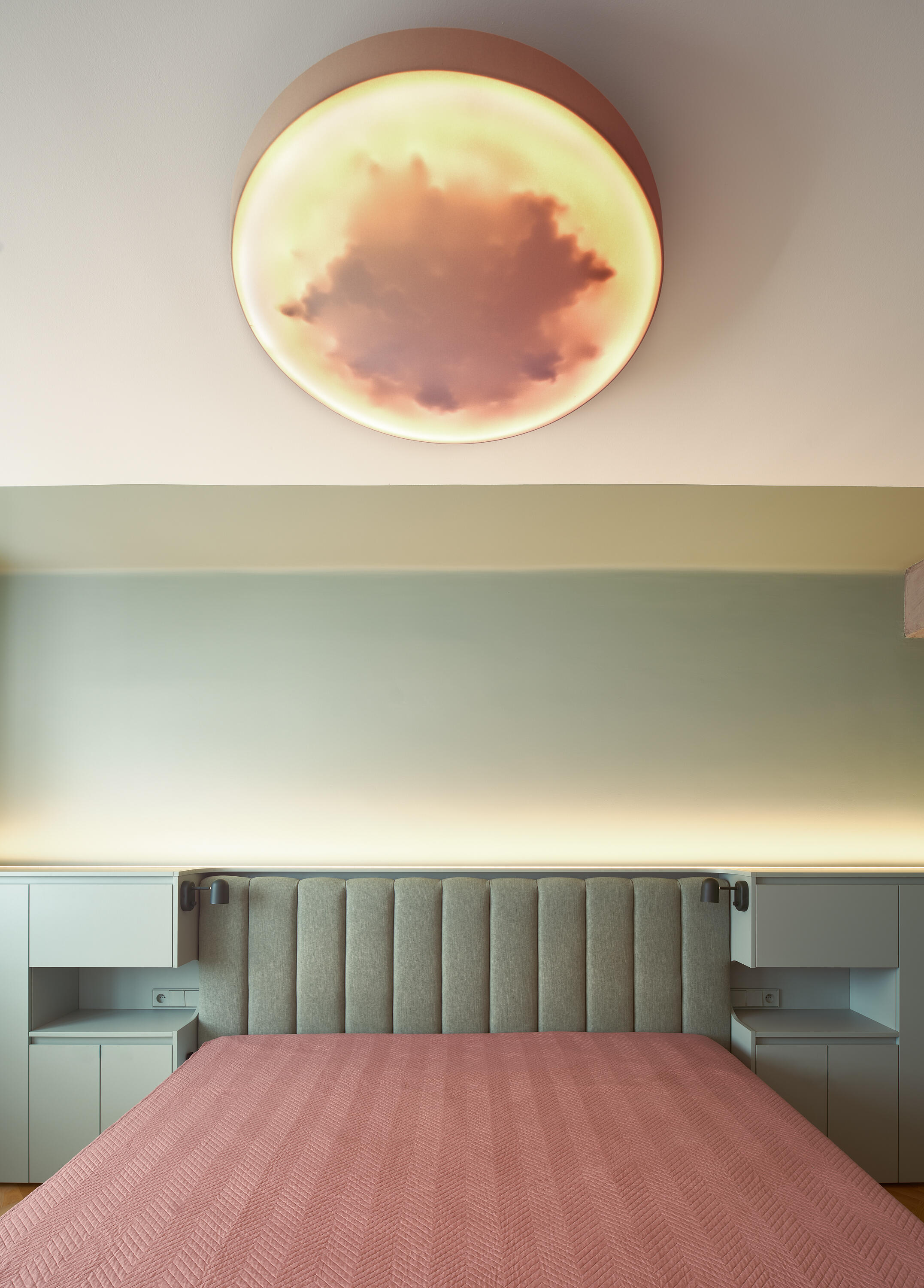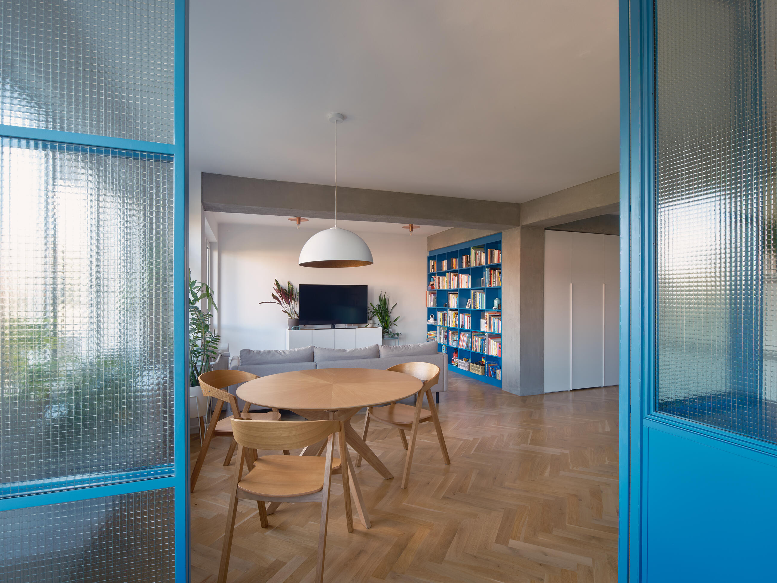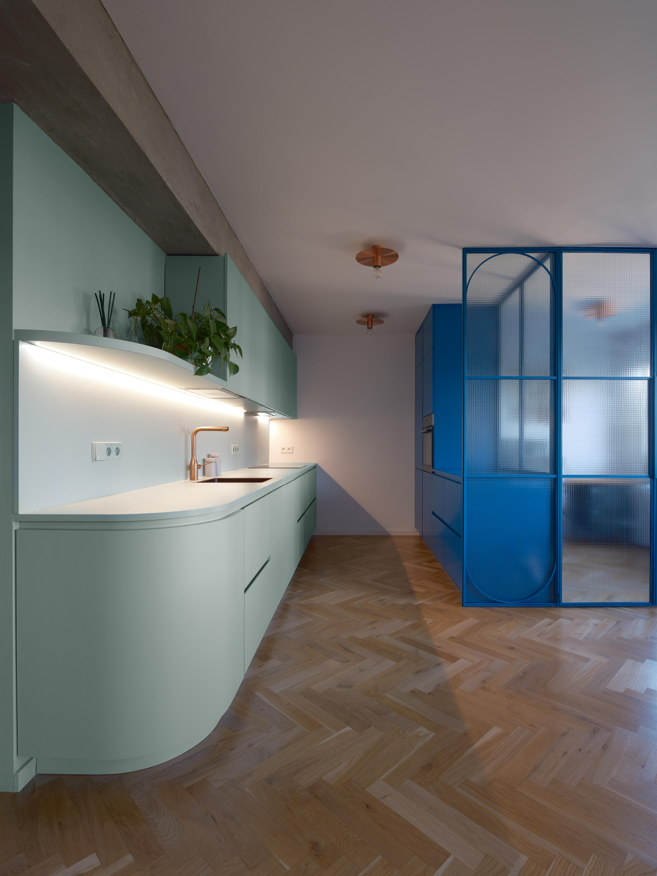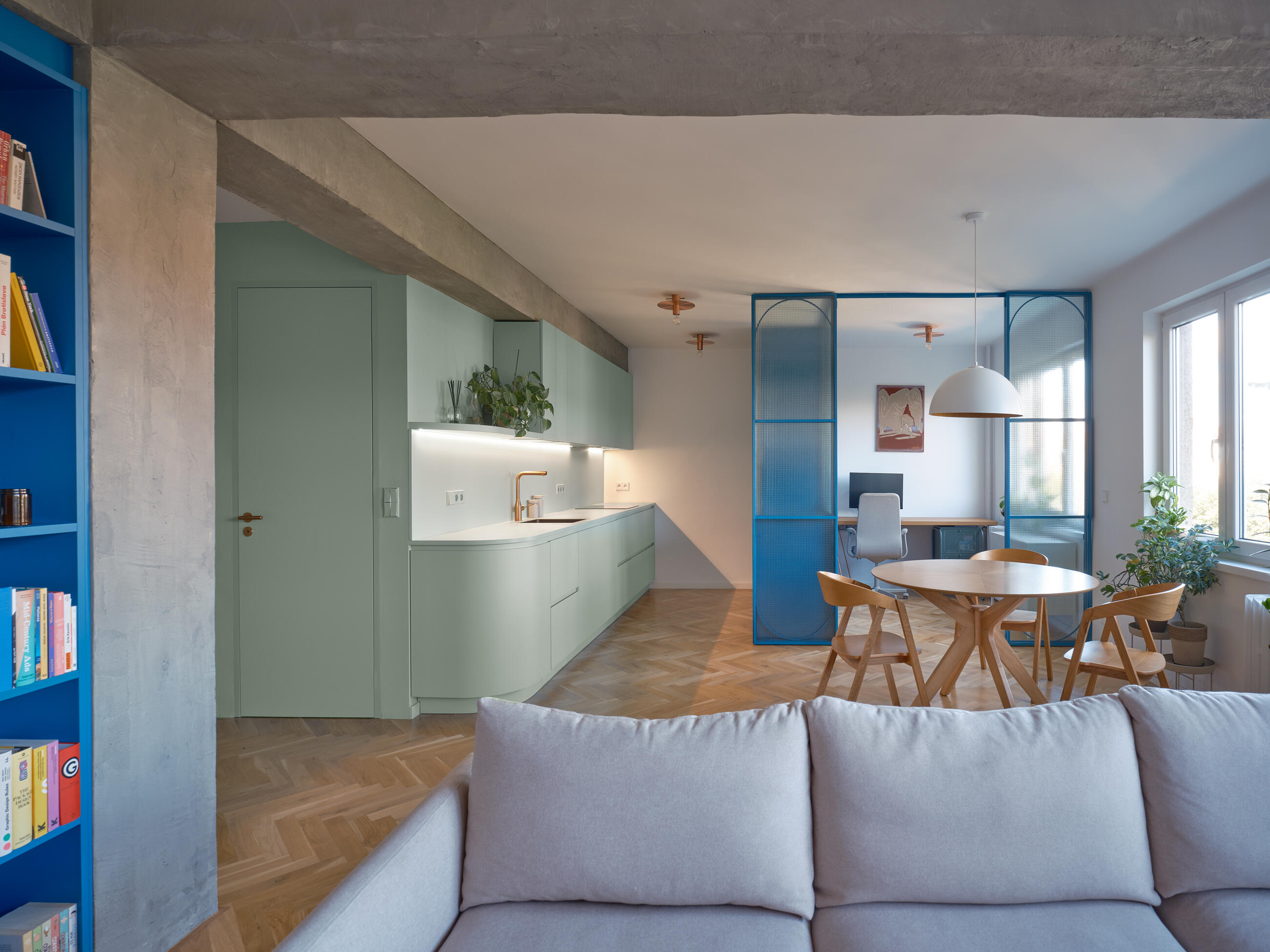 The material palette reflects the character of the building: concrete is complemented by cement finishes, oak flooring, and bold color surfaces. The apartment’s color scheme is based on three tones – green, blue, and pink – harmoniously combined to enrich the atmosphere. These tones are complemented by copper details, appearing in fittings, door handles, and bespoke lighting fixtures, which add a refined and distinctive touch. The original concrete beams, which did not match the clients’ vision, were unified with a cement screed, making them appear more subtle and visually lifting the low ceilings.