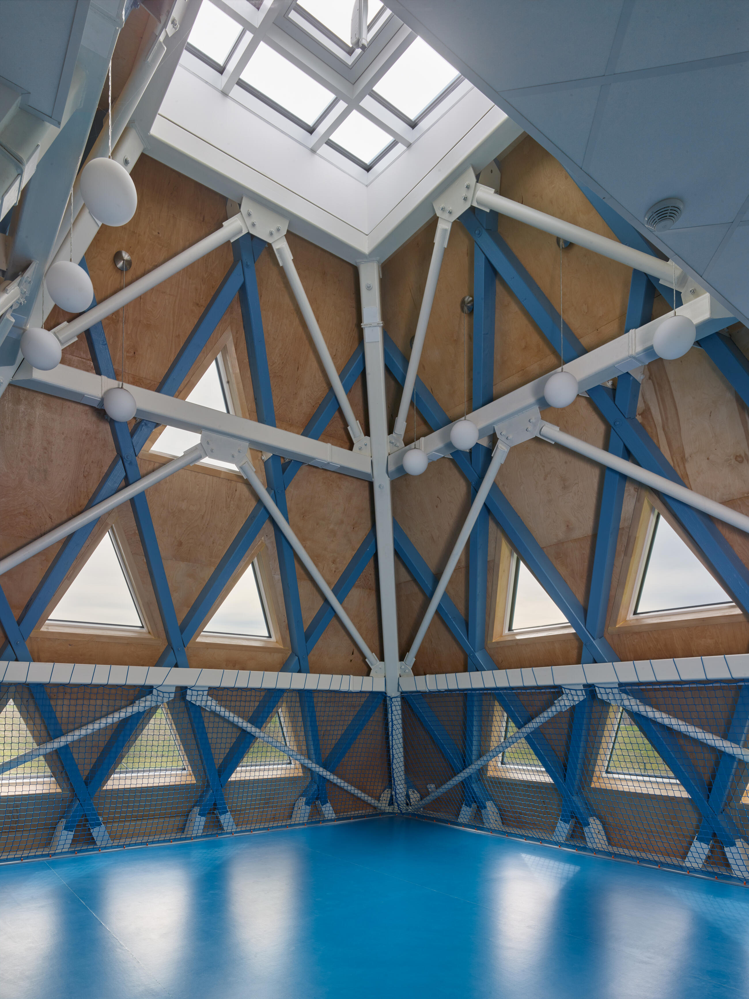 We divided the mass into several parts. A cube in which there are facilities, offices, entrances... everything necessary for practical functioning. Individual classrooms are then connected to this, which are no longer rectangular and connect to the garden. They are free-form worlds to play with. The pagodas form the silhouette of the house and from the inside, a hiding place, an Indian tee-pee, a space where the light falls from triangular windows, visible wooden structures like tree branches. In the entrance atrium, there is a spider web, a play area accessible from all classrooms, a rope center right in the building. We hope it will be used and the children will swing and fly. The net is carried by tree trunks that have been thanked for their service. The atrium also serves as a community space, for singing, acting, exhibitions, and theater.