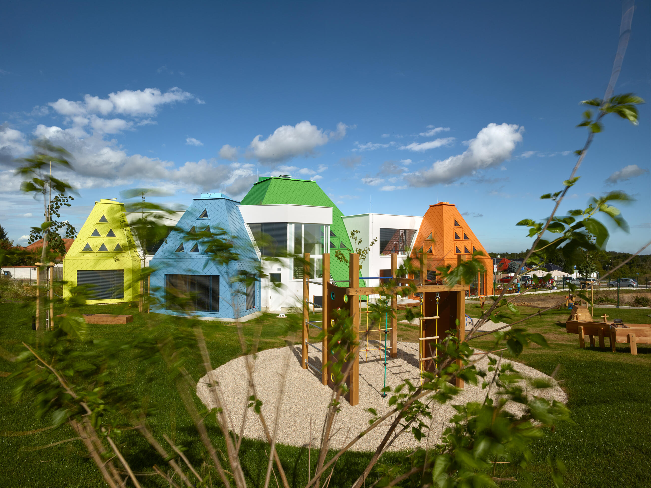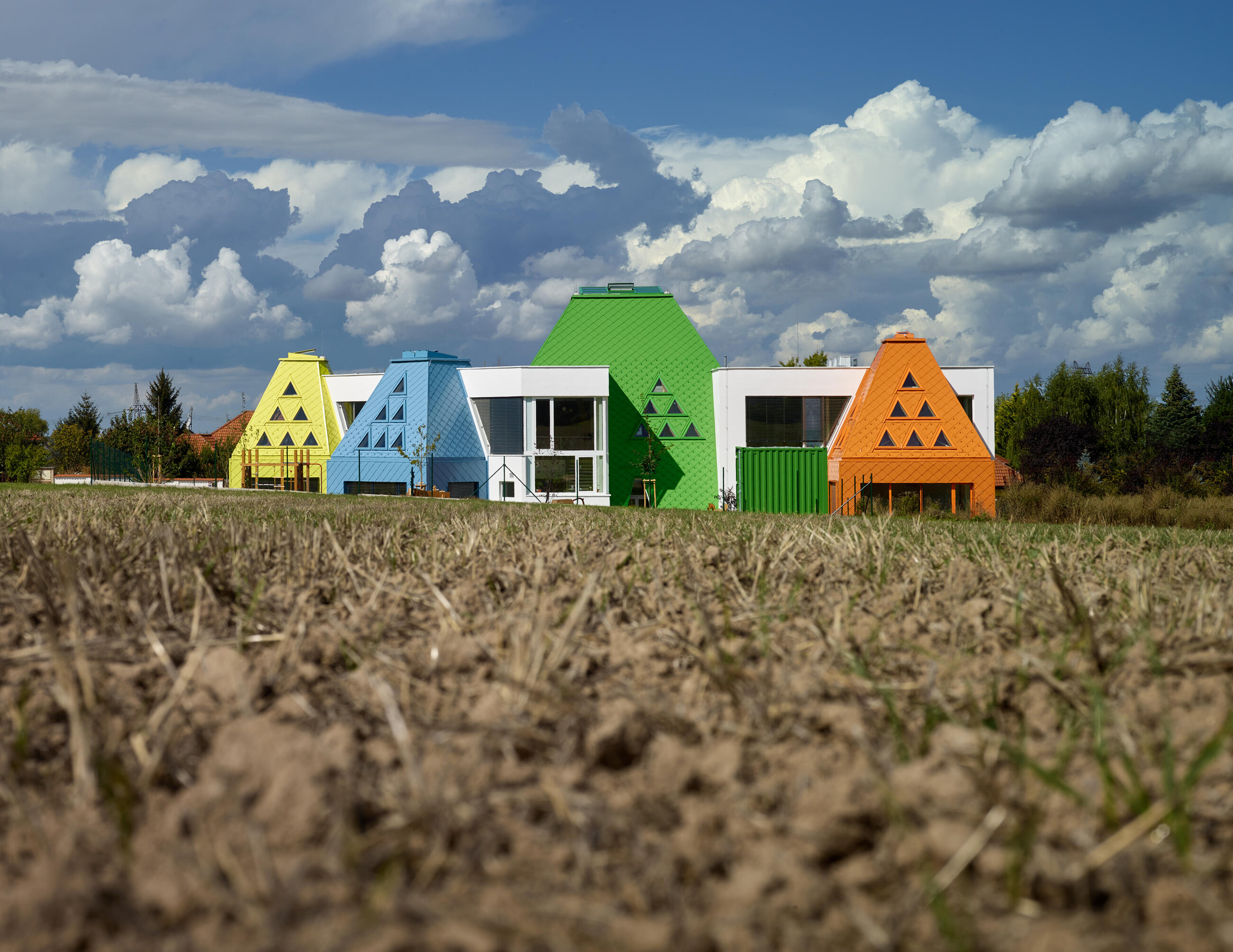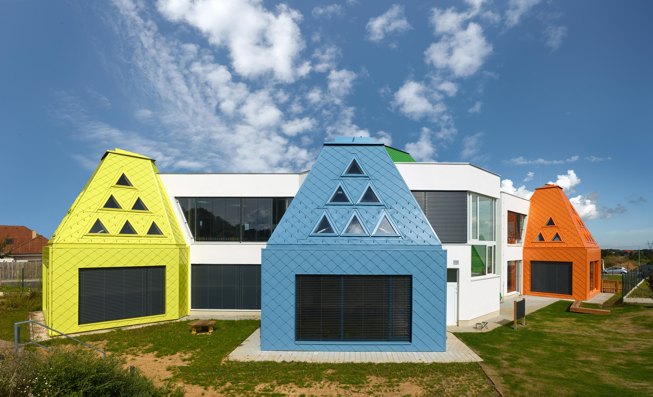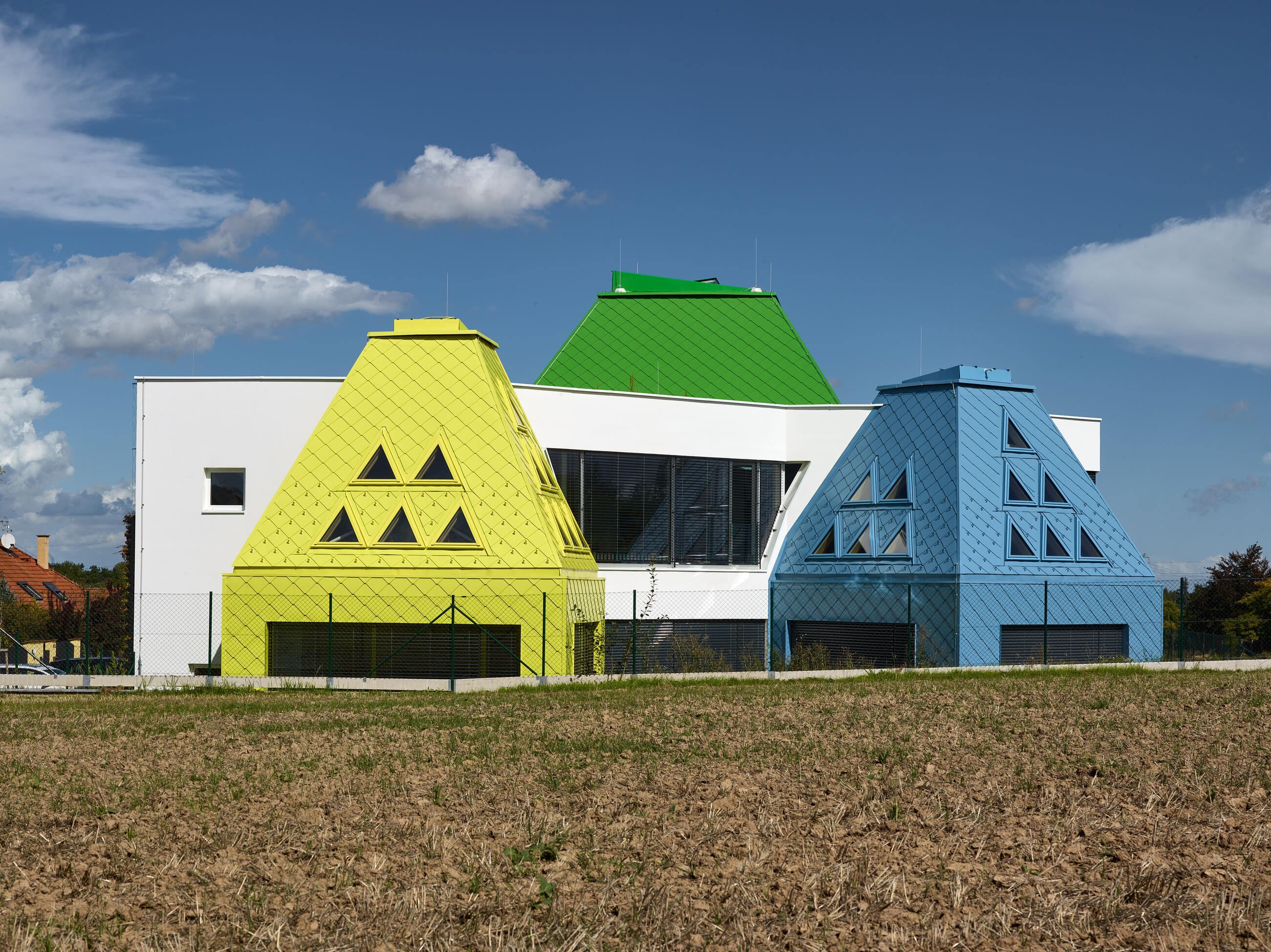 The nursery school has two faces, it holds a picture of the street, it is playful in the garden, it does not function like a traditional house here. Here it shakes, matter breaks up and space opens up for the Sun to penetrate. The main entrance is from the street, with two classrooms on the ground floor, and two upstairs. The street facade of the kindergarten is partially designed as vertical greenery, we hope that it will sweep and thicken to one day absorb the entire facade. The entrance is supposed to resemble the entrance to a mysterious temple or spaceship. The management of the technical infrastructure is partially visual, letting the child see where the water, electricity, and air flow. The colors are cheerful, they should also illuminate the surroundings.