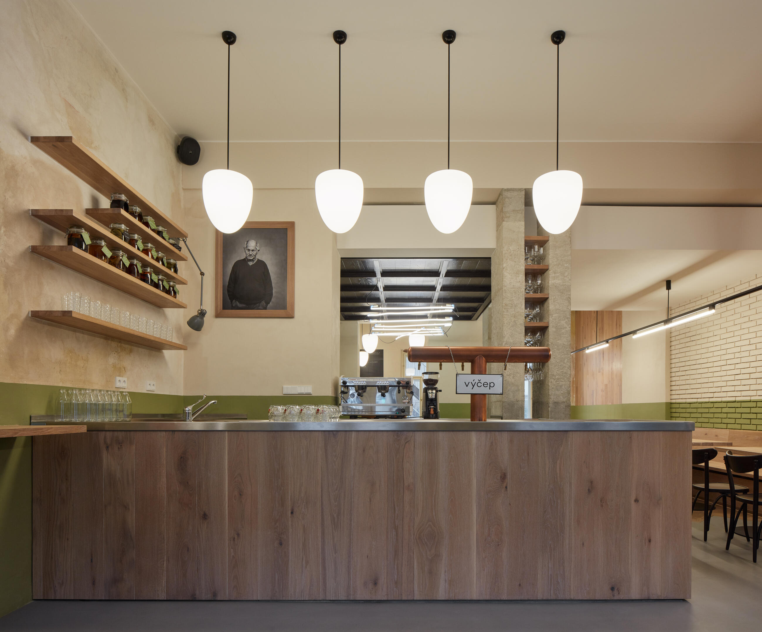 The Výčep restaurant is situated in a tenement house in Prague's Vinohrady. Our aim was to design a traditional Czech pub with a traditional Czech beer and cuisine, but interpreted in the 21st century. We attempted to define typical features of a Czech pub at the beginning of the 20th century and apply them in a contemporary interior. Its setting stone is the "BEER BAR", which welcomes the visitor straight upon entering. There must be a place at the bar for drinking beer while standing and of course a true larger on tap. Here it is the Dalešice beer from the recently renovated historic brewery. Wooden wall panelling used to be a common interior feature, protecting walls from being damaged, as well as parquet floors. As a reference to the wall panelling, the interior uses a green washable paint strip, which winds through the entire space and connects all the walls, which use completely different materials. Oak friezes on the floor are laid in the traditional herringbone pattern. The furniture combines atypical wooden benches and tables and typical TON Banana pub chairs in dark brown. A lounge is every proper pub's essential part and we couldn't therefore miss it out in Výčep. There are TON 33 armchairs and a wooden coffered ceiling with a neon light fitting by Vojtěch Kálecký. Vojtěch has also designed the line lights above the tables that stretch from the entrance across the whole restaurant. Other light fittings are glass and of traditional shapes from the Czech manufacturer Osmont. The whole beer bar is being overseen by Bohumil Hrabal who is connected with the Dalešice Brewery through his film Postřižiny (Cutting It Short).
