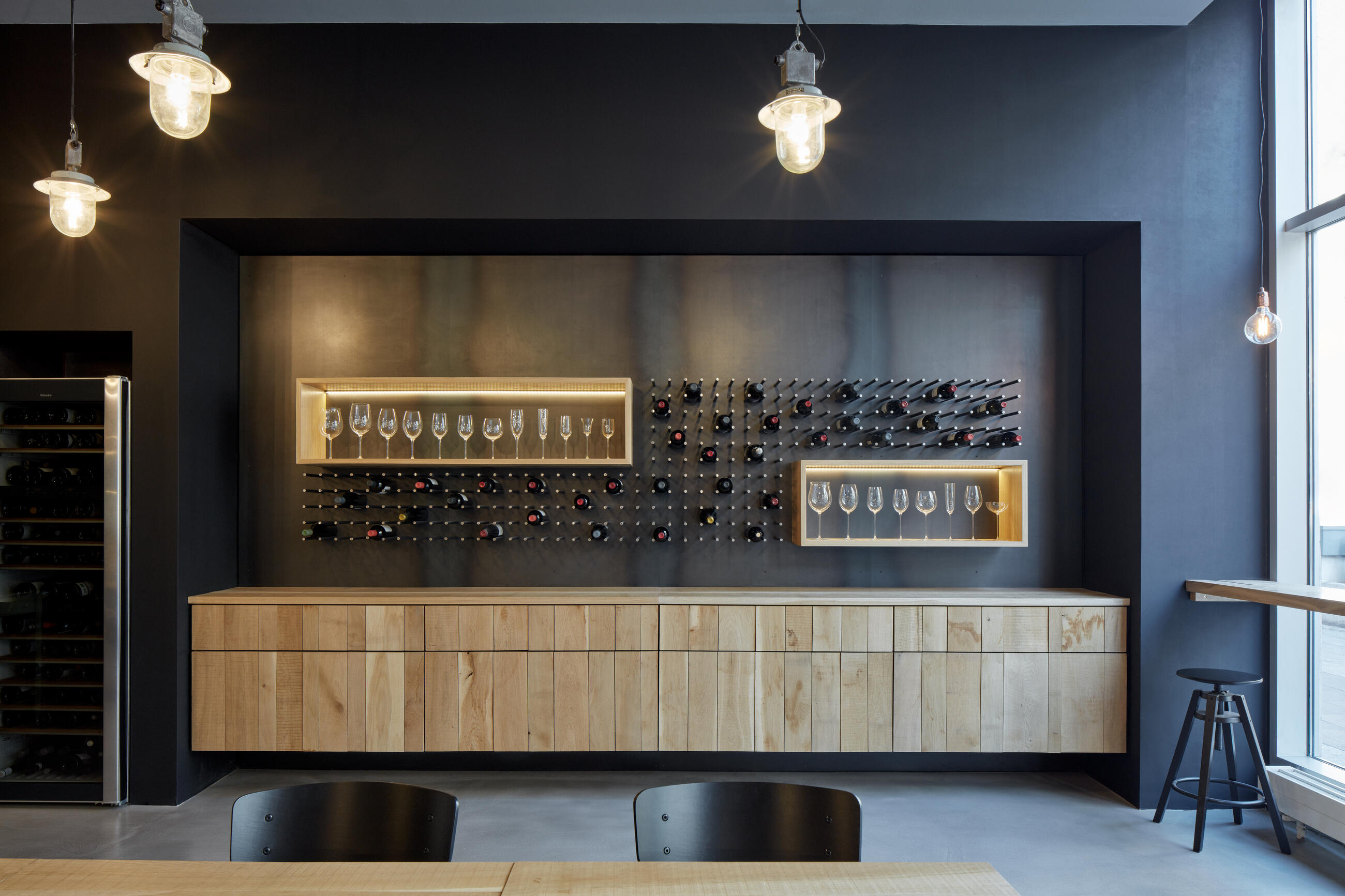 Wine Glass Shop RIEDEL is located in the very center of Prague, Na Příkopě street. The shop has excellent RIEDEL wine glass in its range of products. The task was to create an environment that will excel in the purity and beauty of the glass. Therefore, the materials are used in their original form, i.e. coarse and "imperfect", which are in contrast to the perfect glass. Wall covering is made of oak wood, the niches with exposed glass are made of natural black sheet, the floor is concrete. The entire interior is complemented by a wall made of steel pins, where selected wines are placed and the entire space is dominated by a steel wall with a built-in wines. The area is illuminated by industrial lights that enhance the atmosphere. The shop is very often used for wine tasting.